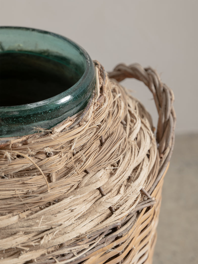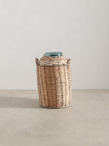 A traditional handblown glass vessel encased in woven cane, once used to store wine or oil along the Balearic coast. The thick green-tinted glass and timeworn weave carry the marks of its origin - functional craftsmanship shaped by Mediterranean life. Beautiful as a sculptural accent or repurposed as a vase or display piece, it speaks to the quiet beauty of honest materials and heritage craft.