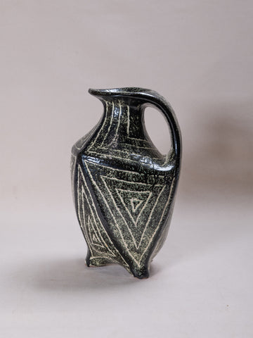 Striking geometric carvings define this large Hungarian ceramic vessel from the 1960s. Its bold triangular motifs and deep green-black glaze create a powerful graphic presence, while the organic curves of the form soften its Brutalist edge. Both utilitarian and sculptural, the vessel speaks to the era’s modernist experimentation with shape and surface.