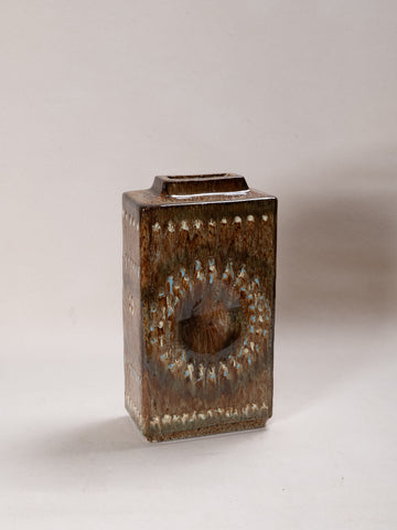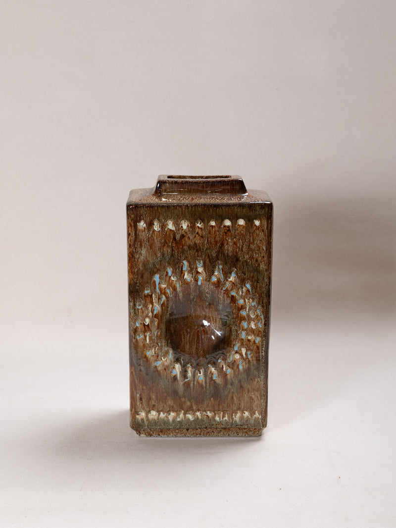 Defined by bold angular forms and richly textured surfaces, these glazed ceramic vessels reveal a dynamic interplay of earthy tones, deep blues, and expressive carved motifs. Their sculptural presence balances function with artistry, embodying the modernist spirit of mid-century ceramic design.