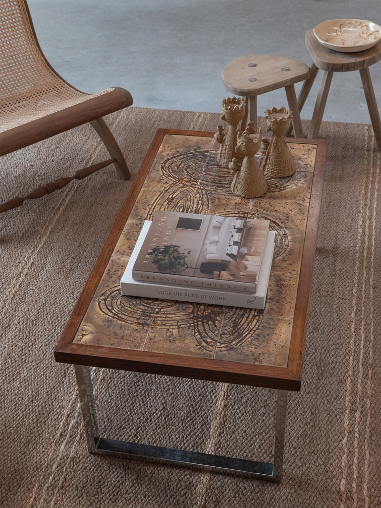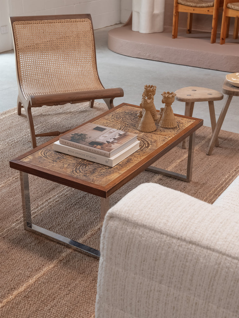 Wooden and ceramic coffee table by Jean D’Asti, created in Vallauris, France during the 1960s. The tiled surface features an abstract, hand-enameled design in earthy tones of beige, brown, and black — characteristic of D’Asti’s rustic yet sophisticated style. Resting on a solid wood frame with polished metal legs, the piece captures the spirit of the French Riviera’s ceramic movement, where art and function meet in perfect balance.