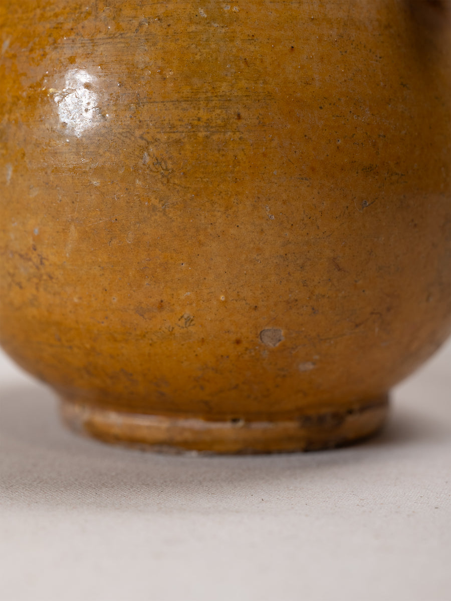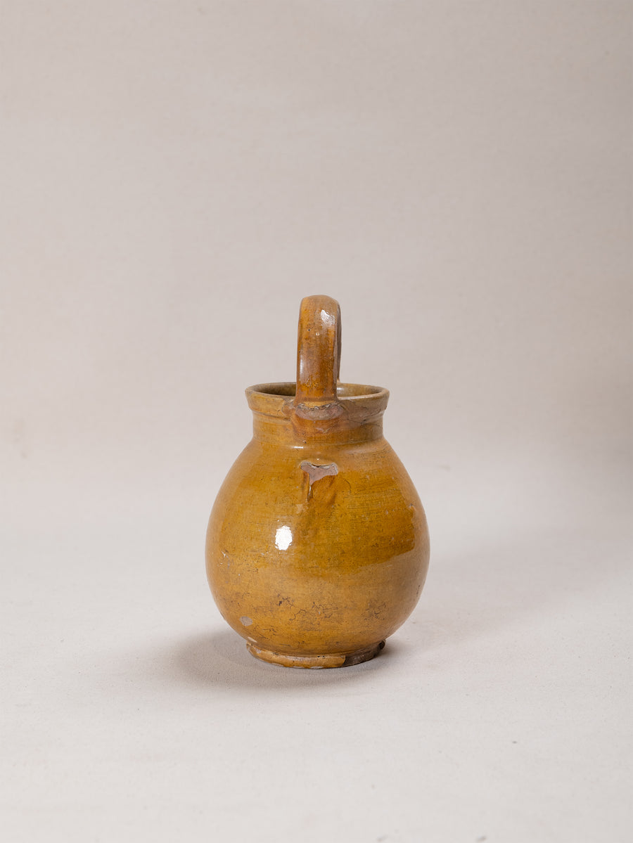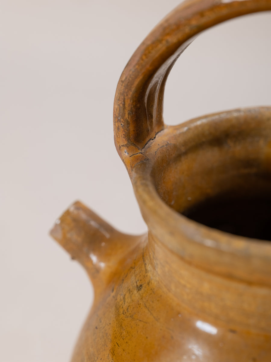 Vintage French terracotta pitcher with a warm golden glaze and a curved handle. Once used in the south of France for pouring water or wine, its form reflects traditional Provençal craftsmanship — both functional and sculptural. The softly aged surface and irregular glaze give it a timeless patina, making it a beautiful decorative accent with rustic charm.