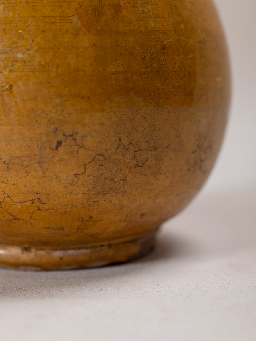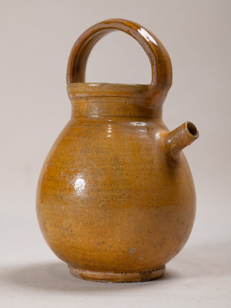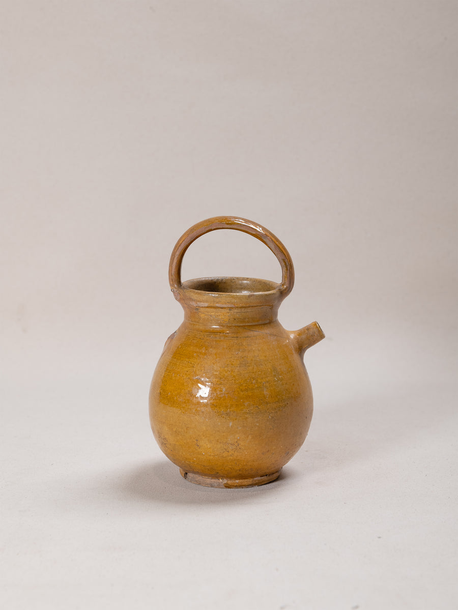 Vintage French terracotta pitcher with a warm golden glaze and a curved handle. Once used in the south of France for pouring water or wine, its form reflects traditional Provençal craftsmanship — both functional and sculptural. The softly aged surface and irregular glaze give it a timeless patina, making it a beautiful decorative accent with rustic charm.