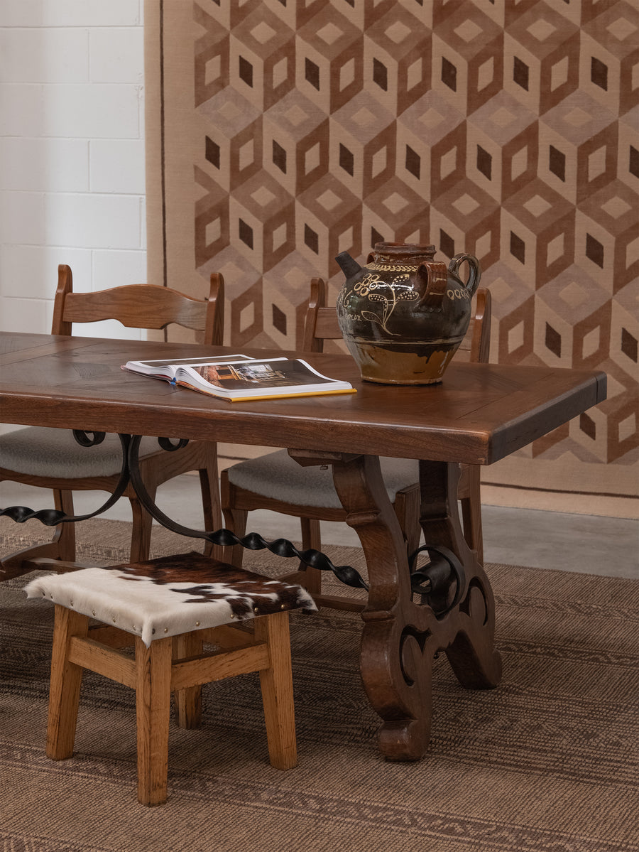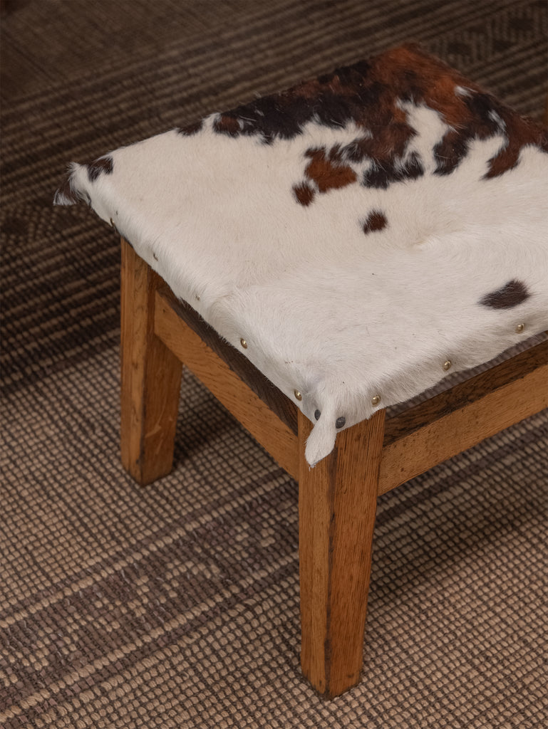 Anchored in simplicity, this 1950s timber stool is defined by its minimal form and natural cowhide seat. The smooth, timeworn timber reveals a rich patina, while the hide adds subtle texture and depth. Together they speak to the quiet refinement of mid-century craft - functional, tactile, and enduring.