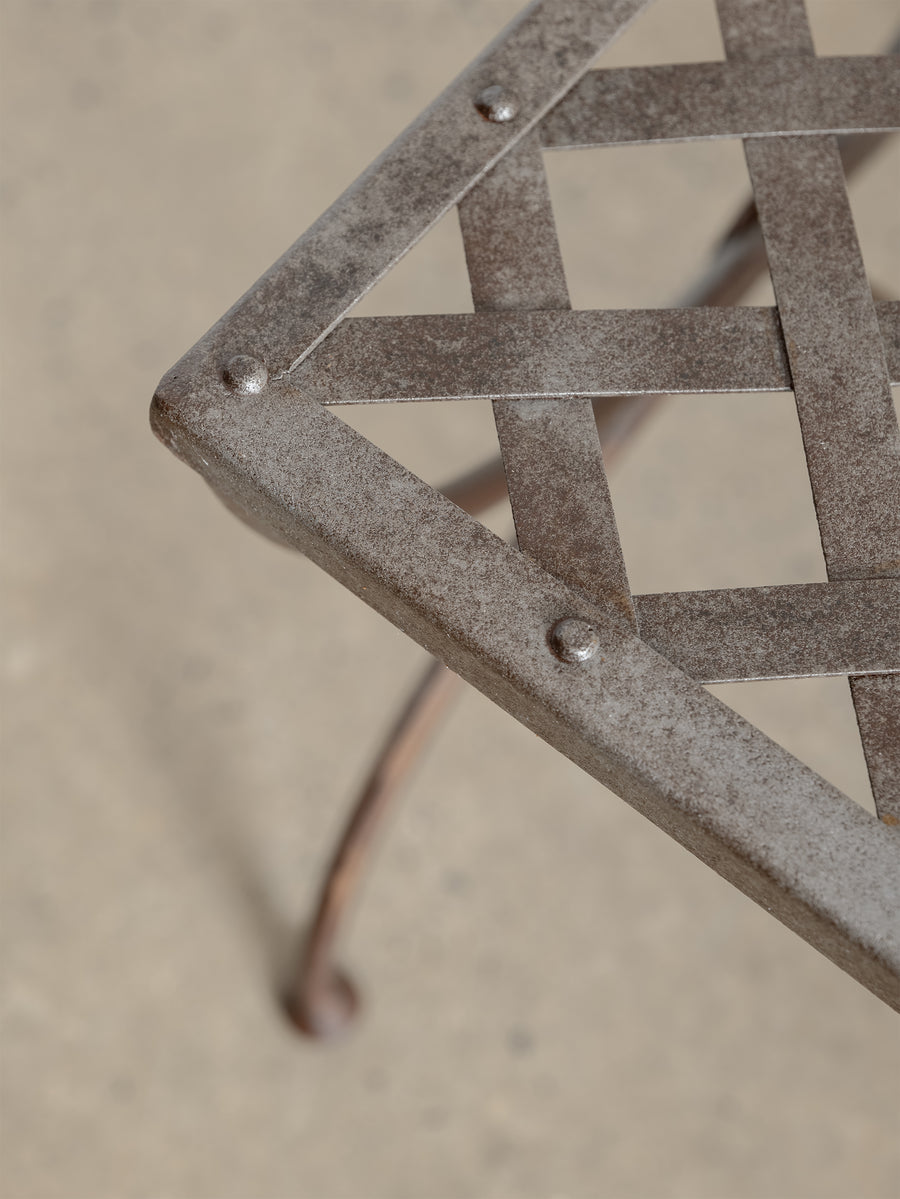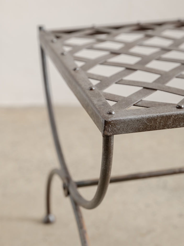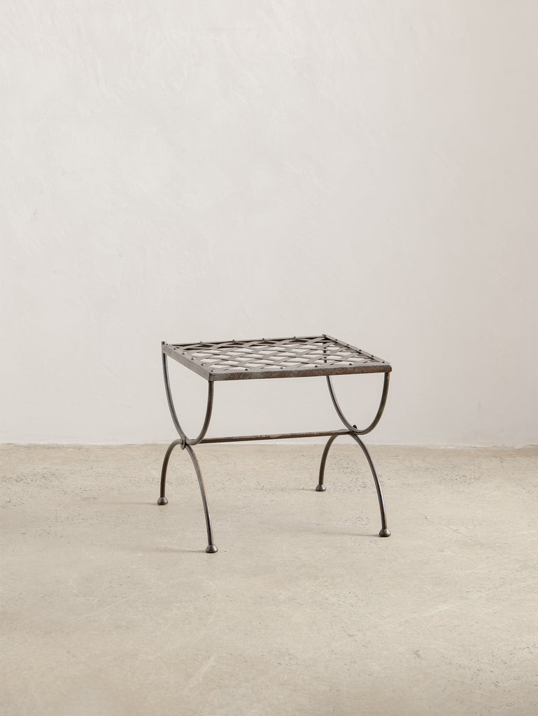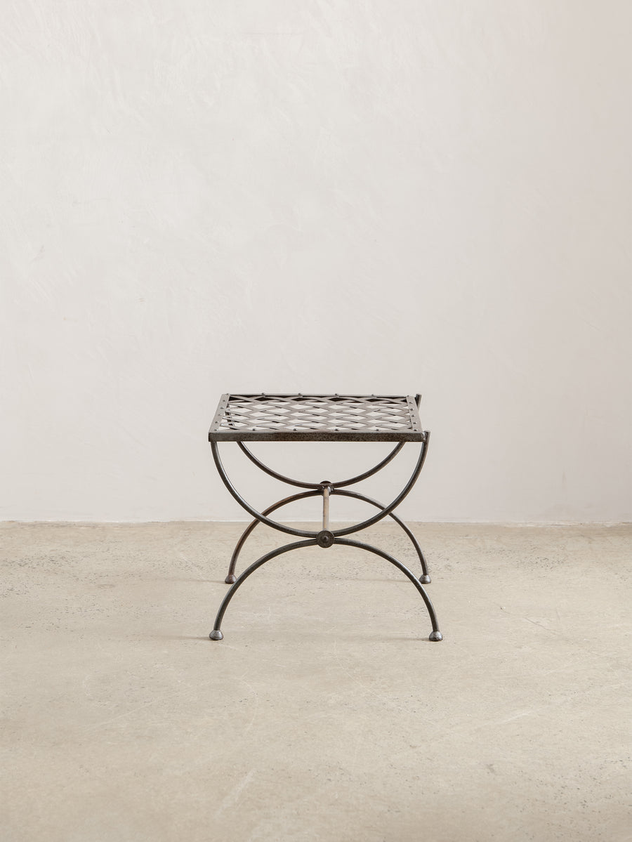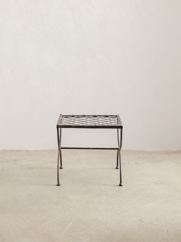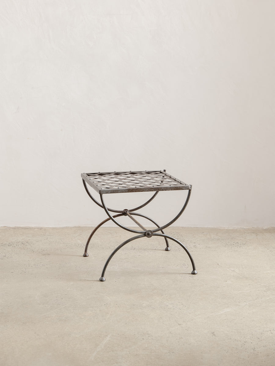 A sculptural 1960s iron side table, defined by its woven lattice top and gently arched supports. Light in form yet strong in structure, it carries the quiet presence of hand-forged craftsmanship and the patina of time.
