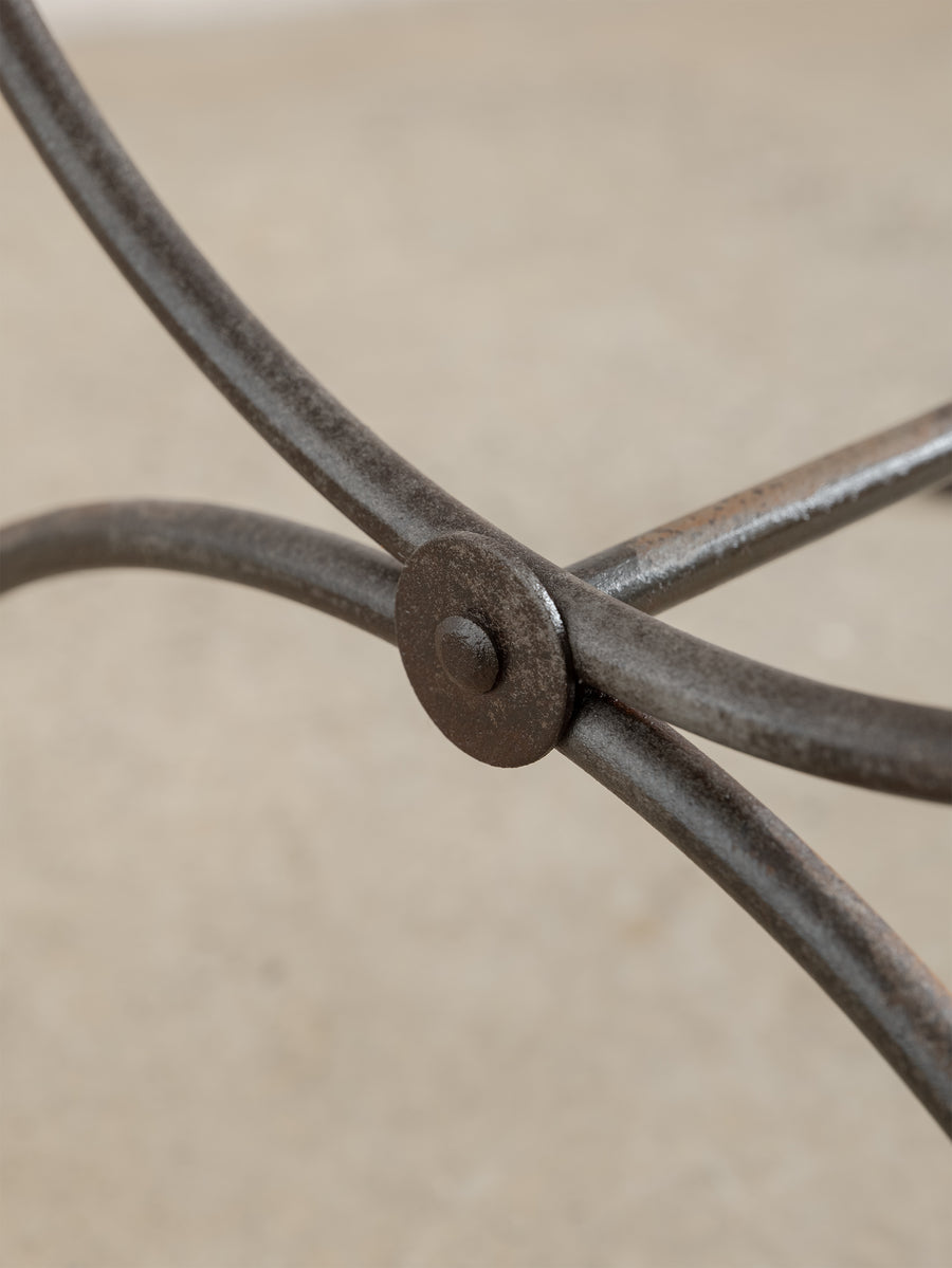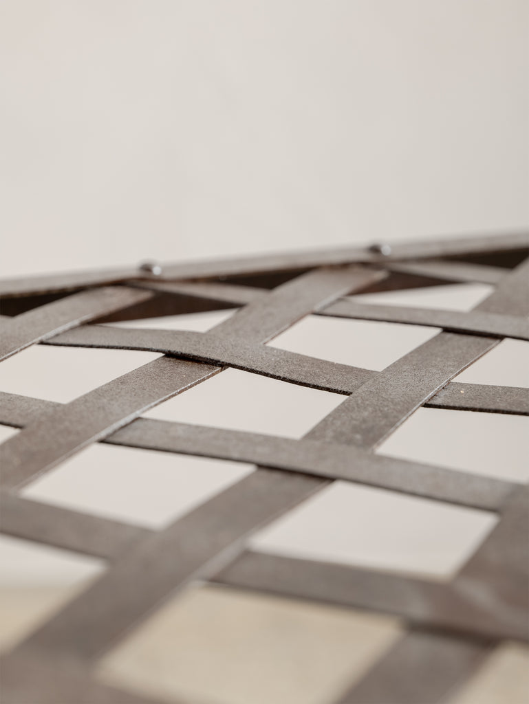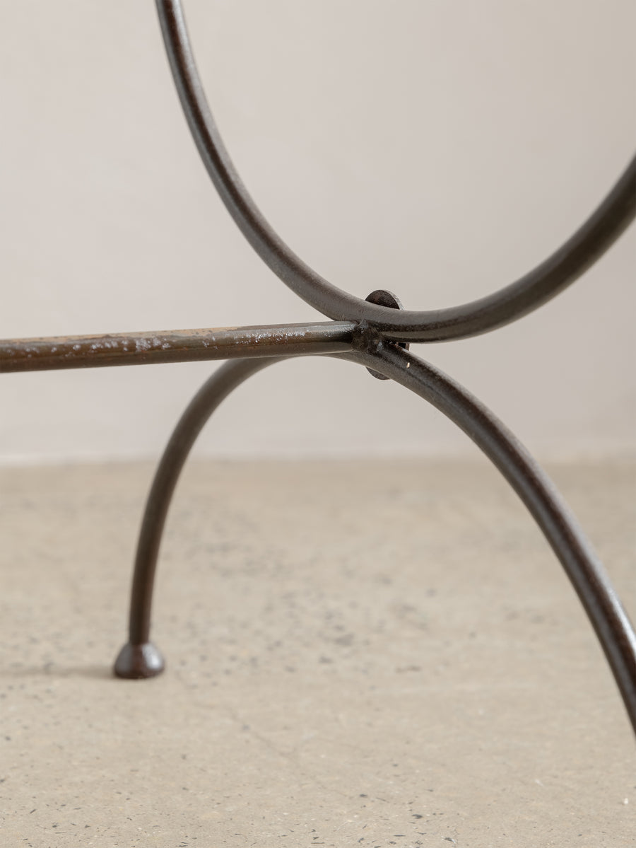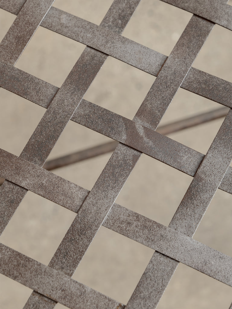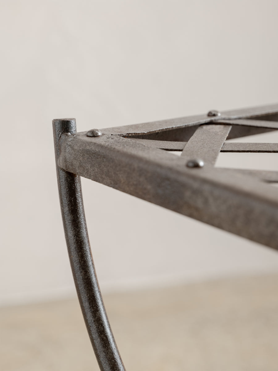 A sculptural 1960s iron side table, defined by its woven lattice top and gently arched supports. Light in form yet strong in structure, it carries the quiet presence of hand-forged craftsmanship and the patina of time.