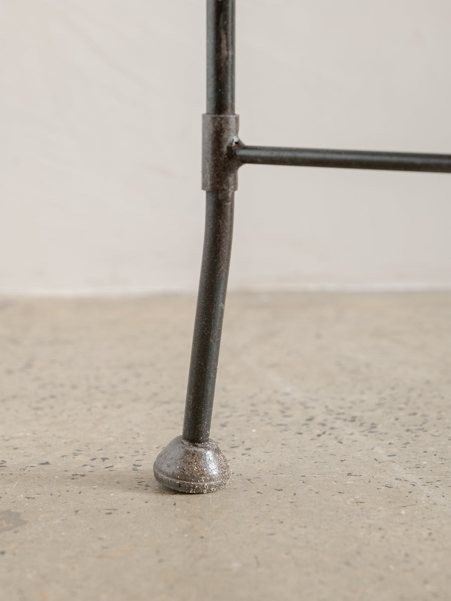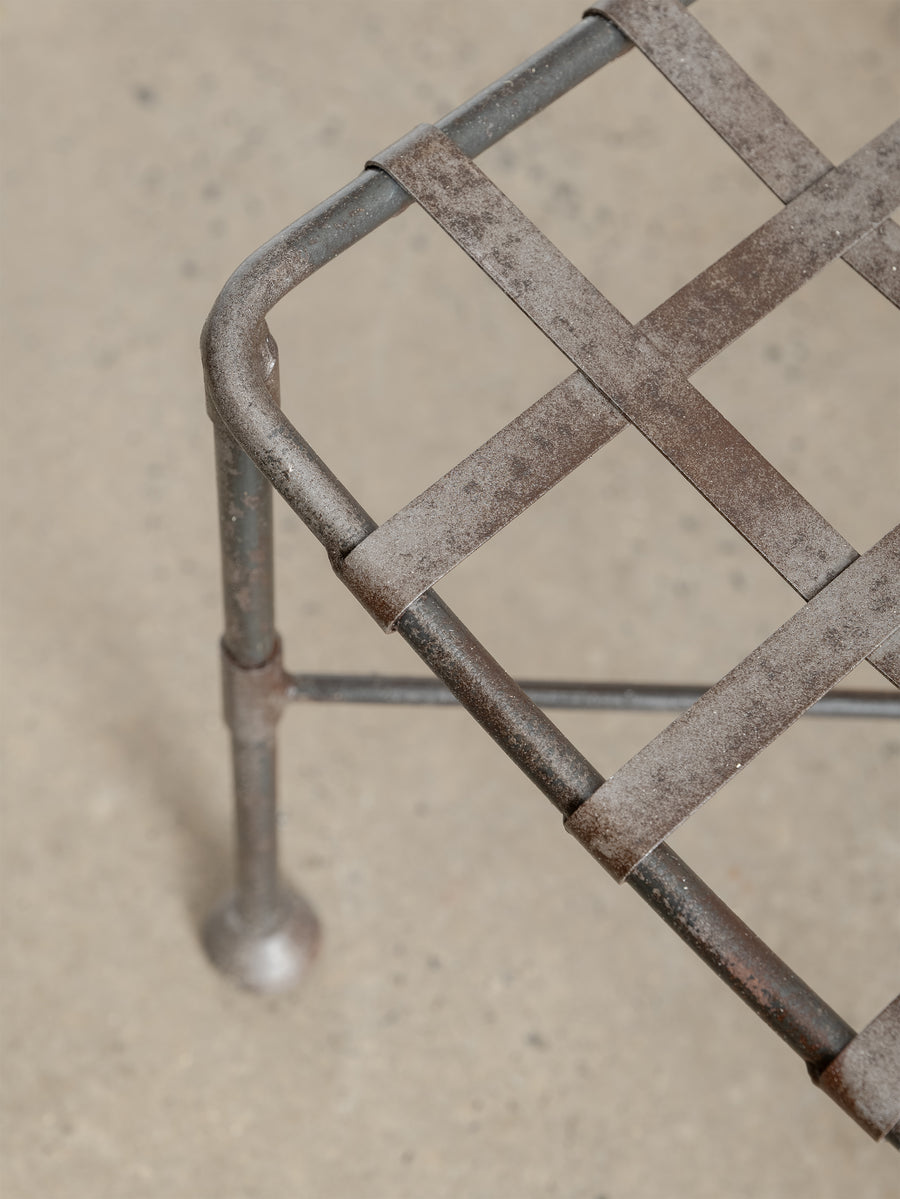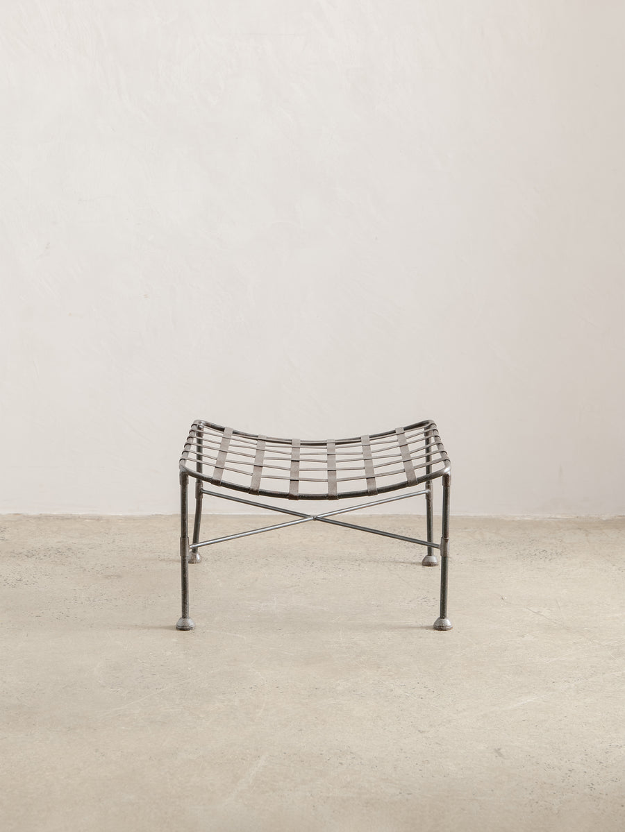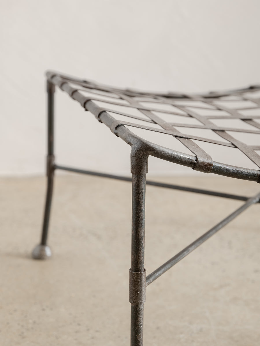 A sculptural iron stool from the 1960s, with a gently curved woven-metal top and finely detailed legs. Light in form yet strong in structure, it carries the quiet presence of hand-forged craftsmanship and the patina of time.