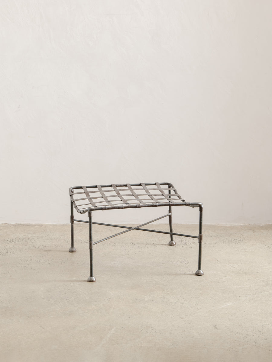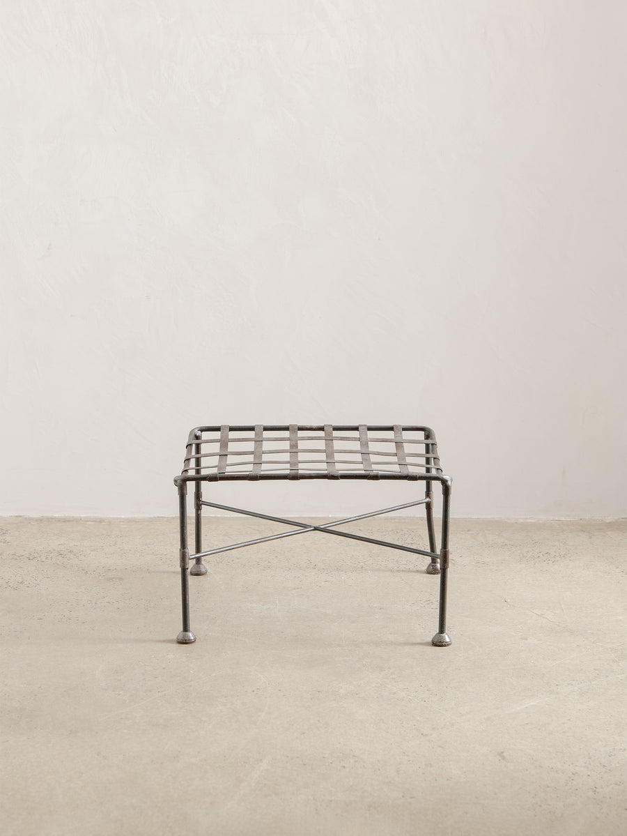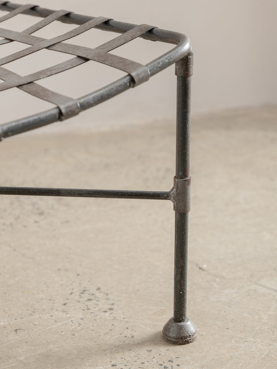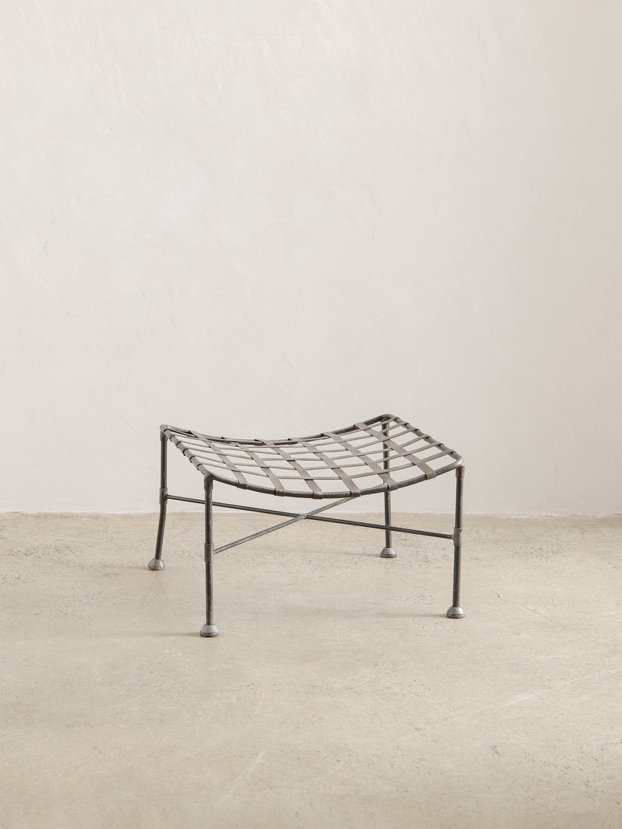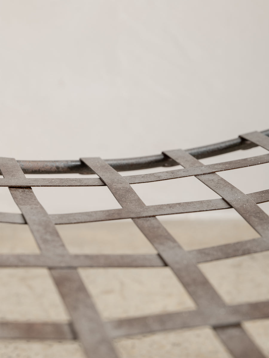 A sculptural iron stool from the 1960s, with a gently curved woven-metal top and finely detailed legs. Light in form yet strong in structure, it carries the quiet presence of hand-forged craftsmanship and the patina of time.