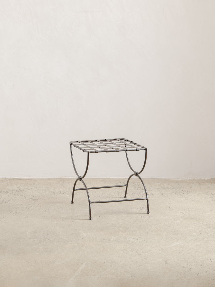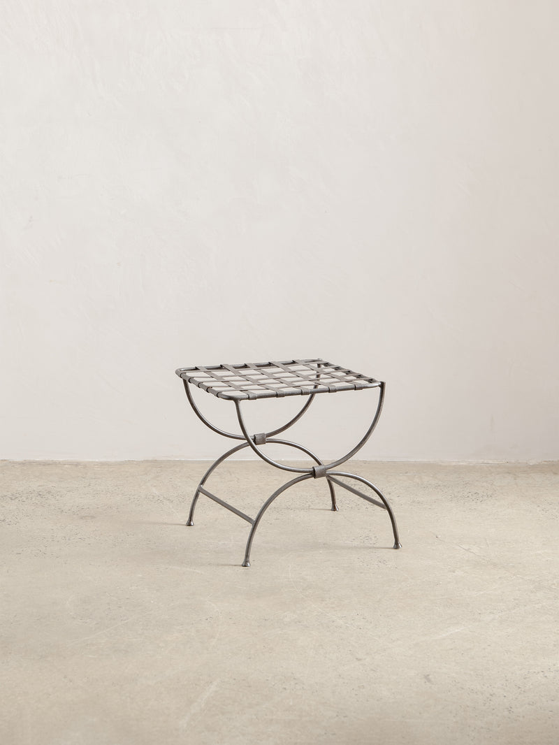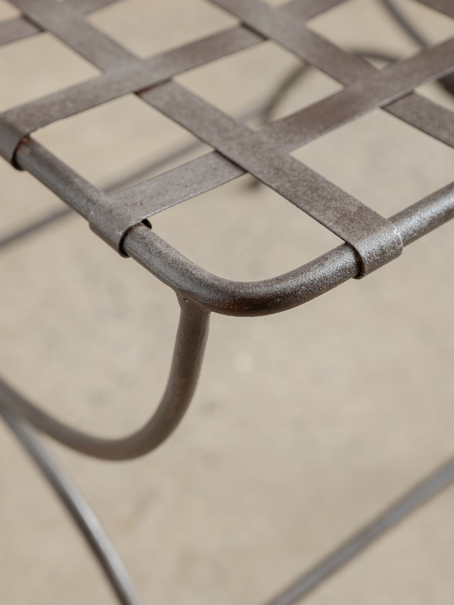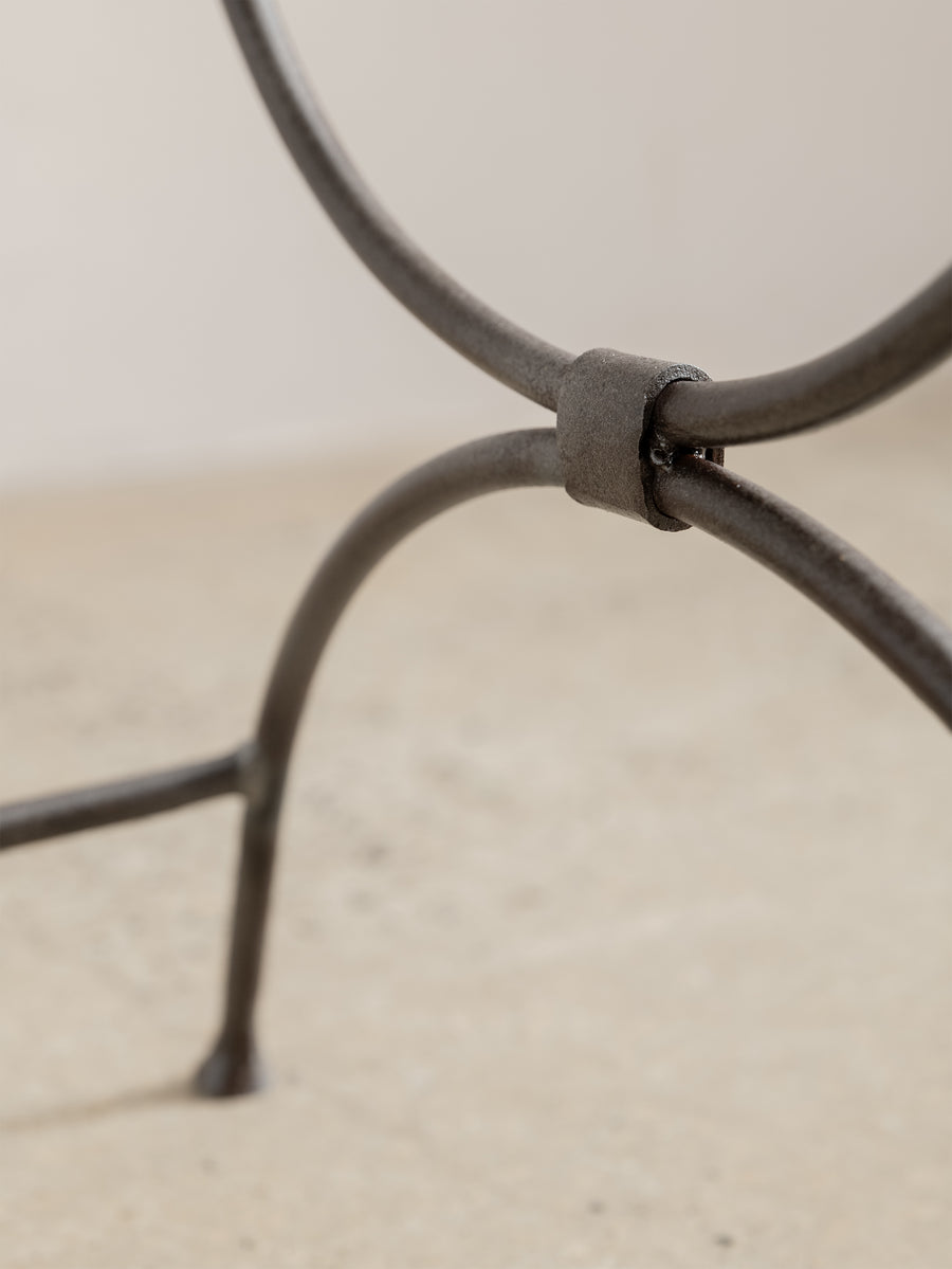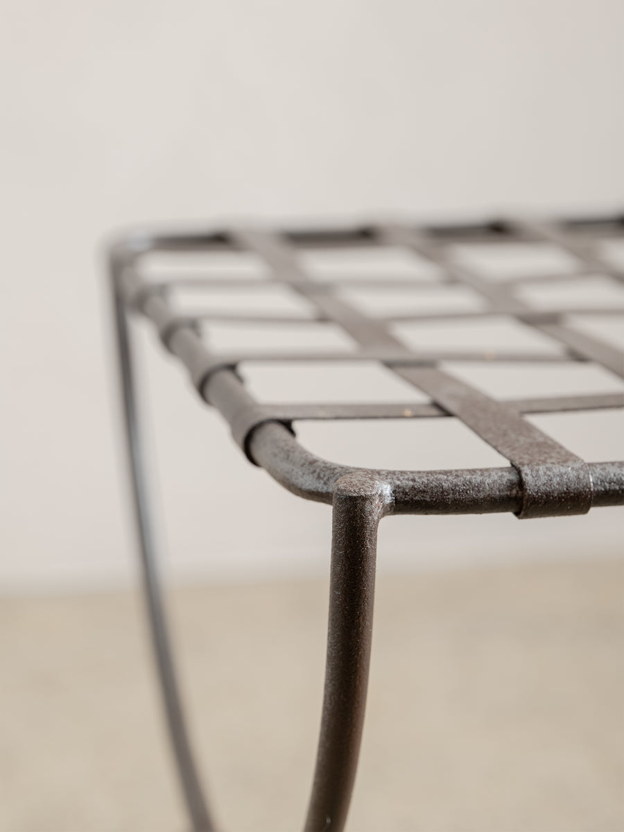 A sculptural 1960s iron side table, defined by its woven lattice top and gently arched supports. Light in form yet strong in structure, it carries the quiet presence of hand-forged craftsmanship and the patina of time.