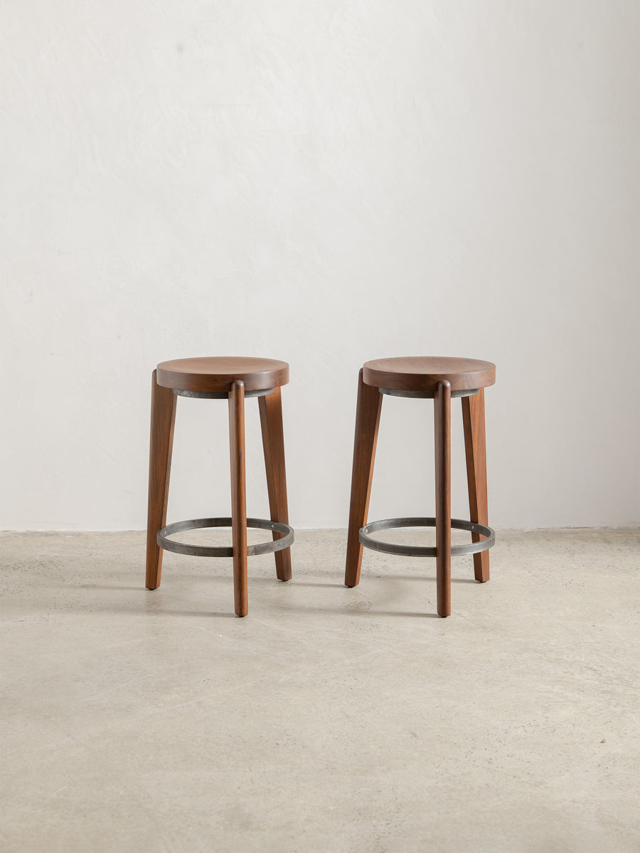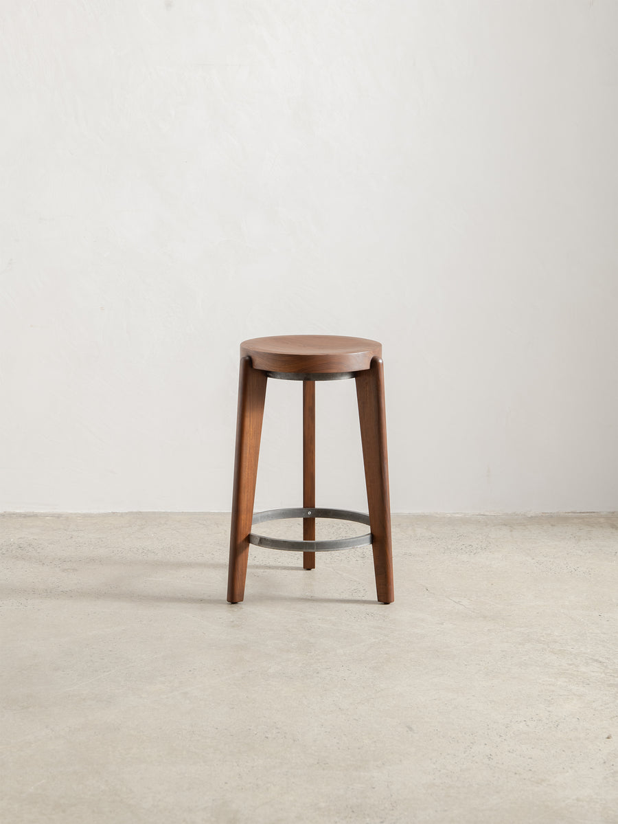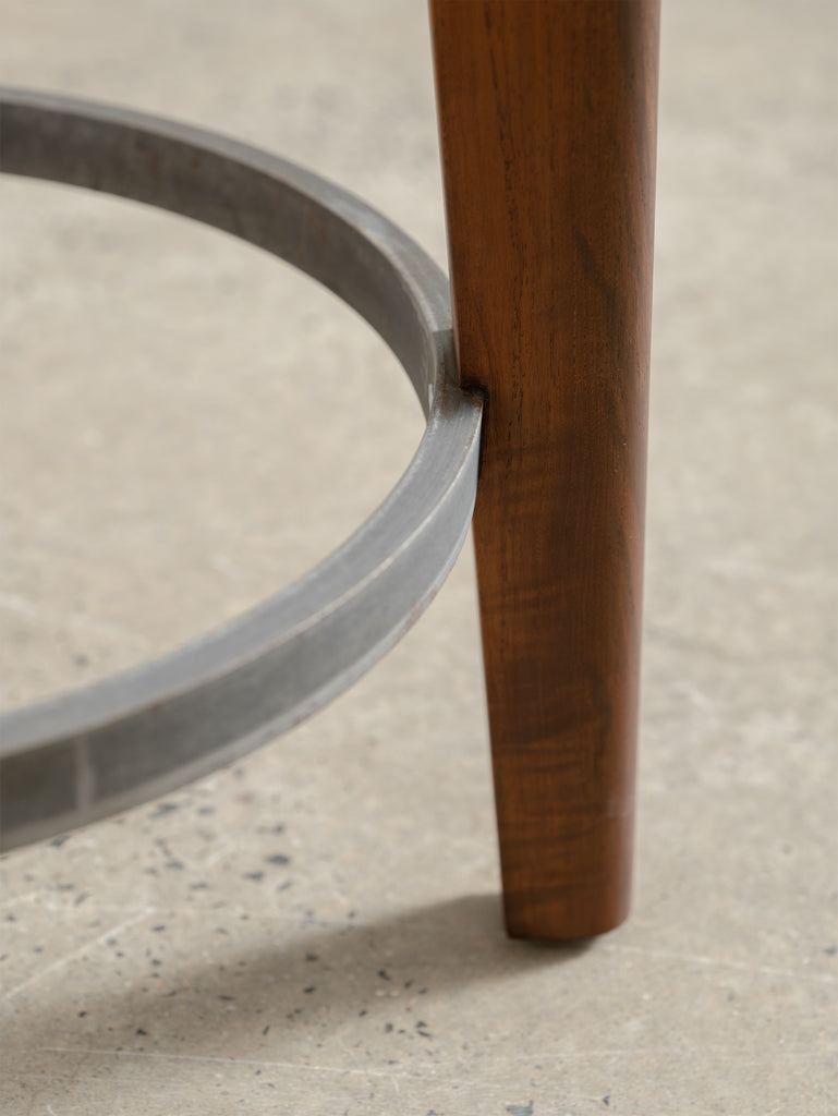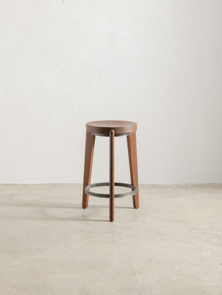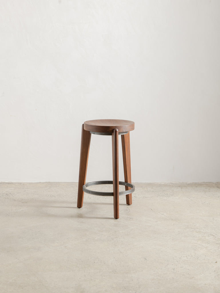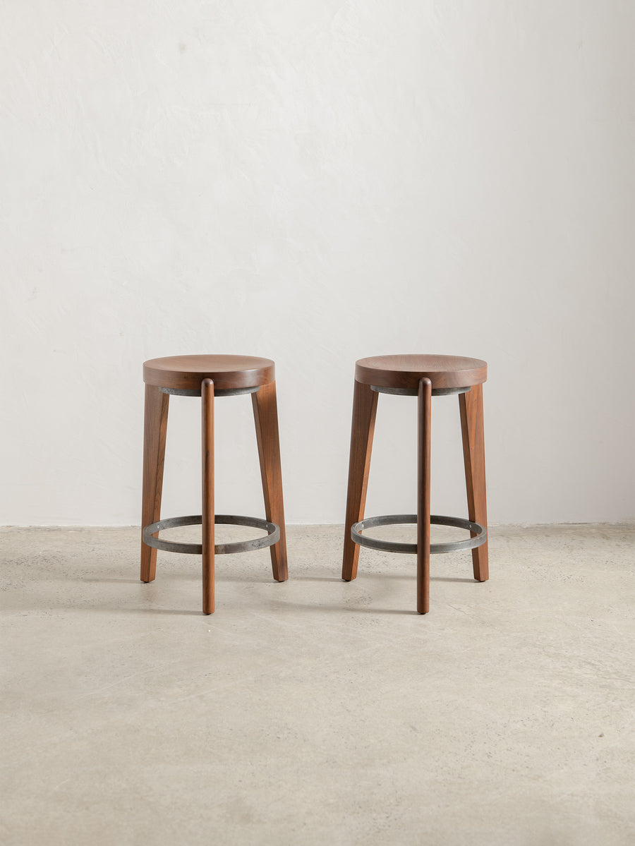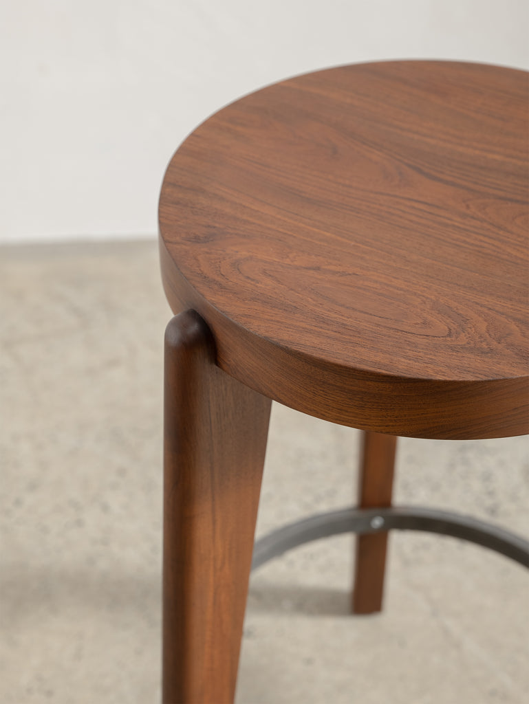 The Counter Stool has a solid teak seat with two metal rings - one at the foot of the stool and a smaller ring supporting the seat. The seat is gently hollowed to make seating comfortable.