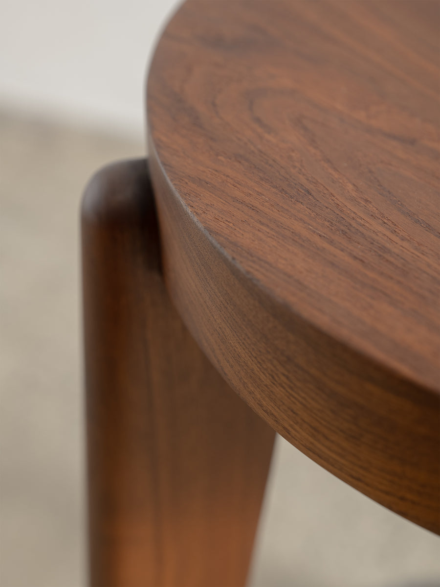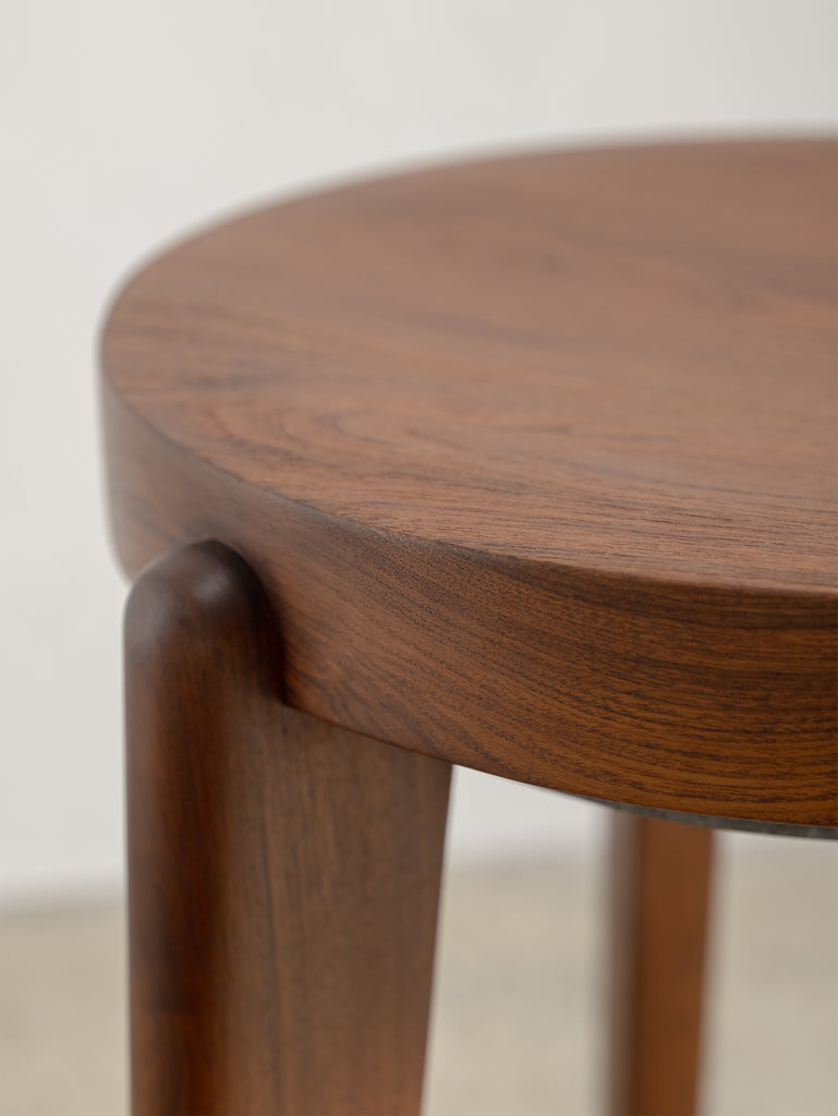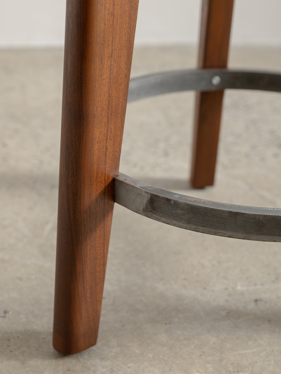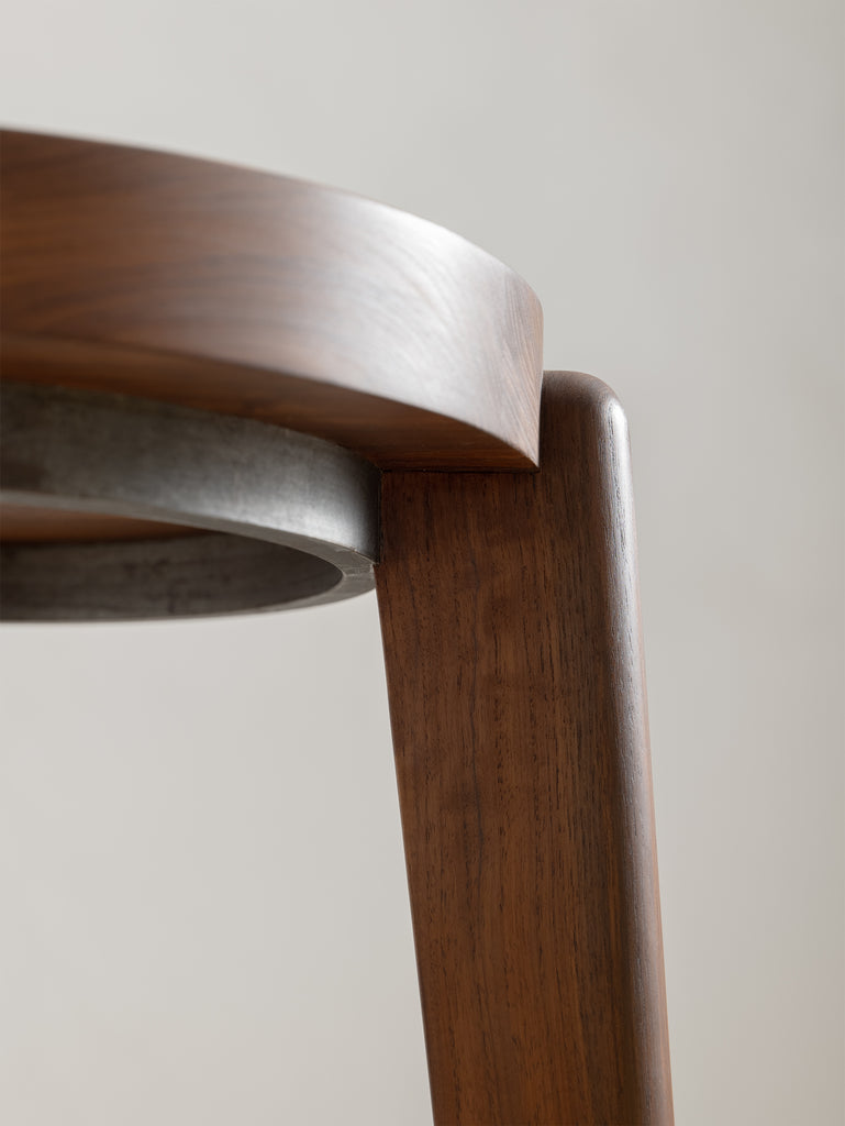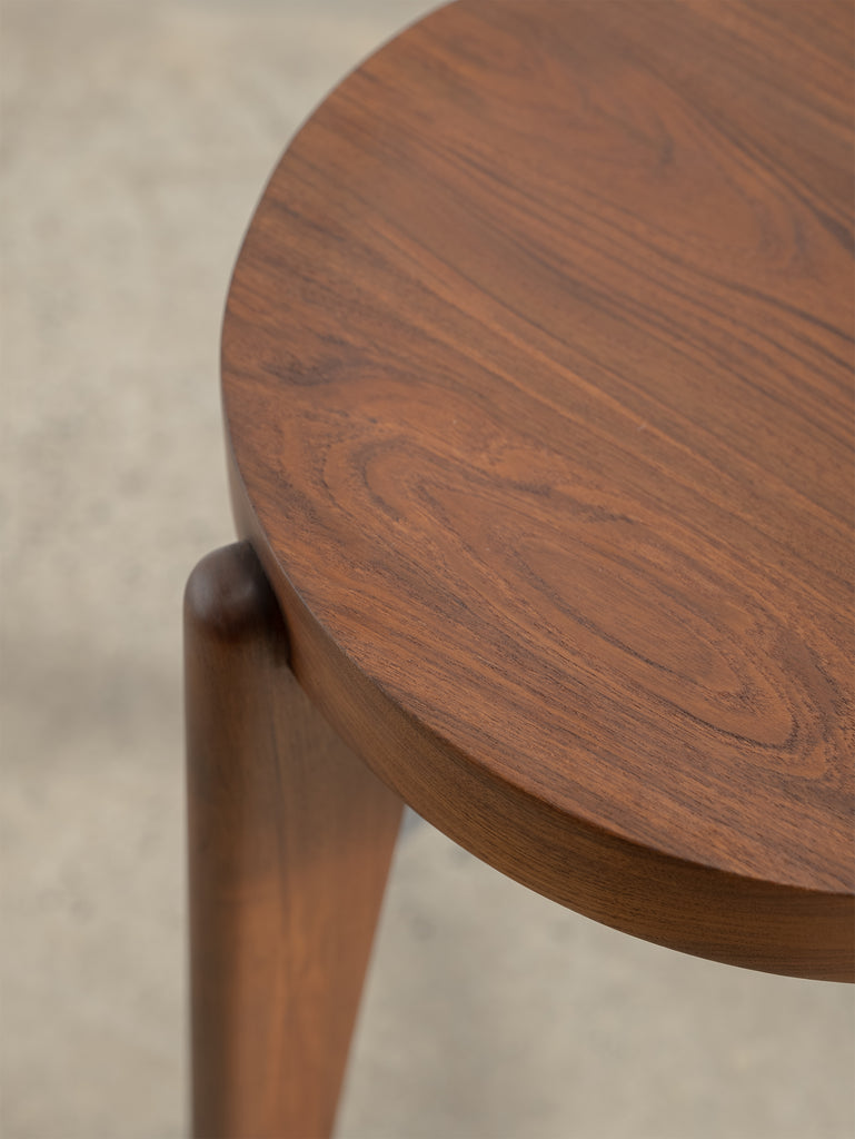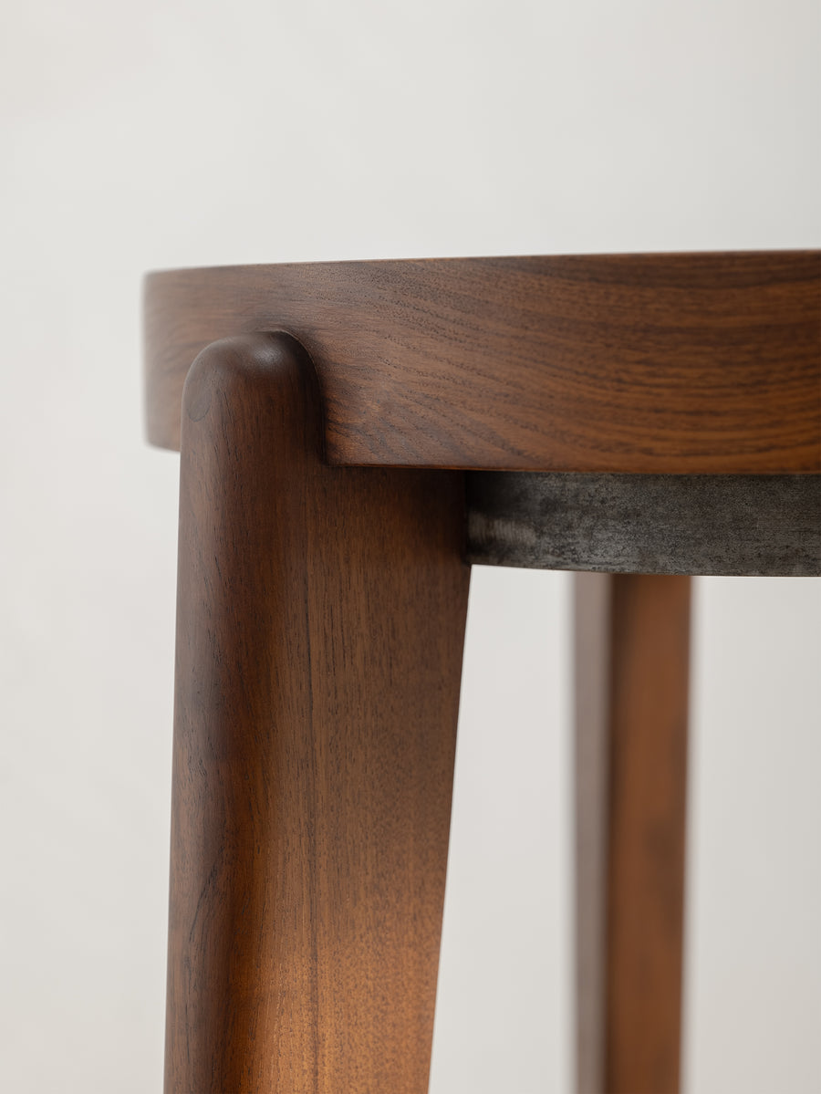 The Counter Stool has a solid teak seat with two metal rings - one at the foot of the stool and a smaller ring supporting the seat. The seat is gently hollowed to make seating comfortable.