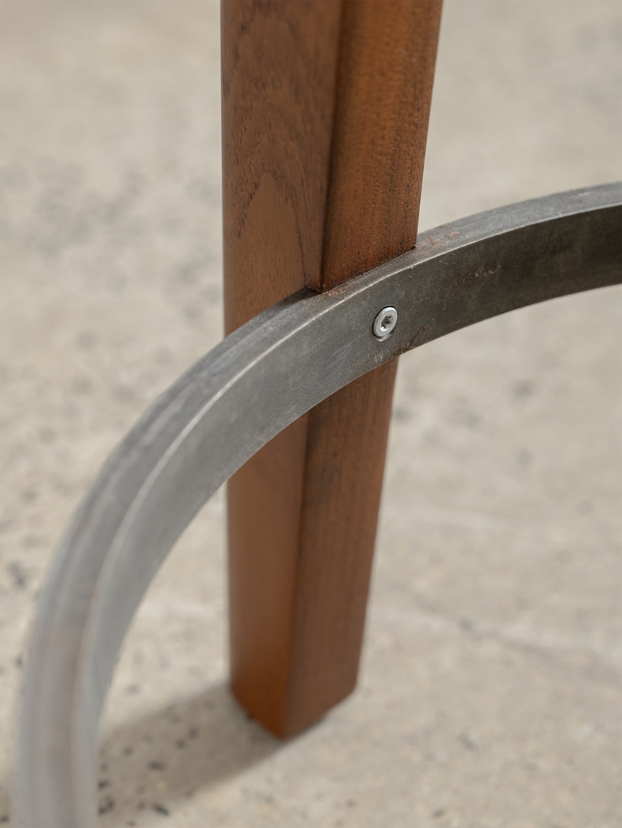 The metal rings are made of bright flat steel bars and have been fabricated using the hot metal rolling process that was commonly used in the early to mid 20th century. In this method, a flat bar of steel is shaped into a circle; and a weld is made at the point the two ends meet. The visible but inconspicuous inch wide weld grinding mark in the rings is due to this. The original patina of the raw material (which comes as flat bars) is retained to give the rings a weathered look. The screws used to fix the metal to the wood are also of the type used a few decades ago, although upgraded to a stainless steel.