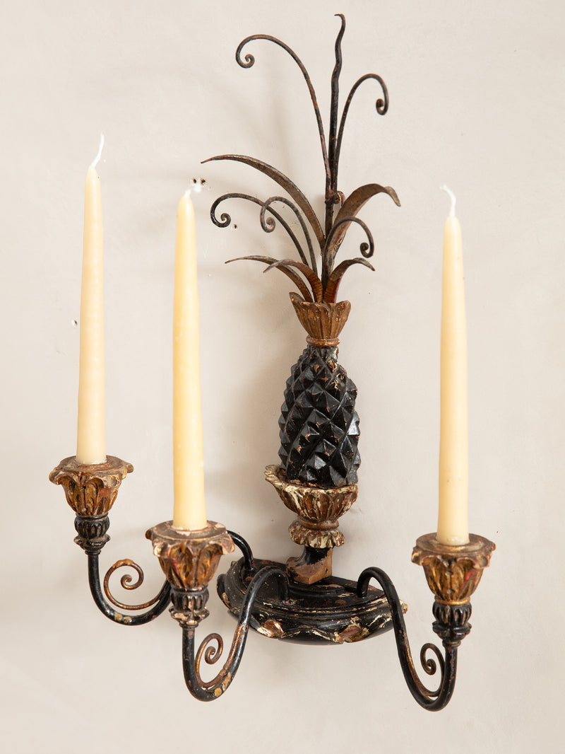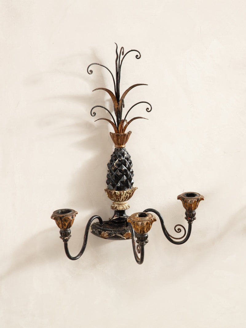 A striking wall sconce combining carved wood and wrought iron in a gilded pineapple motif - a symbol of warmth and welcome. Its sculptural form and hand-painted patina reflect the exuberant detailing of mid-century Italian craftsmanship. Designed to hold three taper candles, it adds a touch of old-world charm and theatrical elegance to any wall.