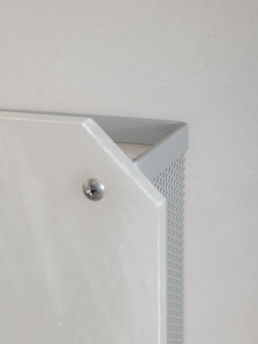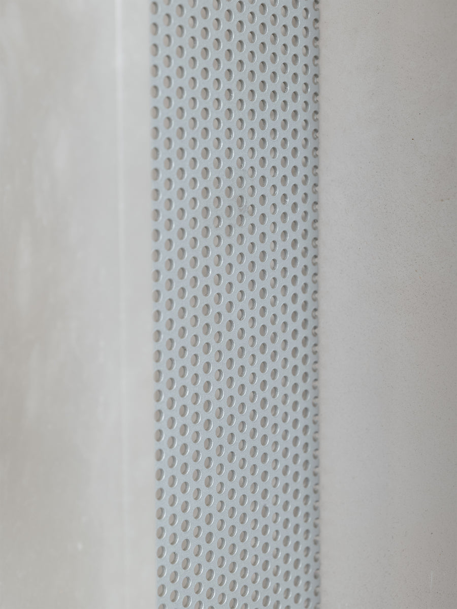 Italian alabaster wall sconce shades with perforated metal cases. Each piece is crafted from alabaster, a soft, luminous stone found in Italy. known for its ability to diffuse light into a gentle, warm glow. Designed to sit atop an existing wall light fixture, these shades bring a refined, sculptural presence to any space. Their natural variations in tone and veining make each one subtly unique.