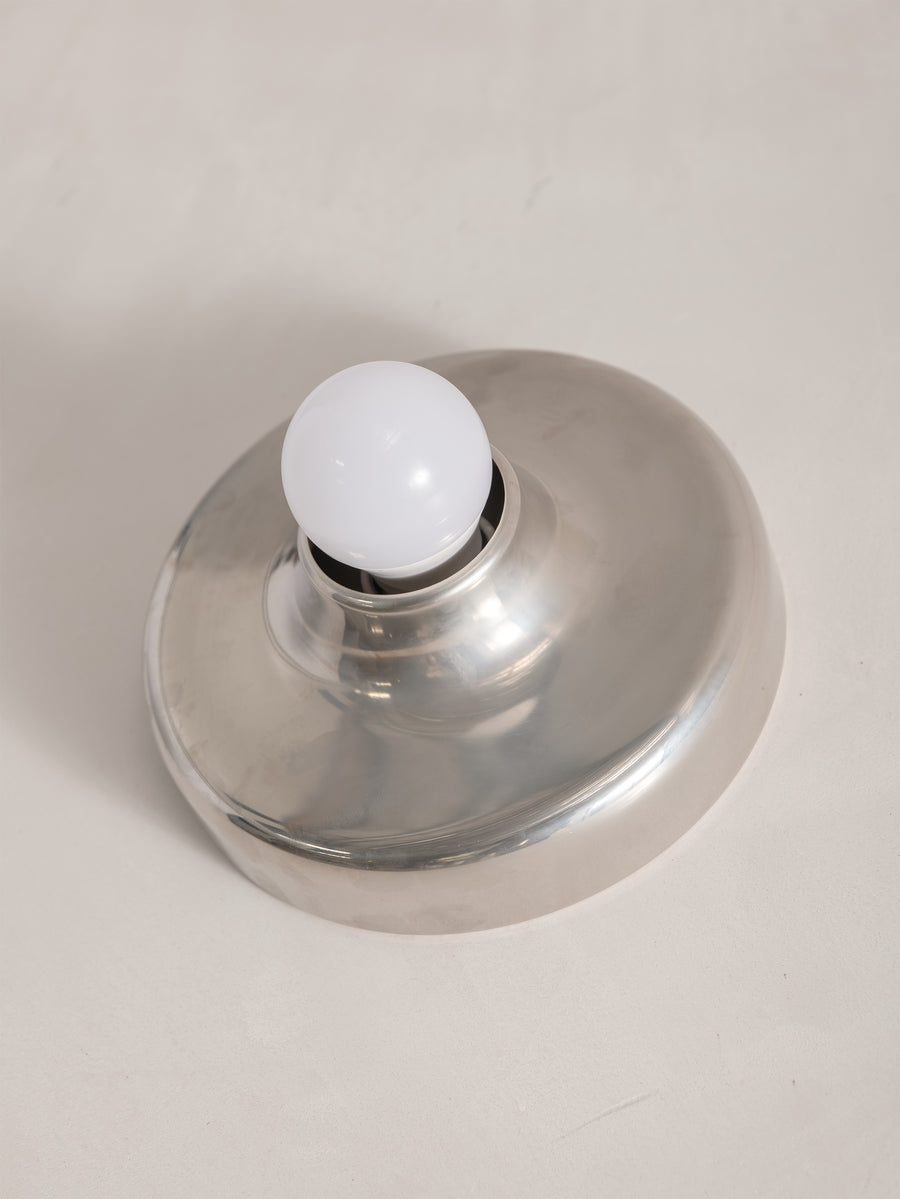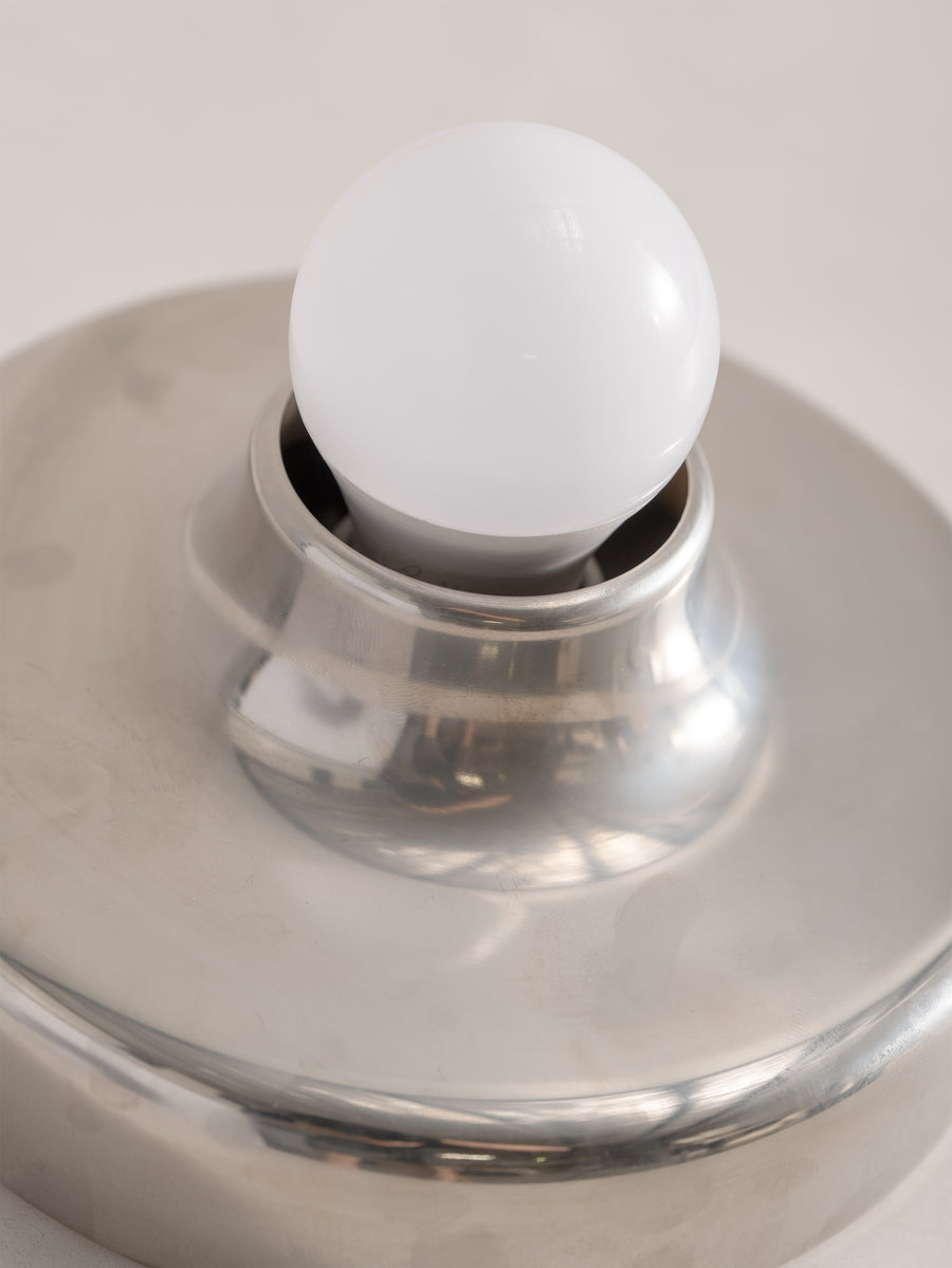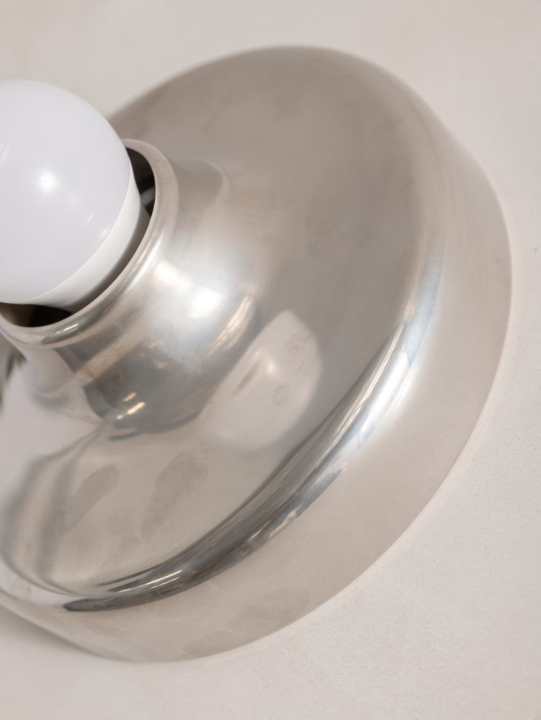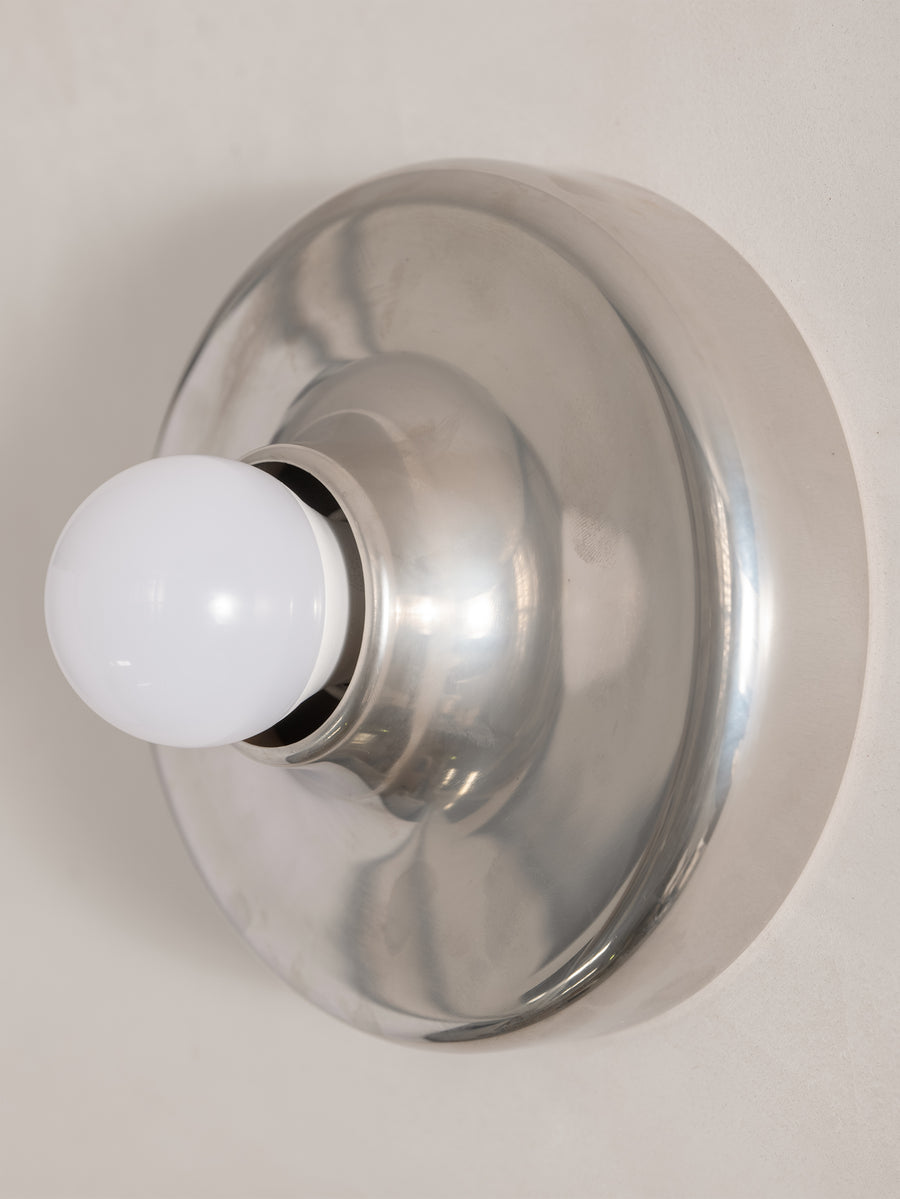 A refined expression of 1970s Italian design, this Mod 608 wall light by Aretluce captures the sleek modernism of Milan in 1971. Crafted in silver-chromed metal, its sculptural form plays with light and reflection, bringing a subtle yet striking presence to any space. The vintage chrome is in optimal condition, with some signs of wear consistent with age. Minimalist yet bold, it embodies the effortless sophistication of its era.