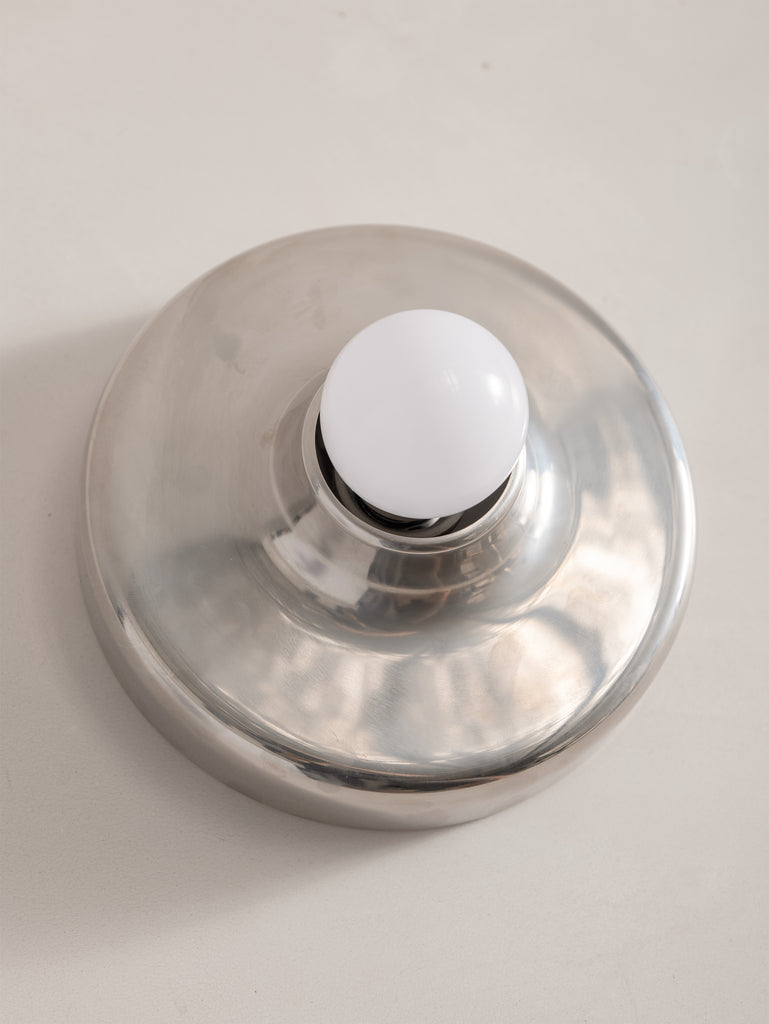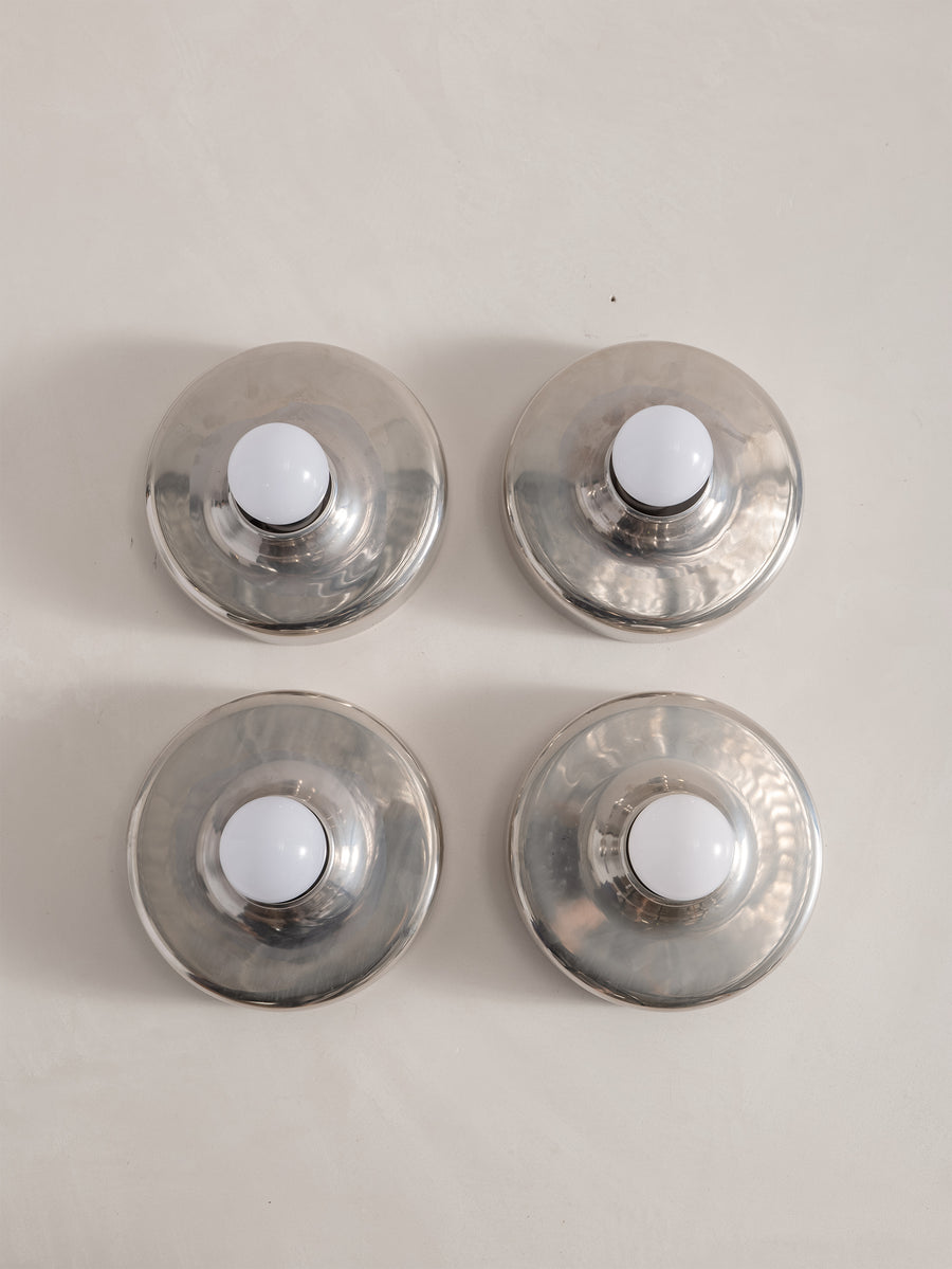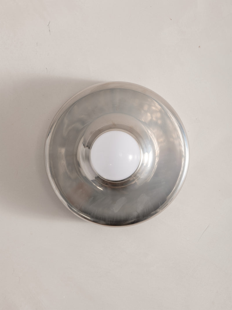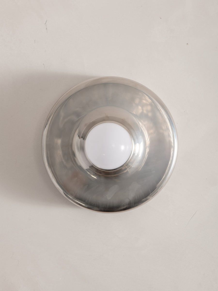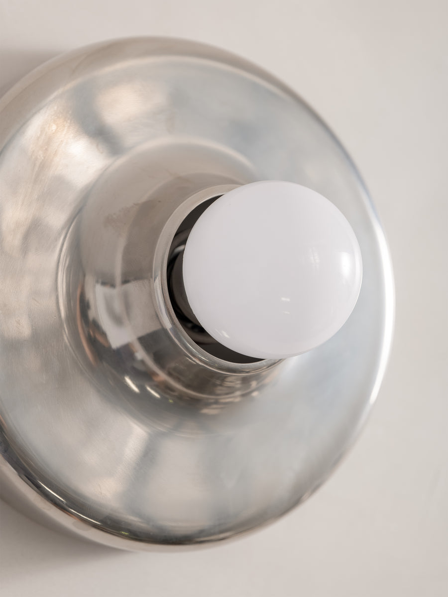 A refined expression of 1970s Italian design, this Mod 608 wall light by Aretluce captures the sleek modernism of Milan in 1971. Crafted in silver-chromed metal, its sculptural form plays with light and reflection, bringing a subtle yet striking presence to any space. The vintage chrome is in optimal condition, with some signs of wear consistent with age. Minimalist yet bold, it embodies the effortless sophistication of its era.