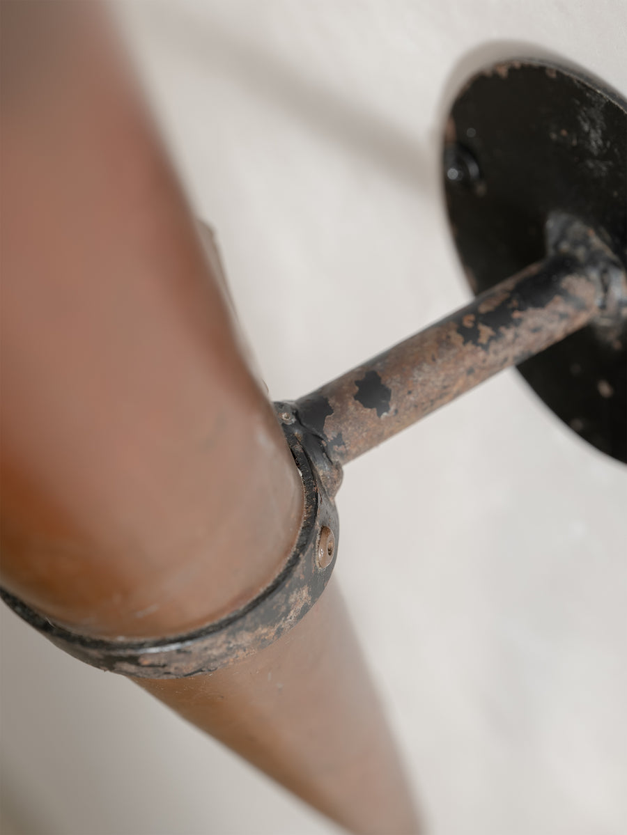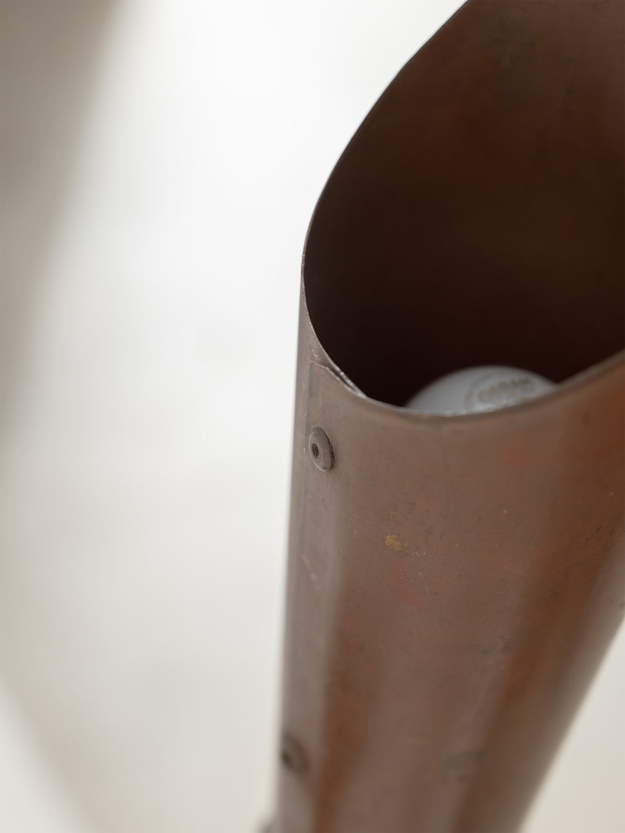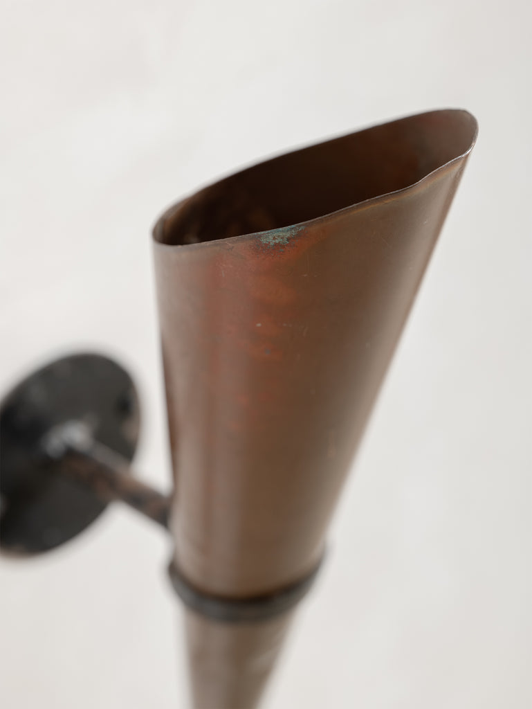 Rustic style wall sconce crafted from copper, with metal arm to attach to wall.