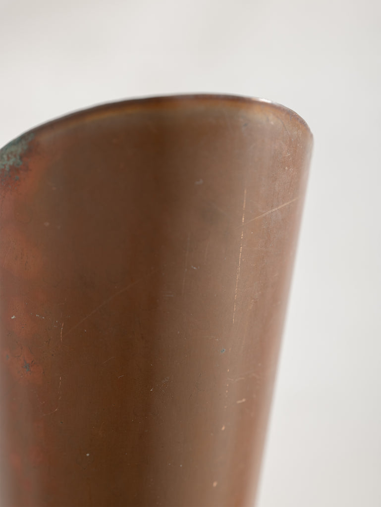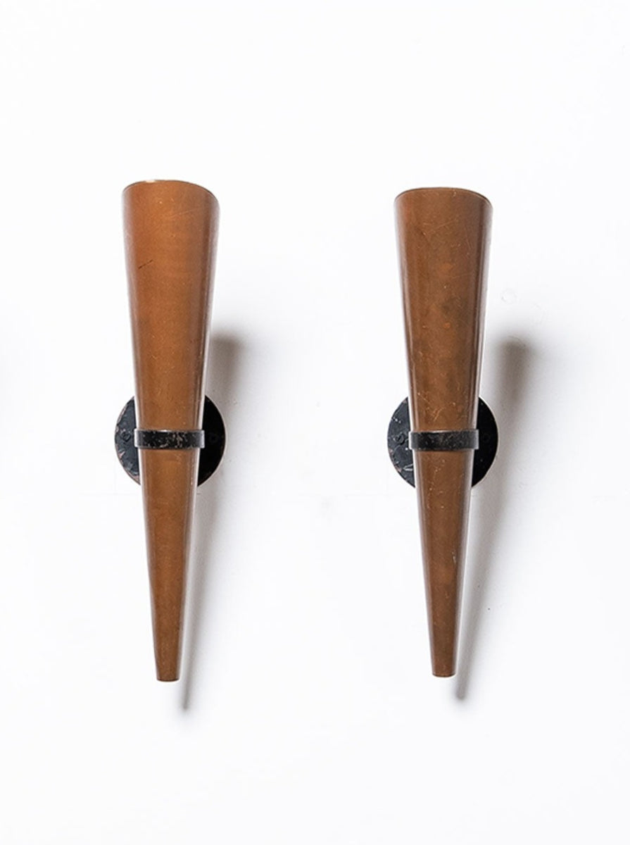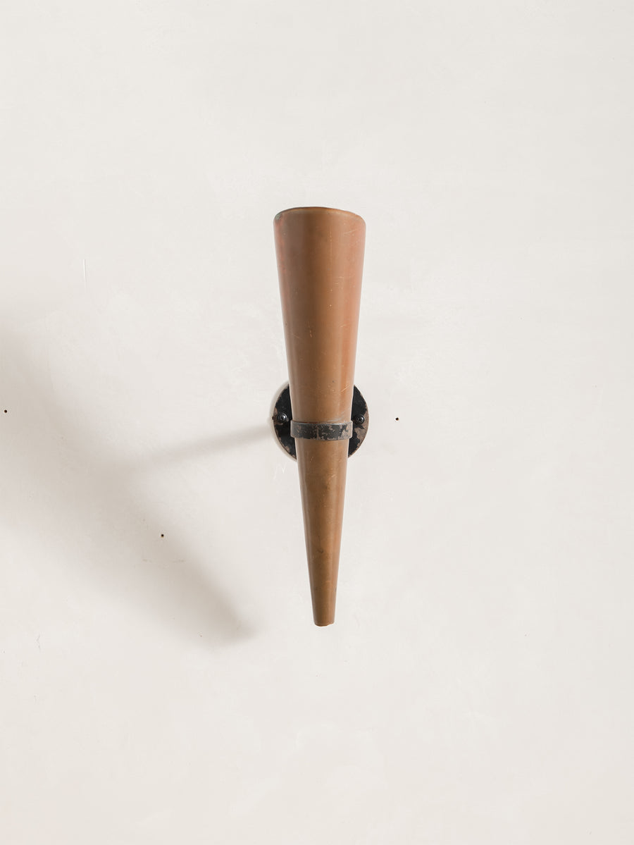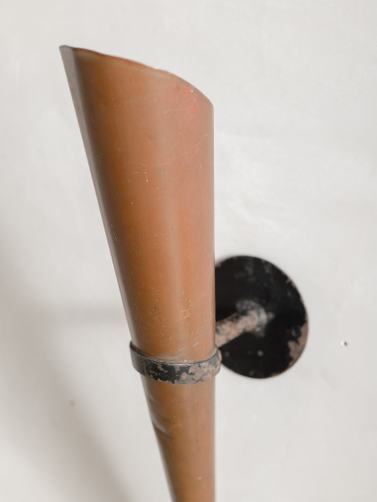 Rustic style wall sconce crafted from copper, with metal arm to attach to wall.