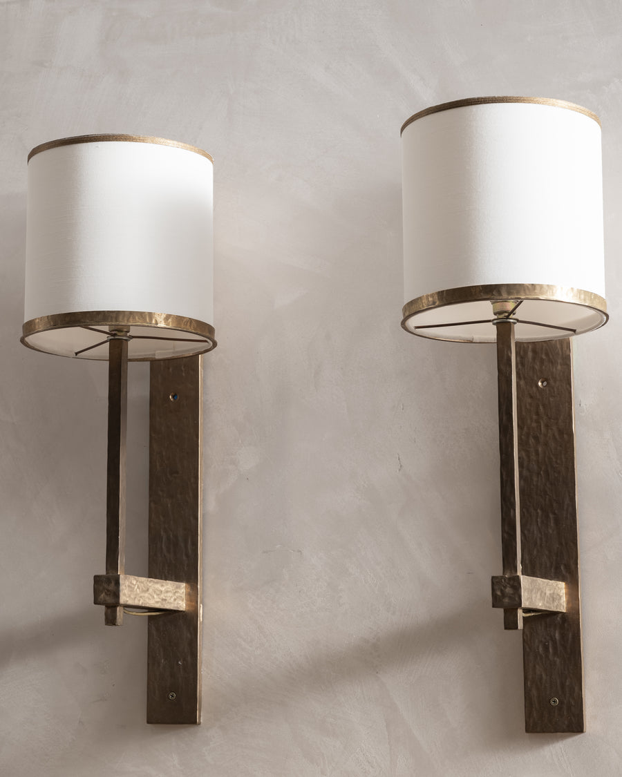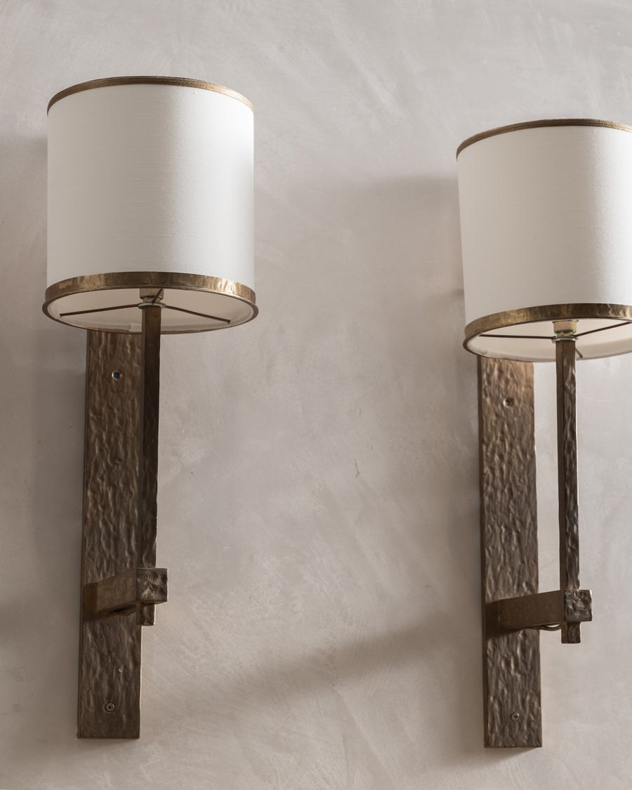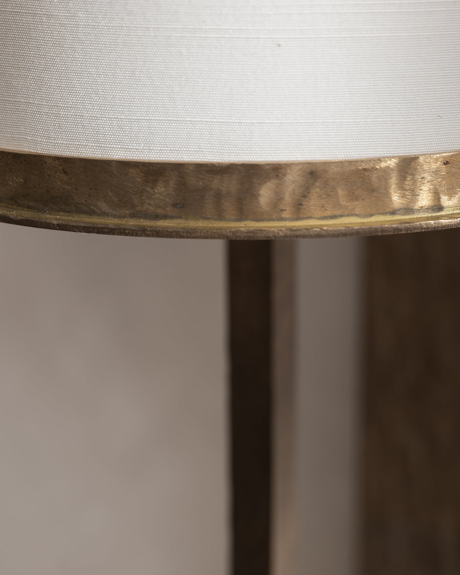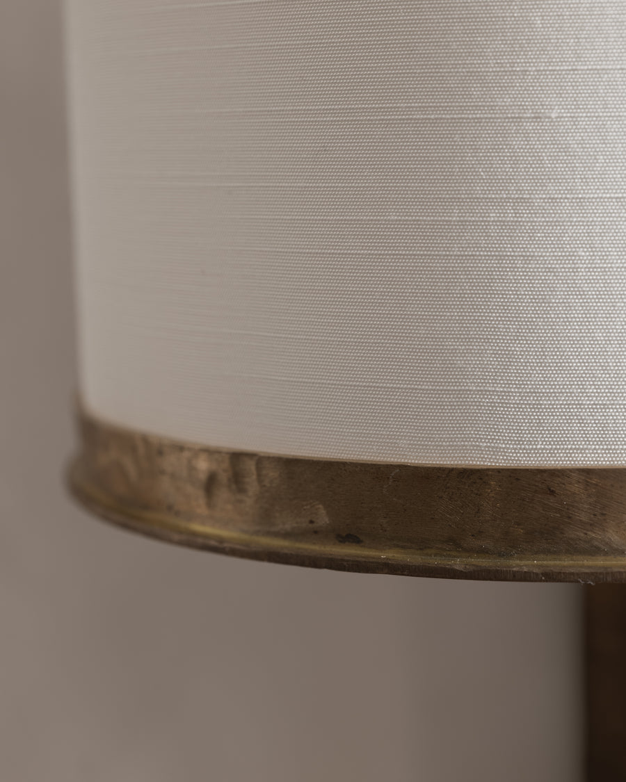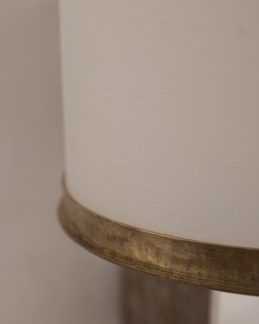 A quiet study in texture and warmth, this 1980s French table lamp is crafted from gilt brass with a beautifully hammered surface - catching the light with a subtle, organic shimmer. The bronze is in great condition, its golden tones rich with depth. A fabric shade softens the glow, bringing warmth to the piece. Sculptural yet understated, it speaks to a refined, tactile elegance.