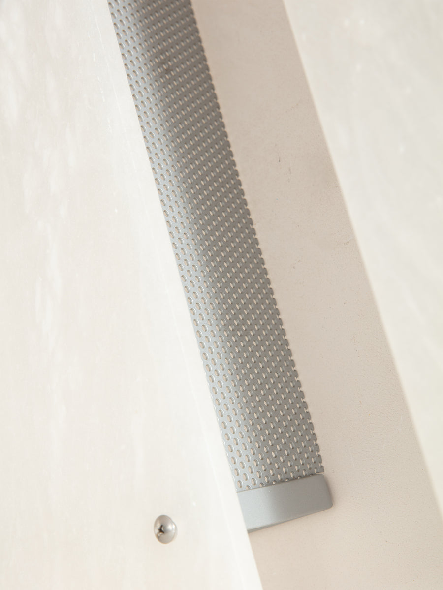 Italian alabaster wall sconce shades with perforated metal cases. Each piece is crafted from alabaster, a soft, luminous stone found in Italy. known for its ability to diffuse light into a gentle, warm glow. Designed to sit atop an existing wall light fixture, these shades bring a refined, sculptural presence to any space. Their natural variations in tone and veining make each one subtly unique.