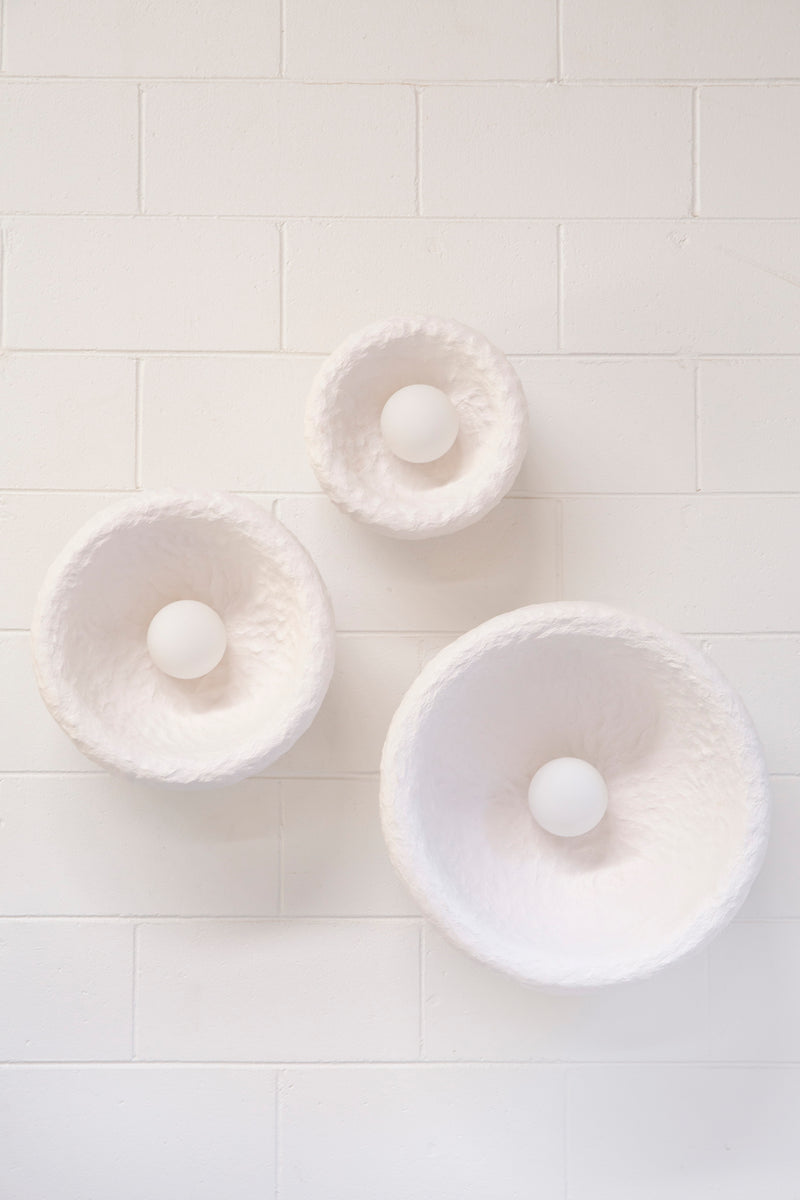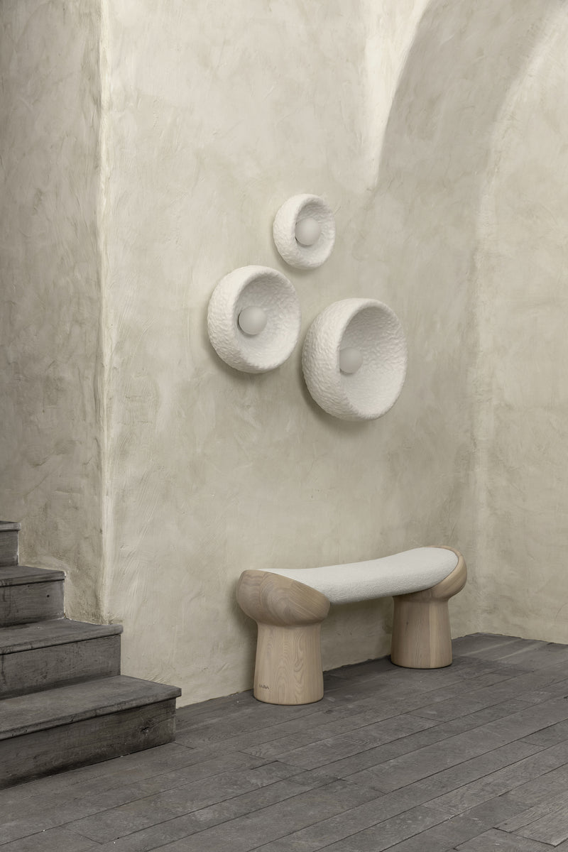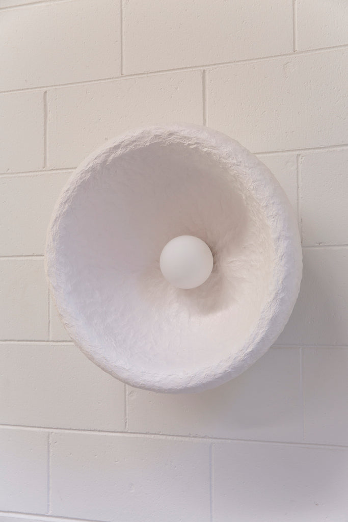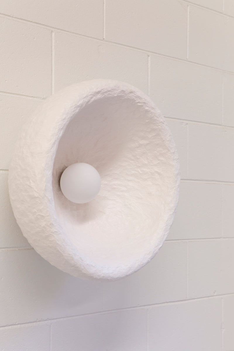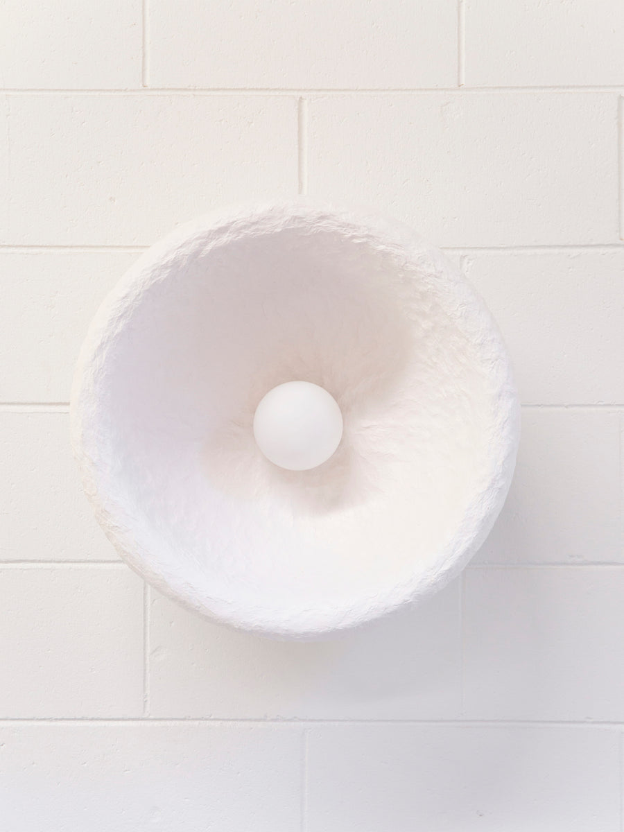 Like the head of a sunflower, the wall lamp features a primitive naive deisgn and living tactile surface. Shaped by hand from organic material based on clay, the pice animates the space with delicate light.