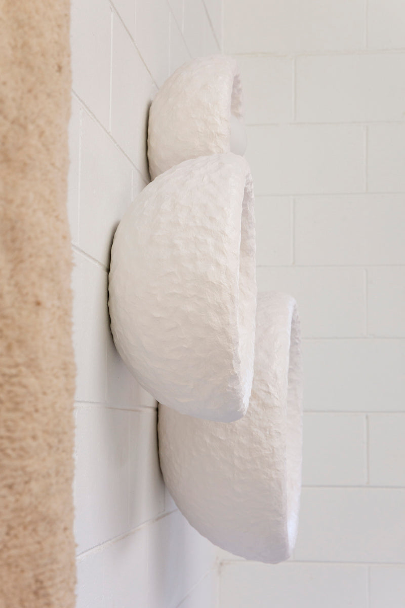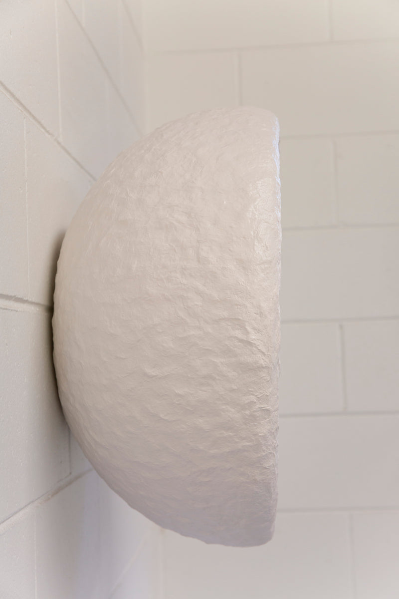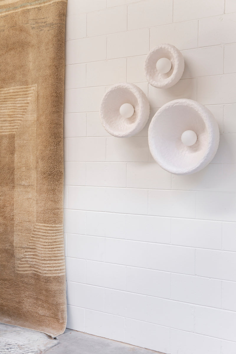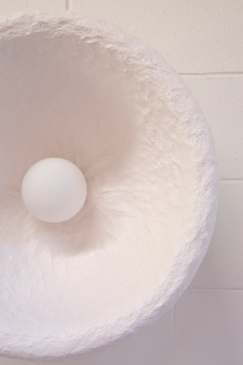 Like the head of a sunflower, the wall lamp features a primitive naive deisgn and living tactile surface. Shaped by hand from organic material based on clay, the pice animates the space with delicate light.
