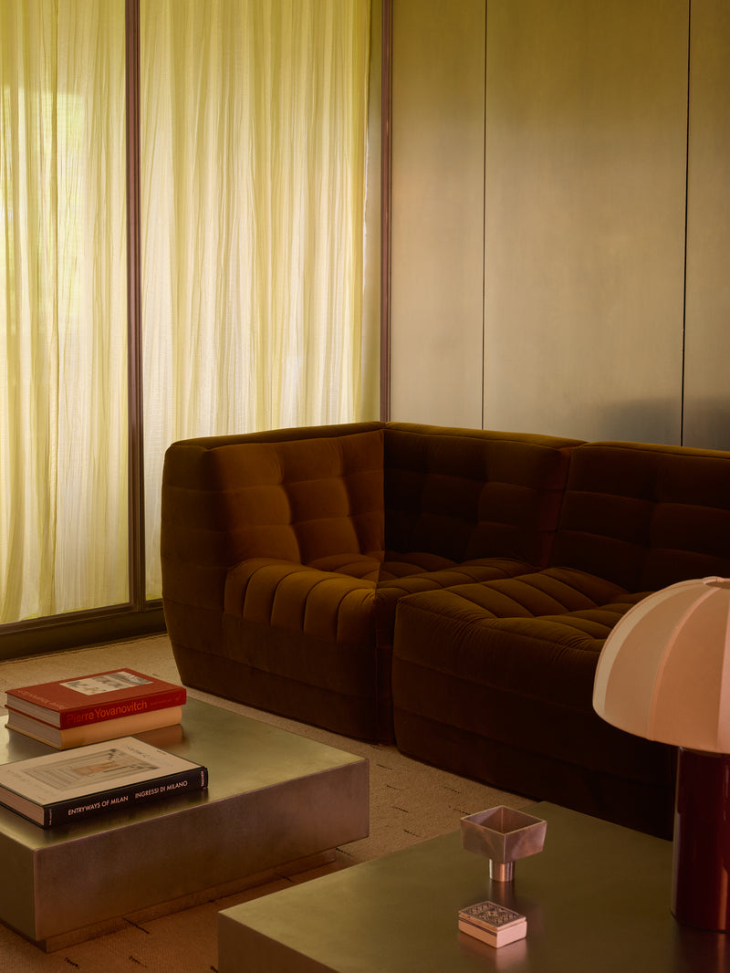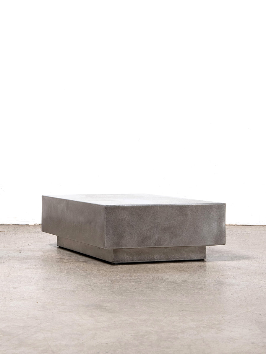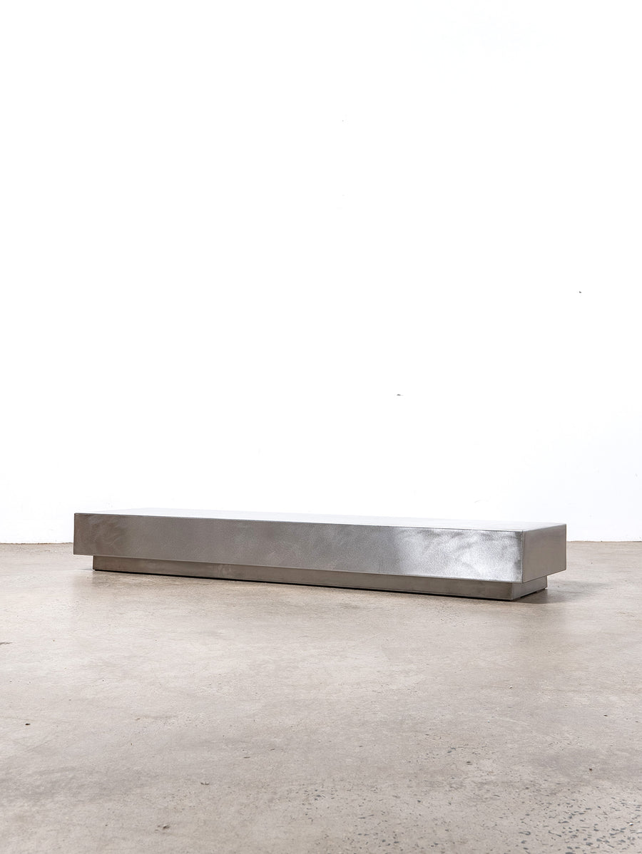 Low-line stainless steel coffee table inspired by the sleek modernist aesthetic of the 1970s, adding a touch of industrial elegance to your space.