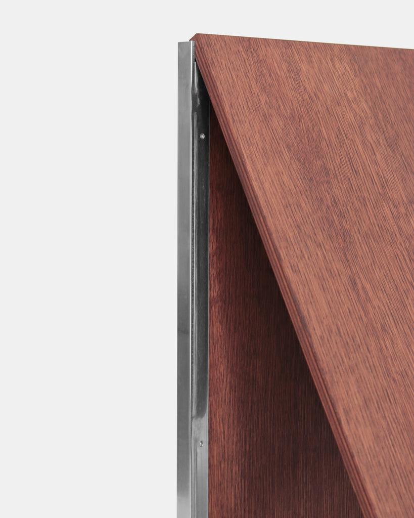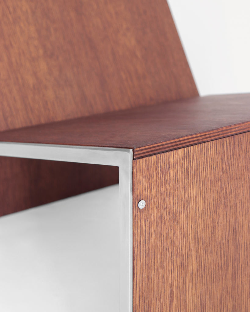Crafted from plywood with oak veneer, the Lounge Chair features a vibrated stainless steel frame and striking angular design.