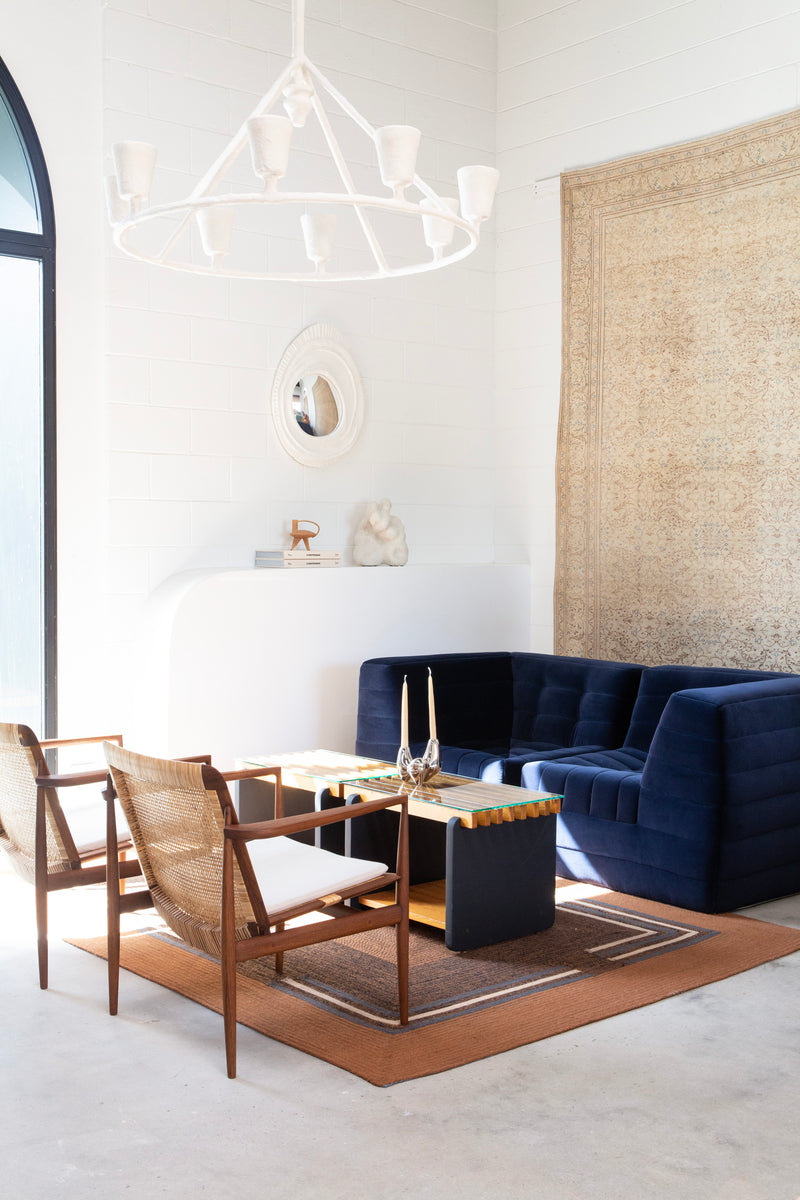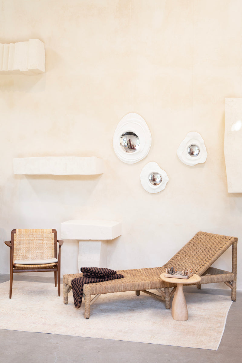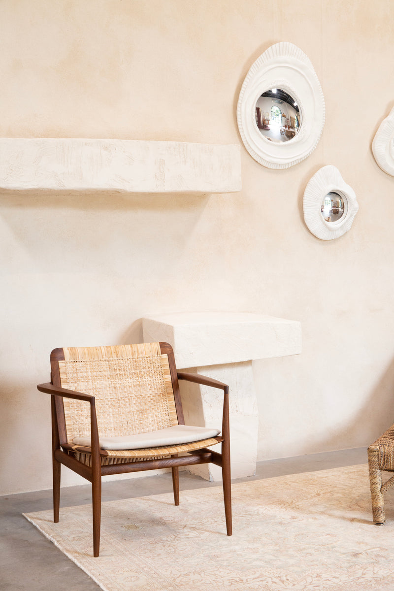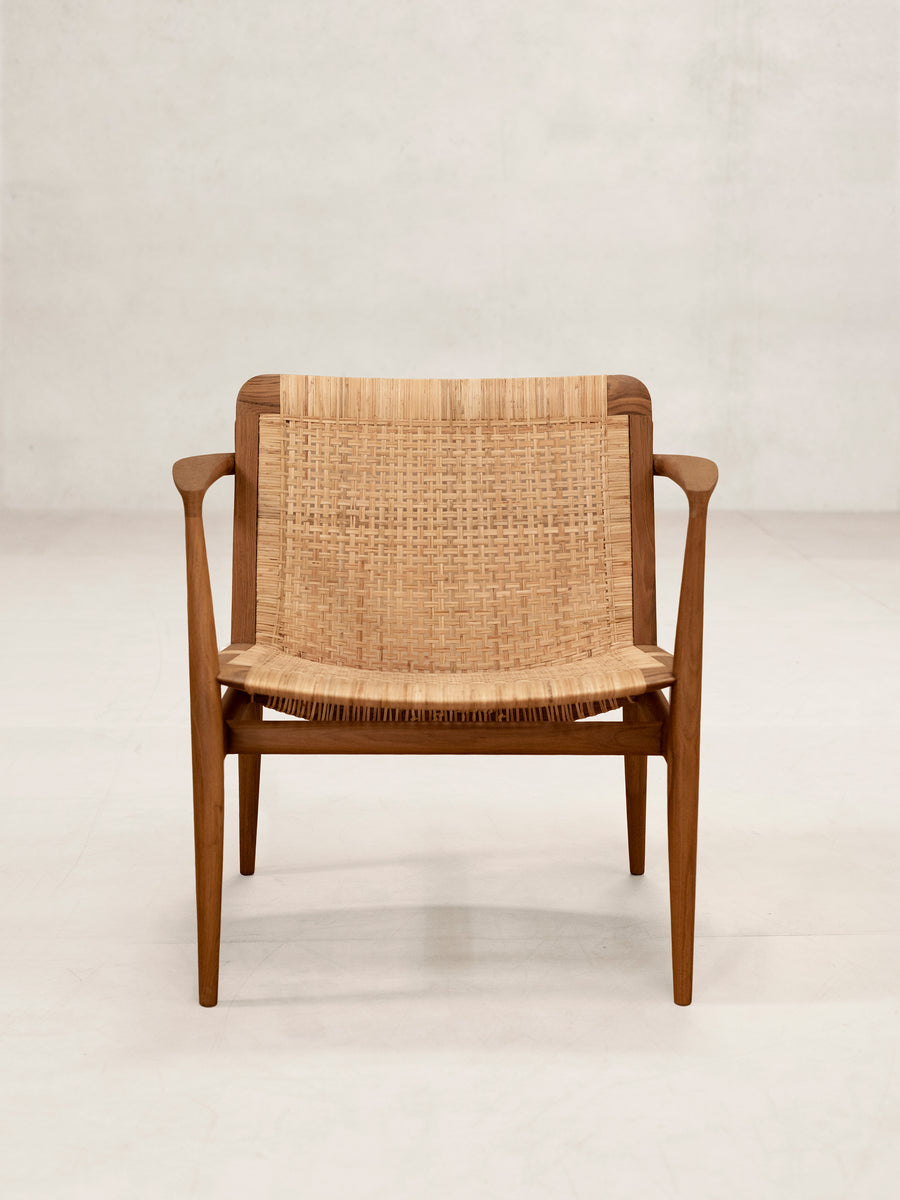 The Tangali Modular Chairs are a set comprising an armless chair, chairs with one arm (left or right) and armchairs with both arms. Individual chairs can be used in different combinations based on the seating requirement in a particular space. The contours of the modular pieces are completely shaped by hand, and the cane is wrapped and woven around the wooden frames in the signature Tangali style.