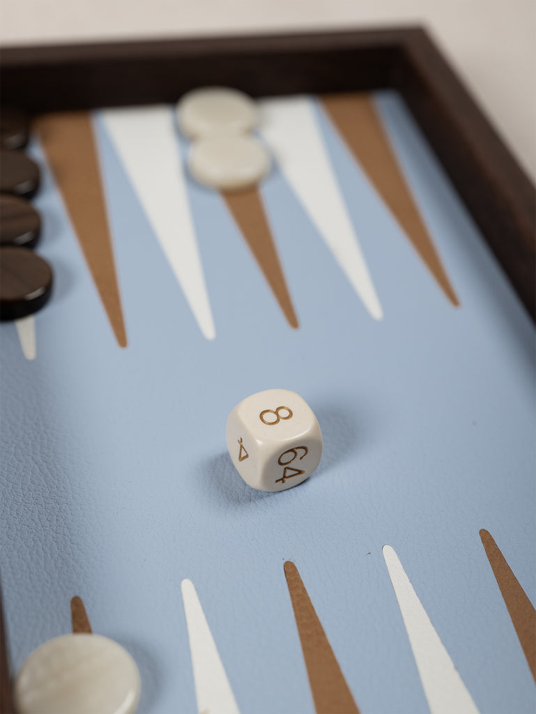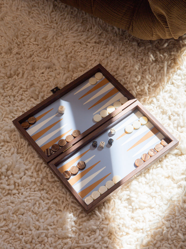Our Tigmi Travel Backgammon Set is hand crafted from walnut, with a woven straw face applied using the art of marquetry - an art that flourished in Europe in the 16th century. It is finished with a beautiful brass clasp.