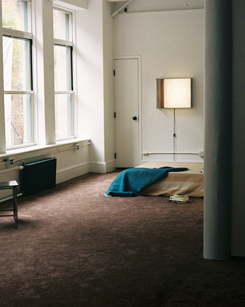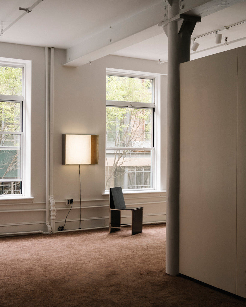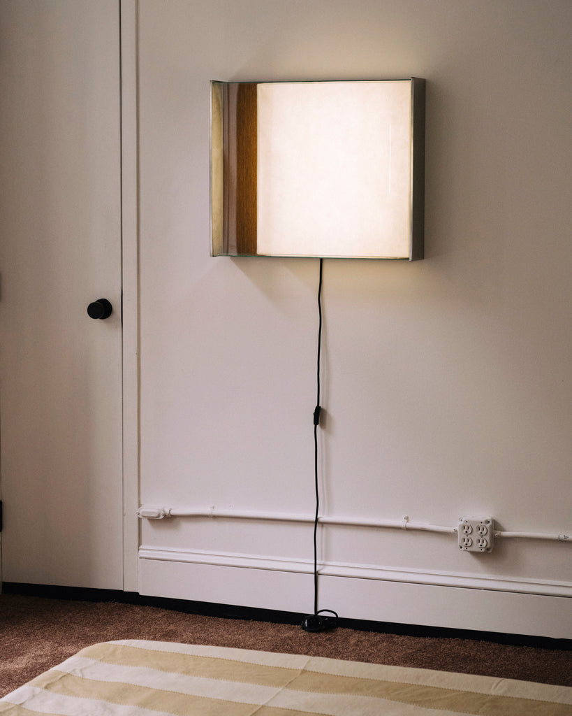 Crafted from stainless steel, glass and plywood, the Wall Lamp is finished with a washi paper shade, emitting a warm, ambient glow through its striking form.