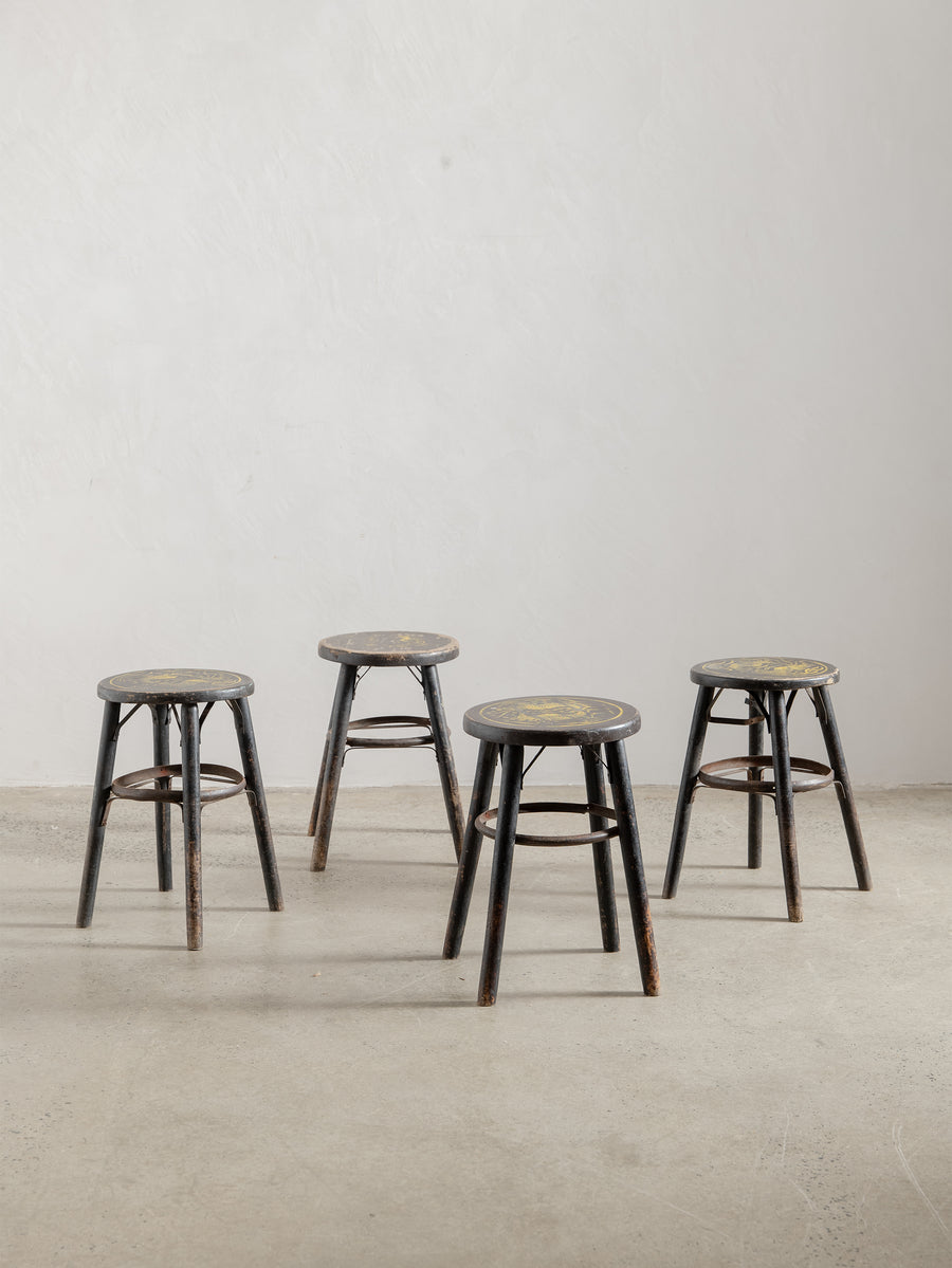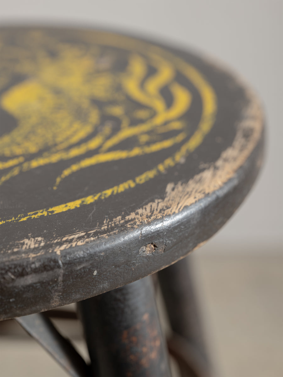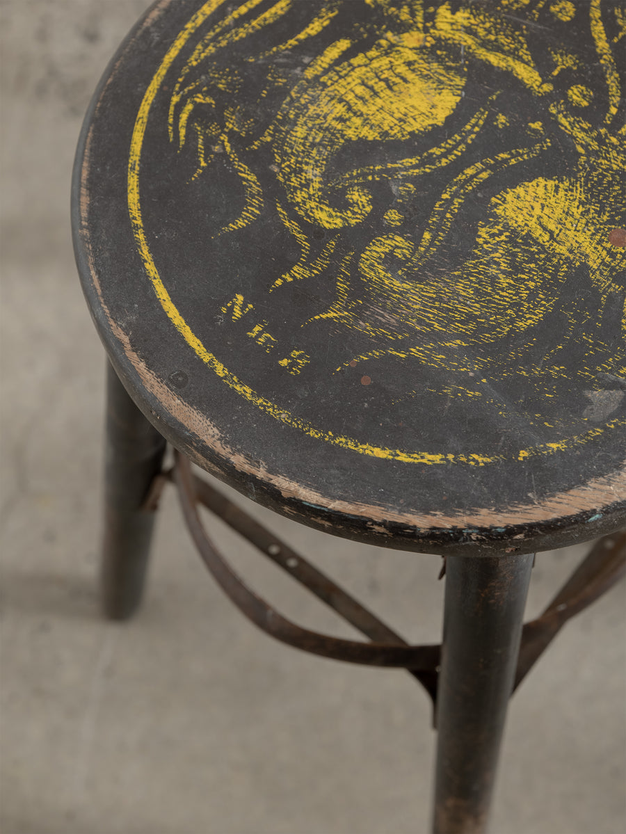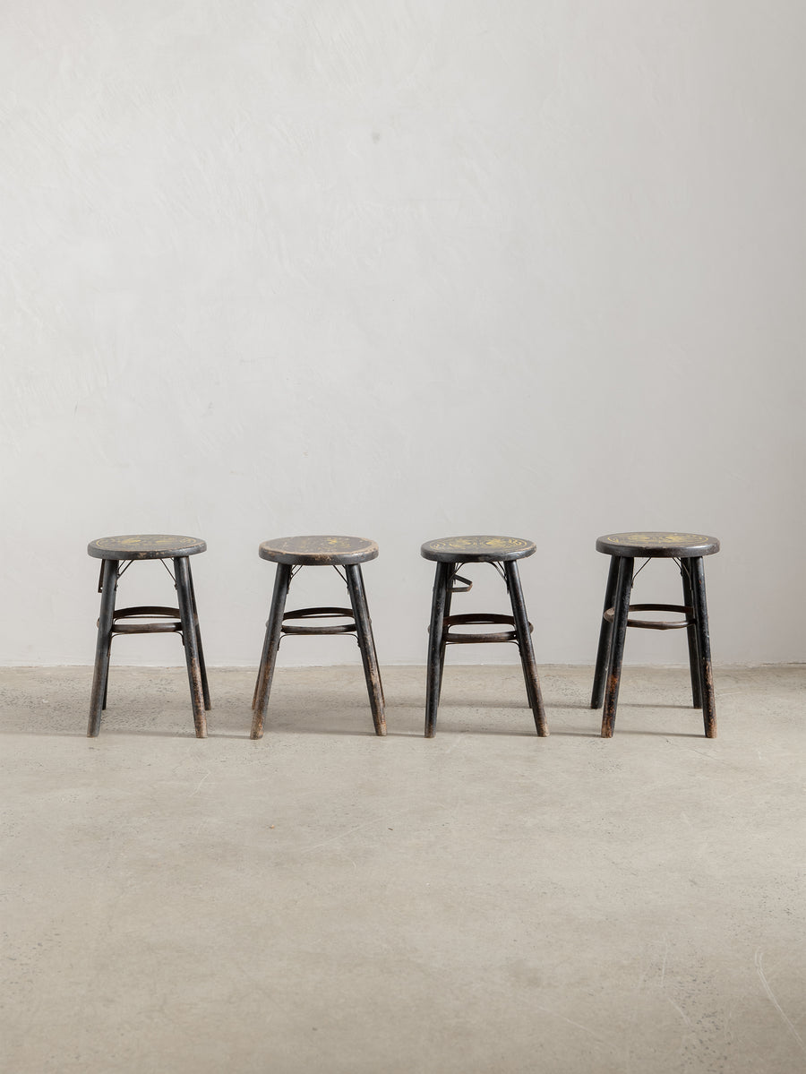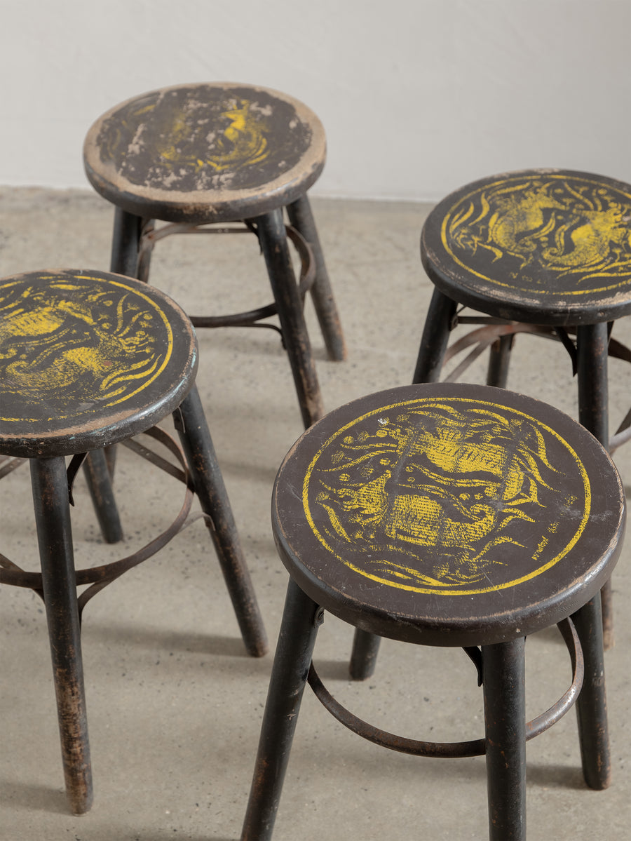 These vintage wooden stools carry the character of time, with aged black paint and hand-painted yellow motifs across the seat. Each stool is marked by its own unique wear and pattern, adding warmth and authenticity to any space.