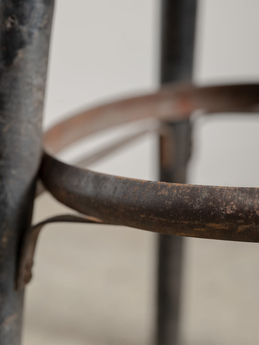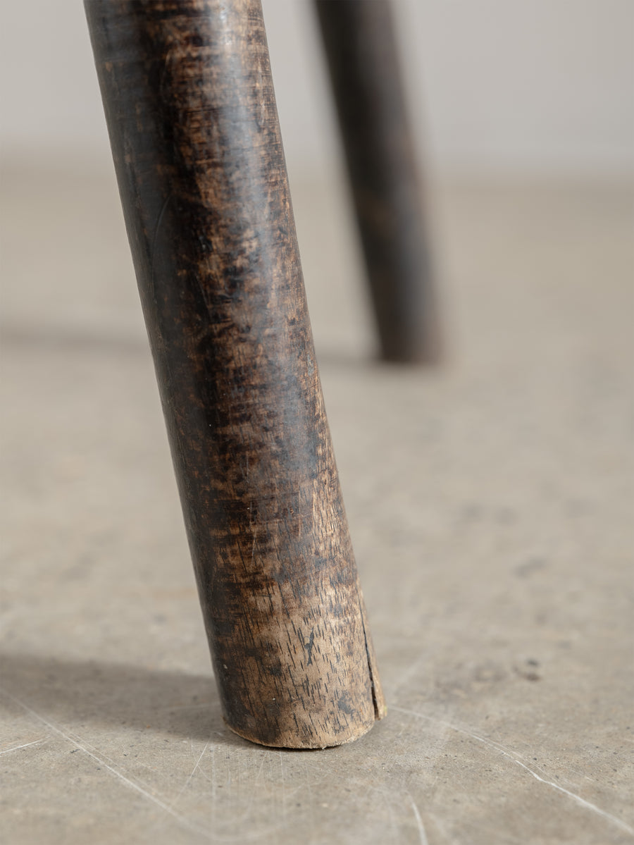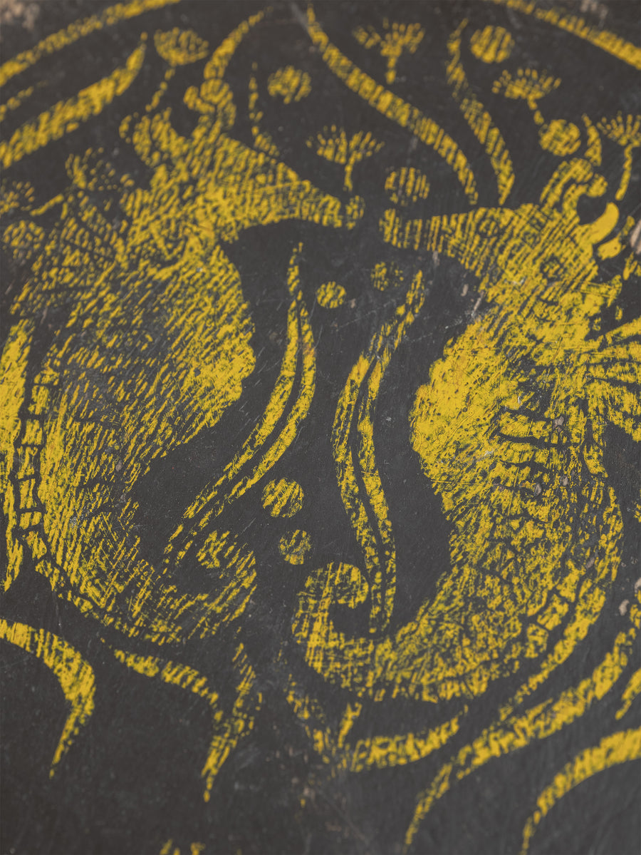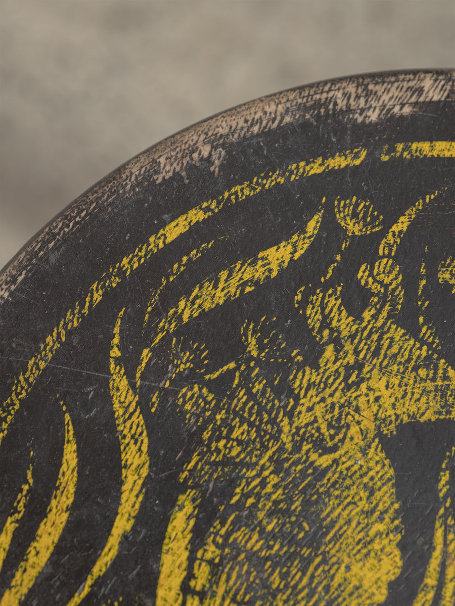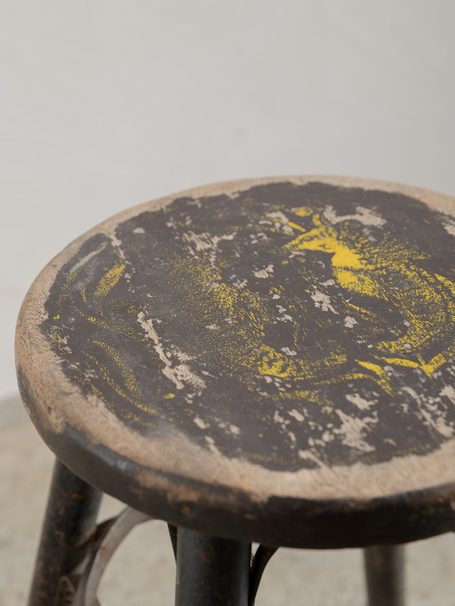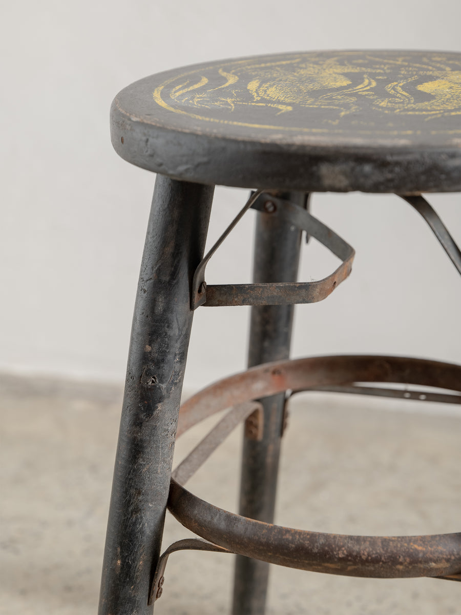 These vintage wooden stools carry the character of time, with aged black paint and hand-painted yellow motifs across the seat. Each stool is marked by its own unique wear and pattern, adding warmth and authenticity to any space.