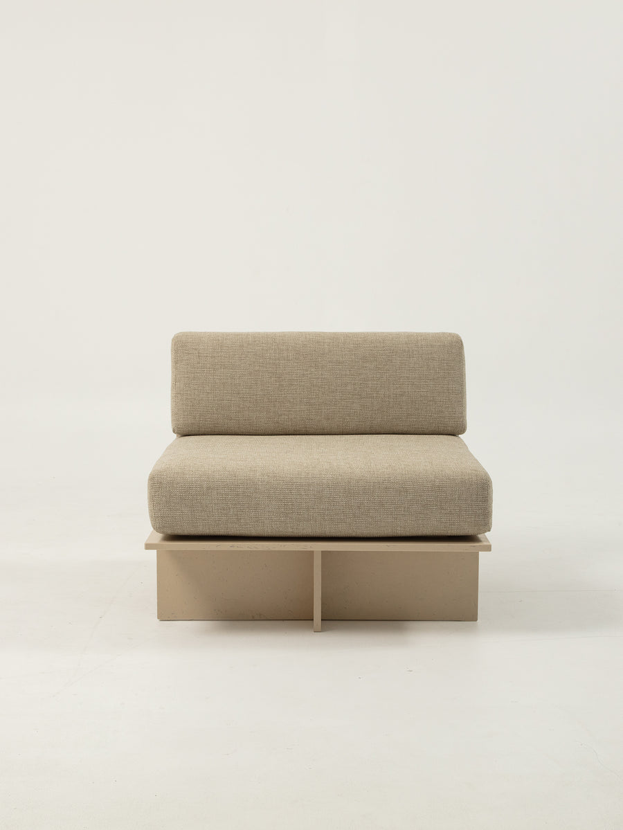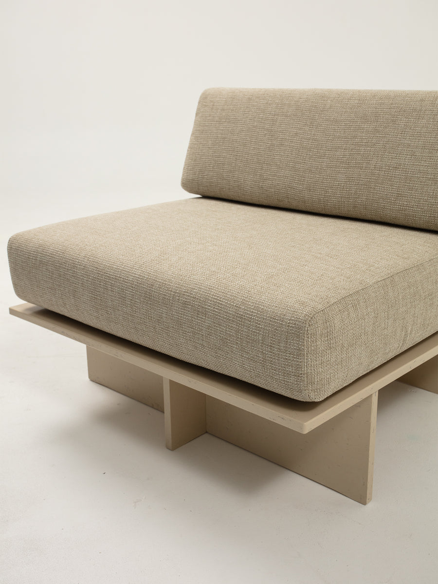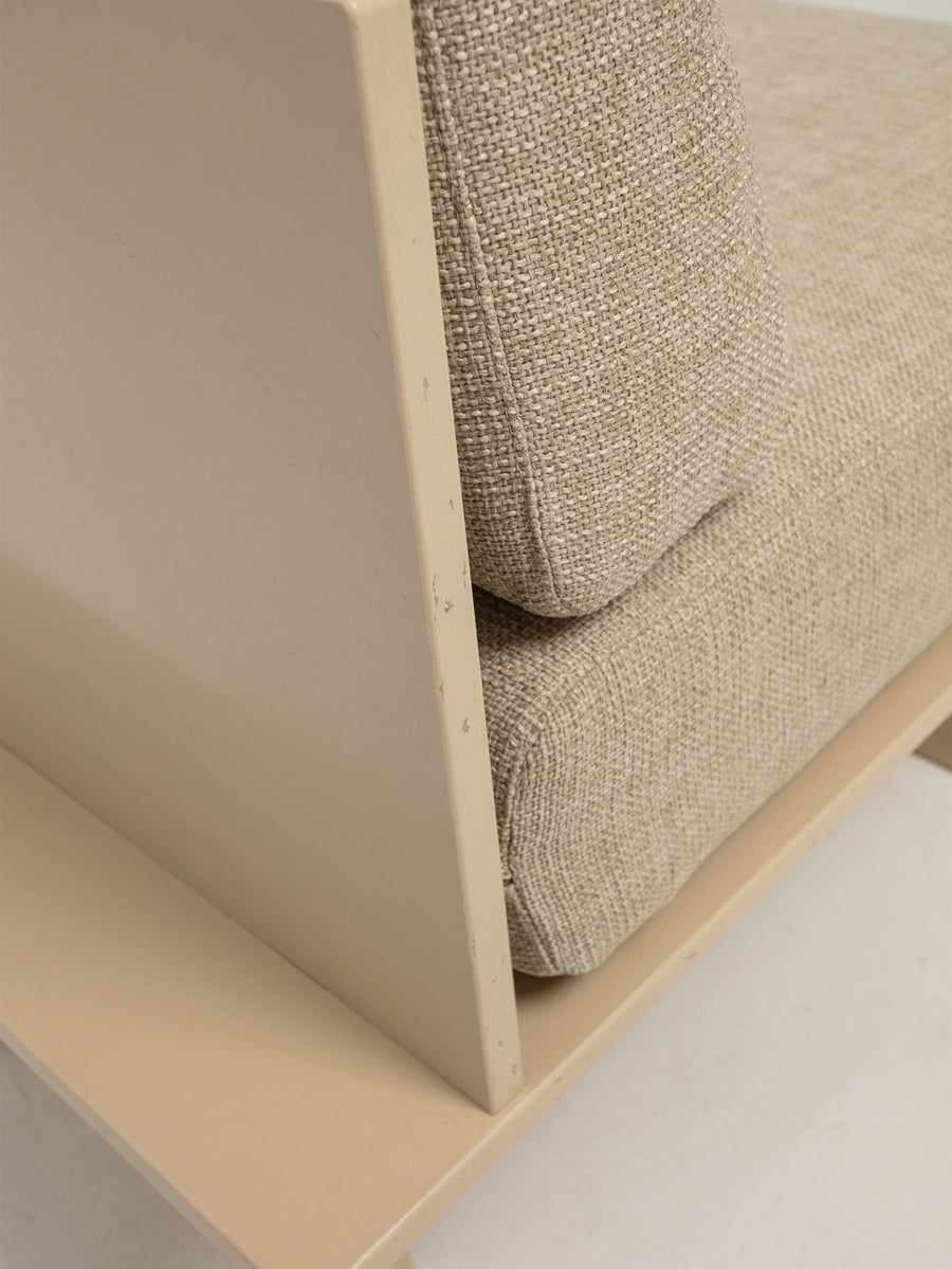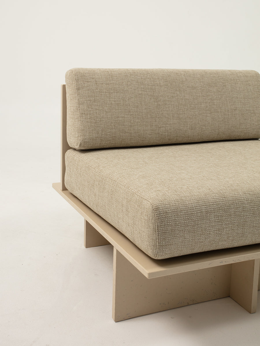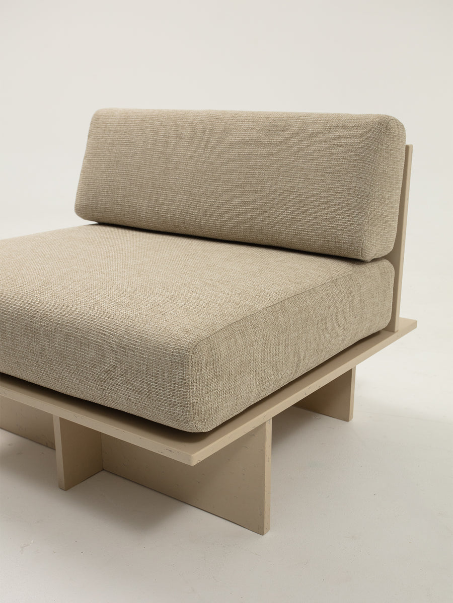 Its minimal, architectural lines are softened by the material’s natural variations, creating subtle markings that echo the look and depth of travertine. Outdoor cushions are finished in a tactile Italian fabric that feels fresh and breathable year-round. Soft yet resilient, they offer lasting comfort and include discreet straps to keep them neatly in place. A friction-fit system allows for easy, tool-free assembly, while the gently curved legs create stability across a range of outdoor surfaces.