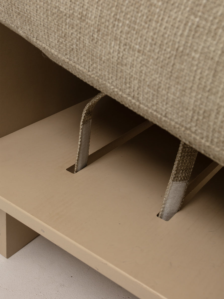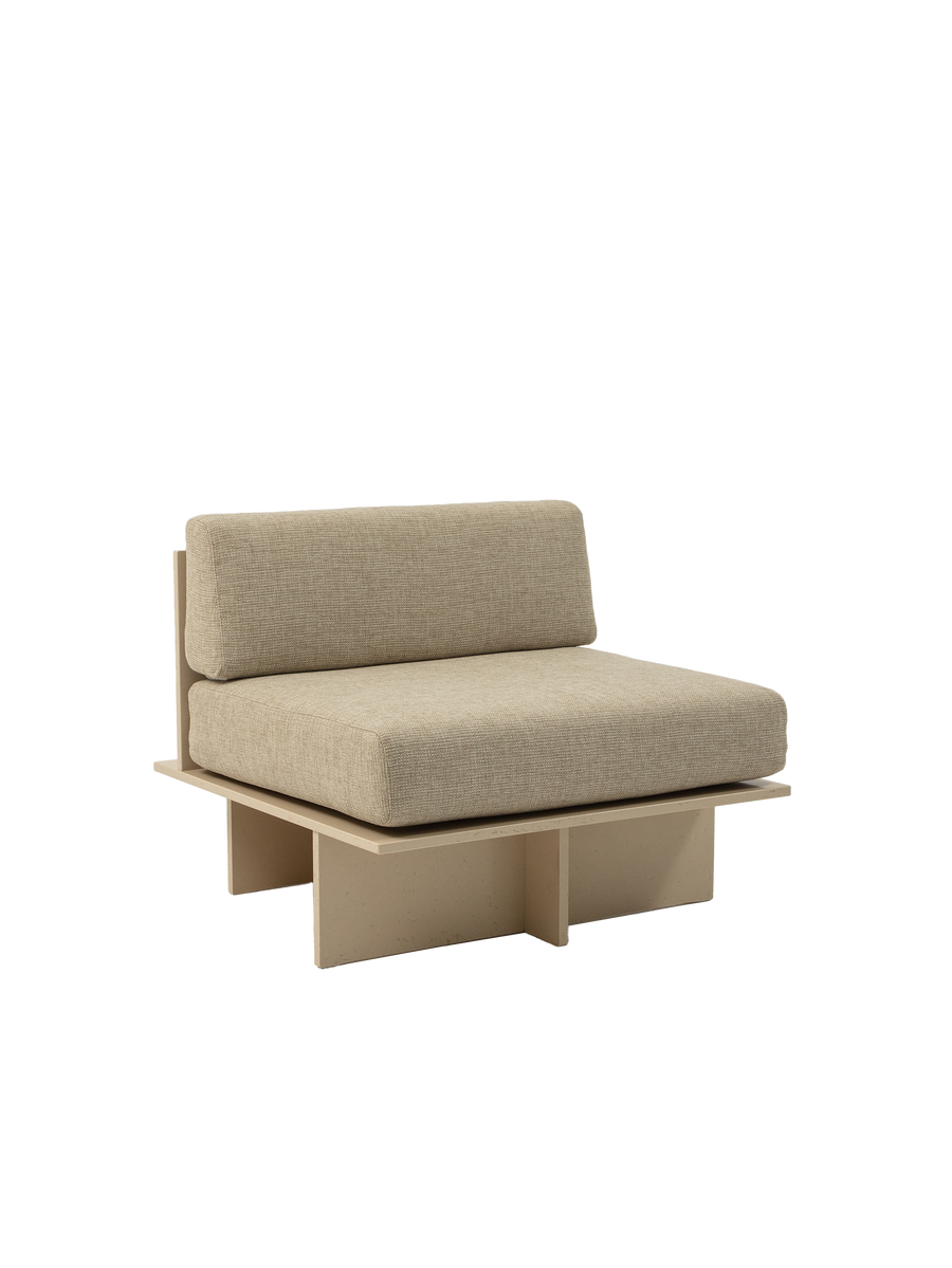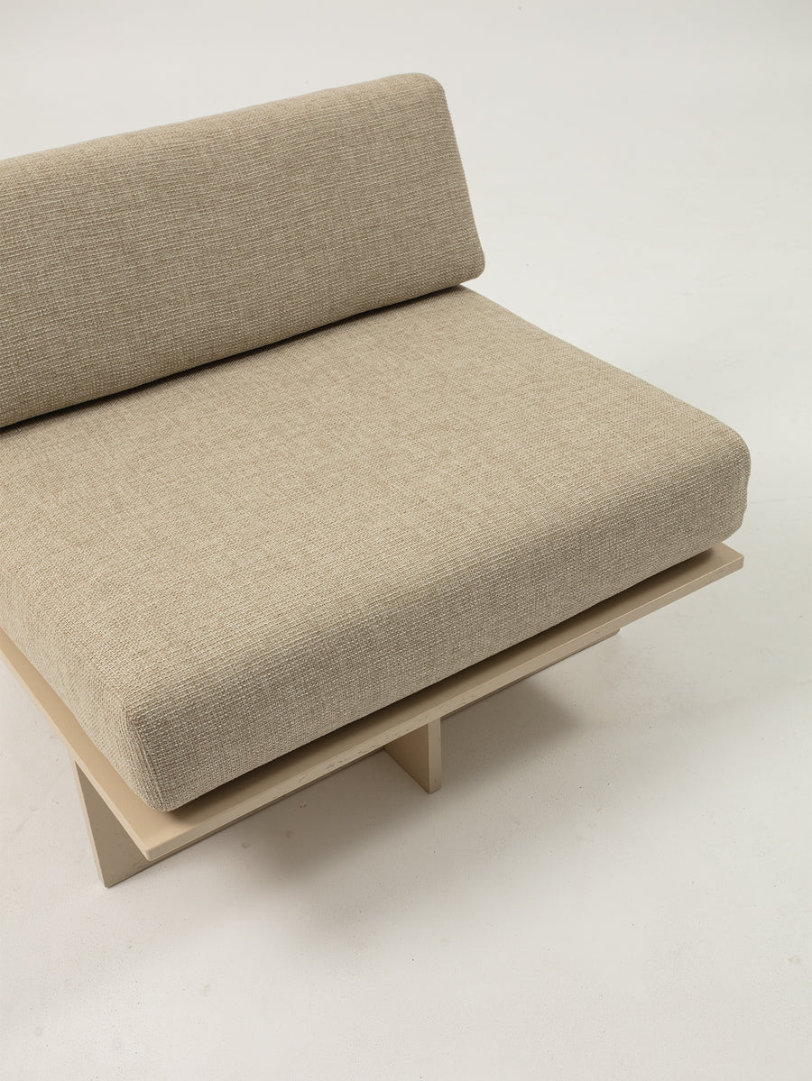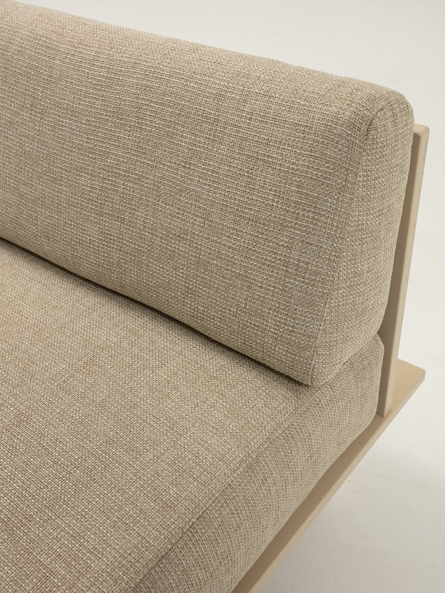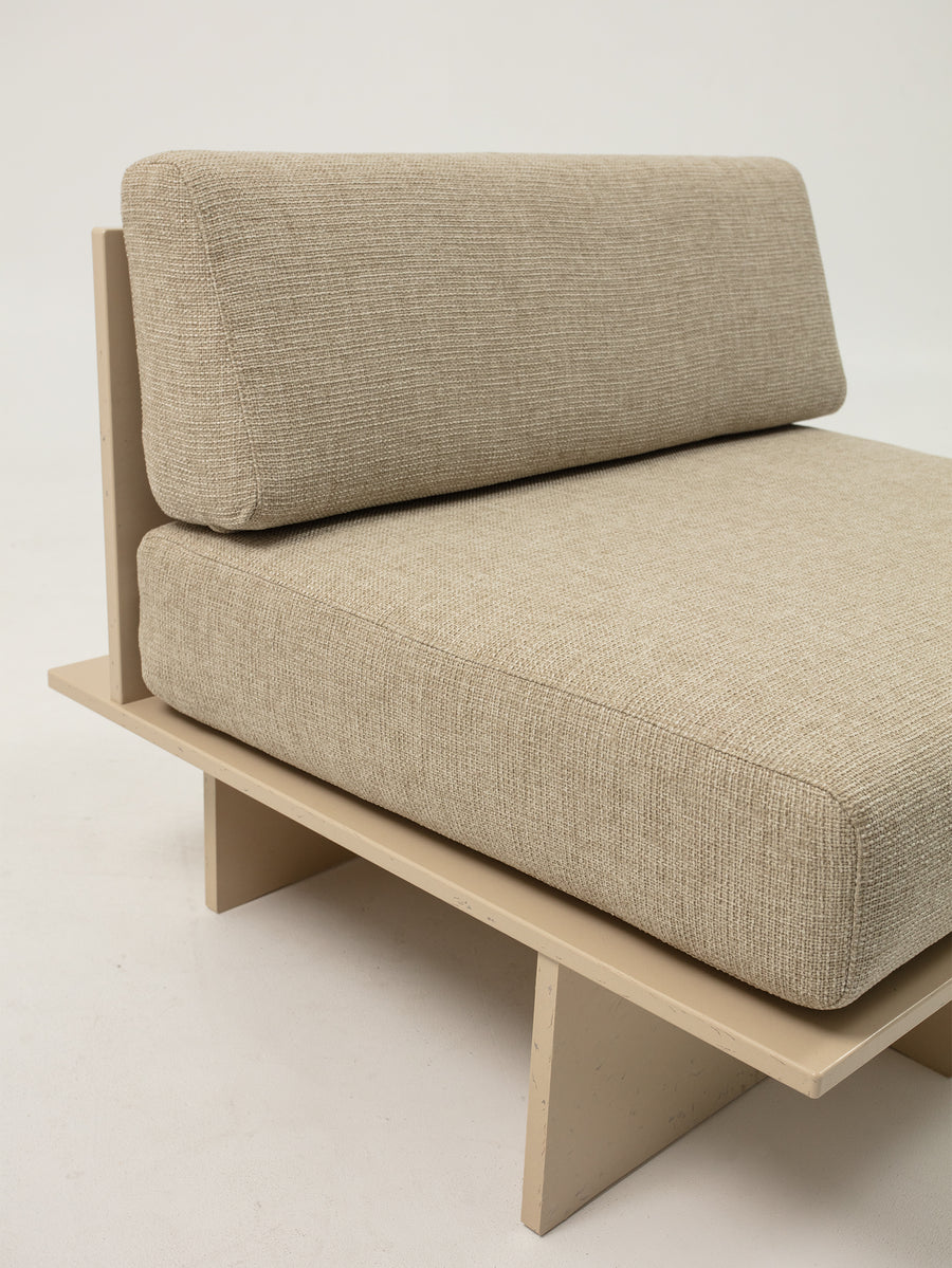 Its minimal, architectural lines are softened by the material’s natural variations, creating subtle markings that echo the look and depth of travertine. Outdoor cushions are finished in a tactile Italian fabric that feels fresh and breathable year-round. Soft yet resilient, they offer lasting comfort and include discreet straps to keep them neatly in place. A friction-fit system allows for easy, tool-free assembly, while the gently curved legs create stability across a range of outdoor surfaces.