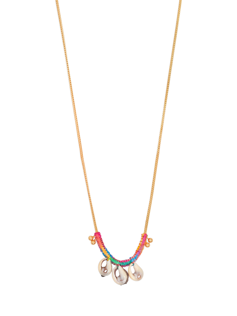 Three petite shell charms form the focal point of this necklace, suspended from a fine gold-plated chain accented with a subtle rainbow macramé detail. Designed at 41cm to sit neatly at the collarbone, it brings a refined touch of texture and colour to effortless, everyday layering.