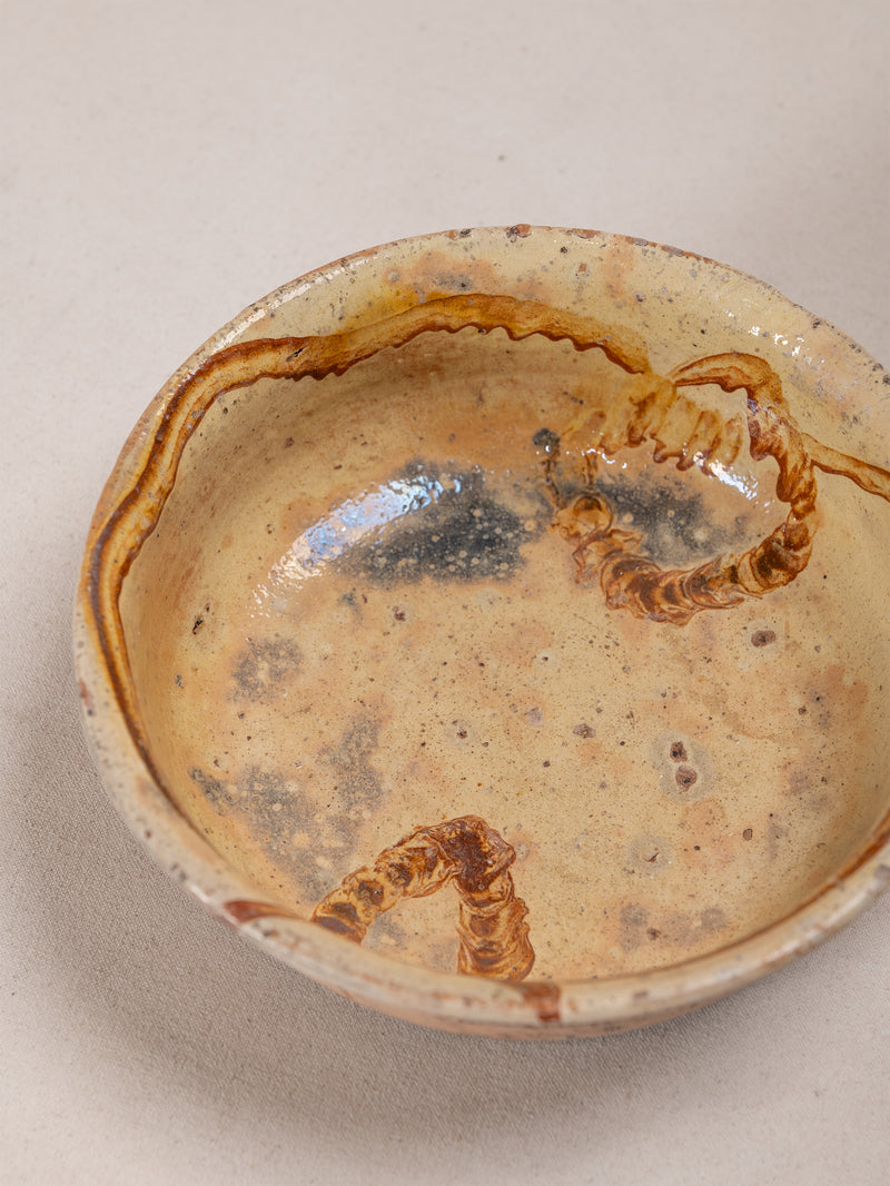 Early 20th century Vallauris culinary pottery, hand-thrown and glazed in soft earthy tones with a subtle marbled interior. Once used in French kitchens for cooking and preparation, it bears the gentle marks of age and use that speak to its history. The piece reflects the honest, functional beauty of early Vallauris ceramics.