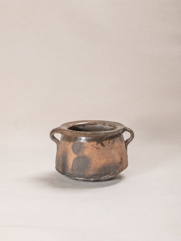 Vintage terracotta vessel finished in a rich dark glaze, its surface bearing the beautiful traces of age and handcraft. With small side handles and a softly rounded form, it reflects traditional European pottery techniques once used for everyday storage. The irregularities in tone and finish reveal its handmade character, giving it a lived-in warmth and quiet authenticity.