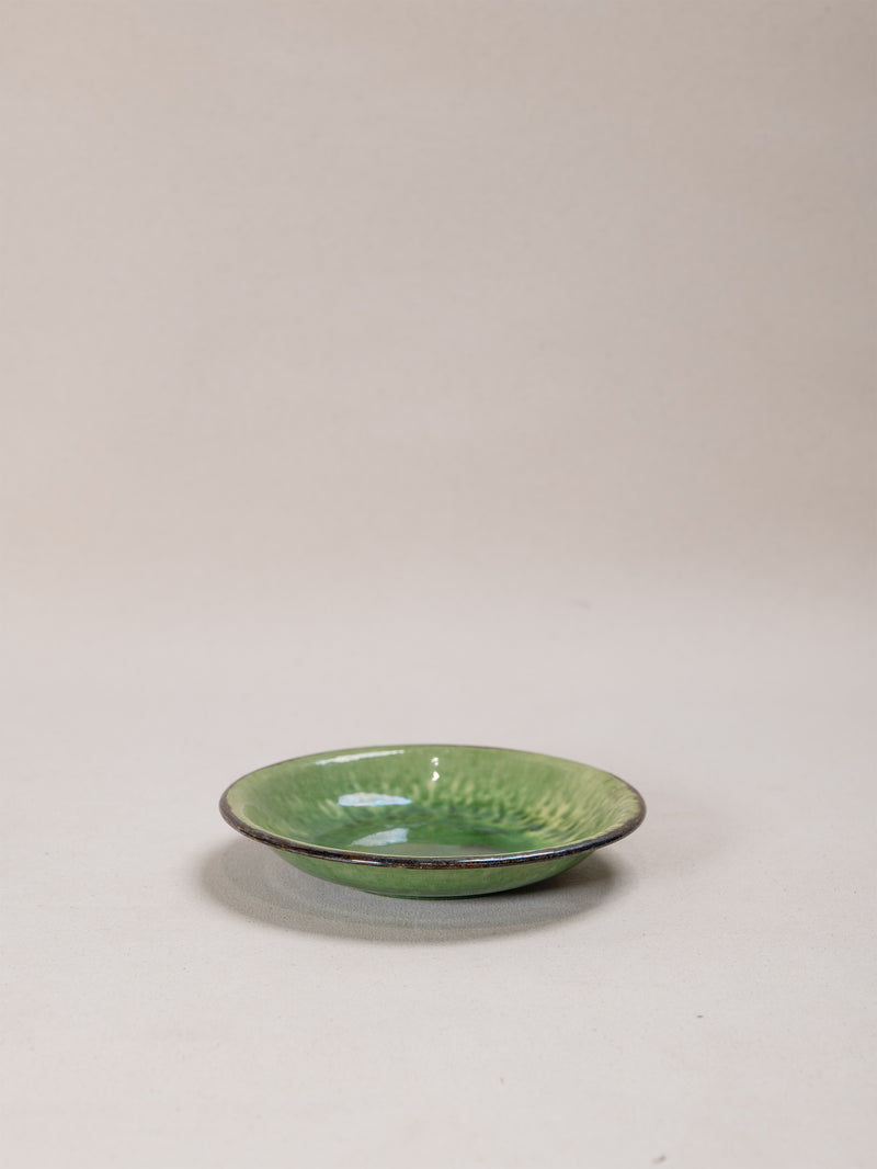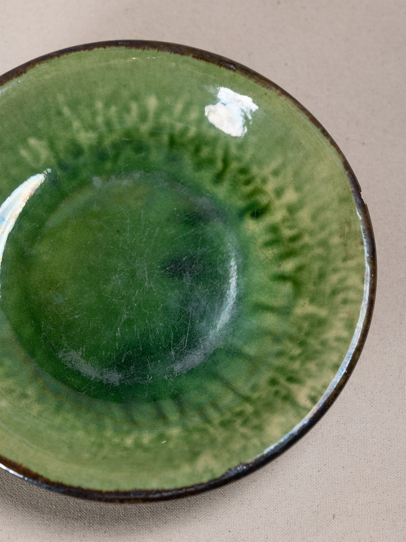 Vintage green-glazed plate featuring a rich, variegated surface that shifts from deep emerald to moss tones. The glossy finish highlights its handcrafted texture, while subtle imperfections speak to its age and authenticity. A beautiful accent for serving, styling, or simply displaying as an object of quiet charm.