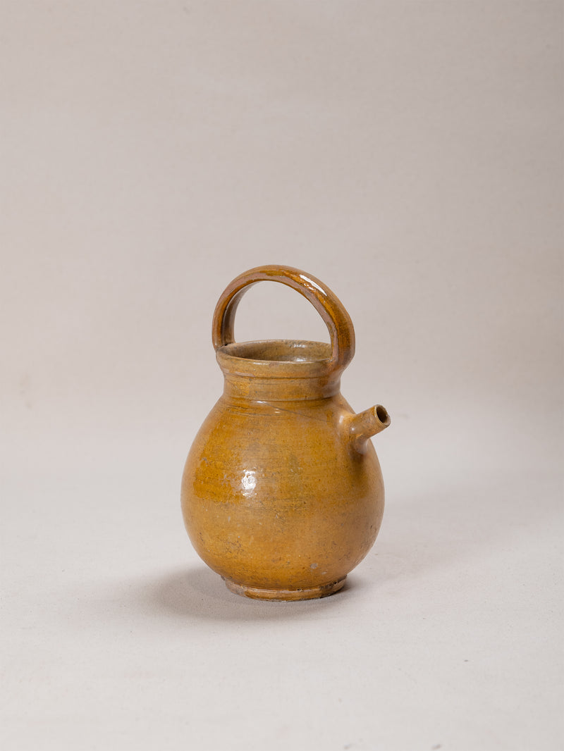 Vintage French terracotta pitcher with a warm golden glaze and a curved handle. Once used in the south of France for pouring water or wine, its form reflects traditional Provençal craftsmanship — both functional and sculptural. The softly aged surface and irregular glaze give it a timeless patina, making it a beautiful decorative accent with rustic charm.