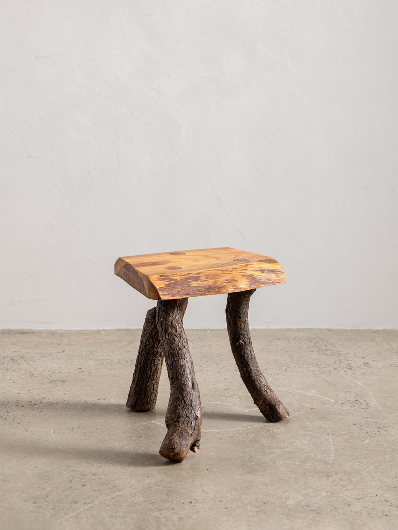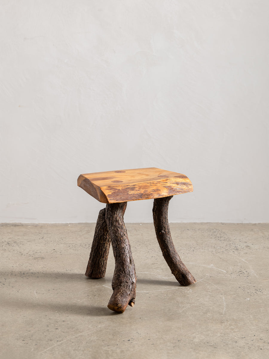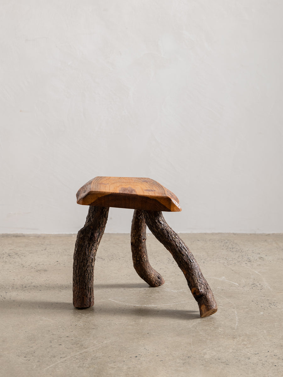 Raw and grounded, this Italian wooden stool embraces the irregular beauty of nature. Its seat is hewn from a solid block of timber, while the legs retain the wild, organic form of branches—twisting and tapering with a sculptural ease.