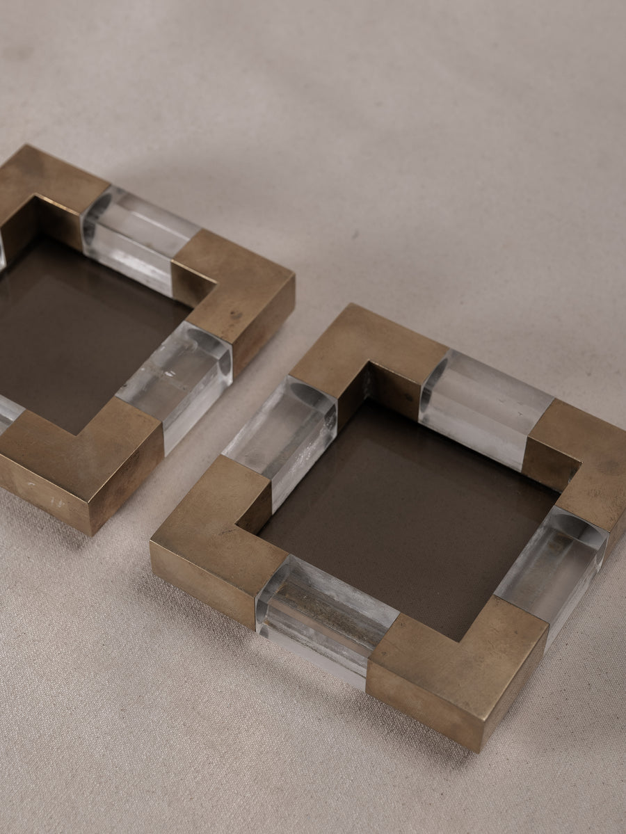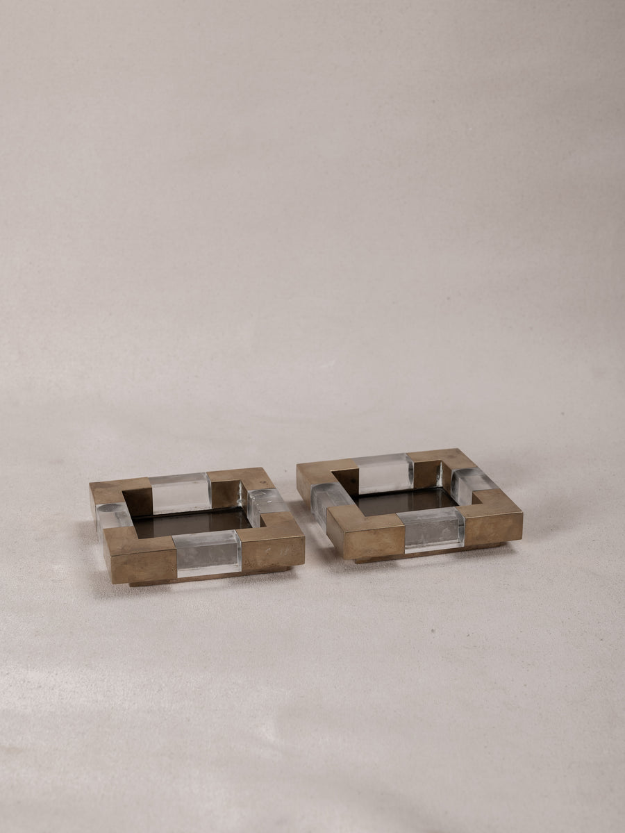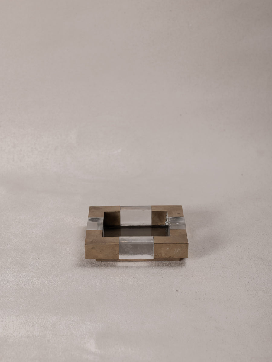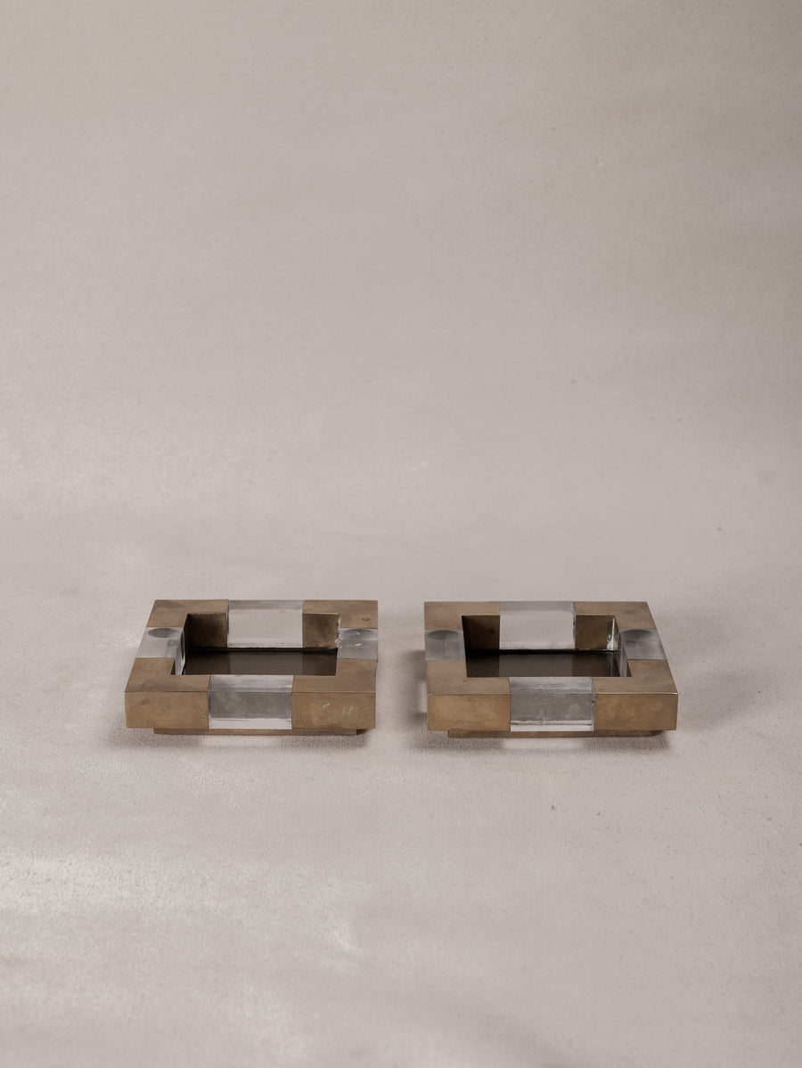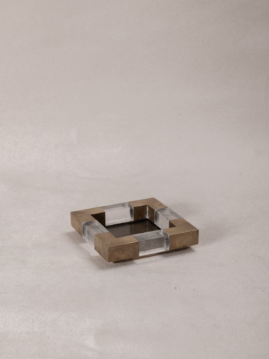 With a solid glass base encased in a geometric frame of brushed brass and clear plexiglass, these square dishes are a bold expression of mid-century Italian design. Originally conceived as vide-poches or ashtrays, their refined materiality and sculptural form elevate everyday rituals.