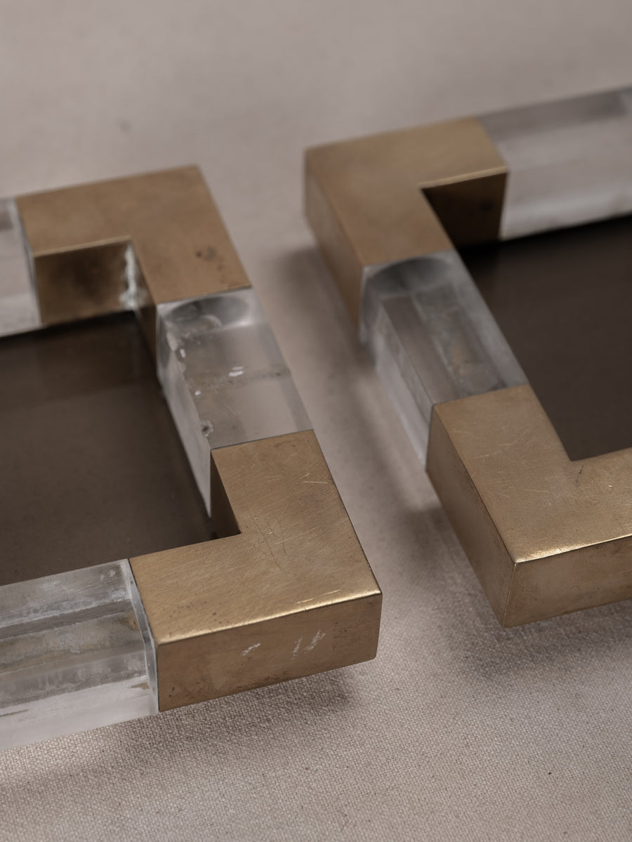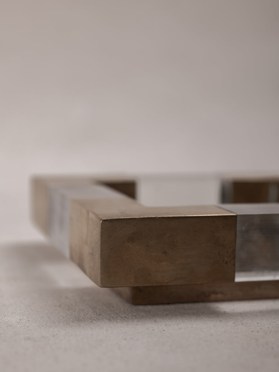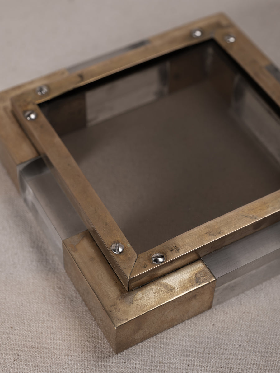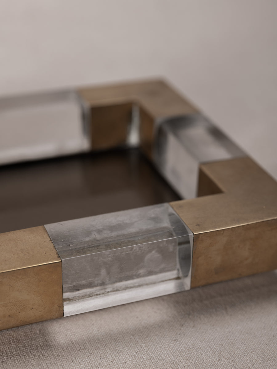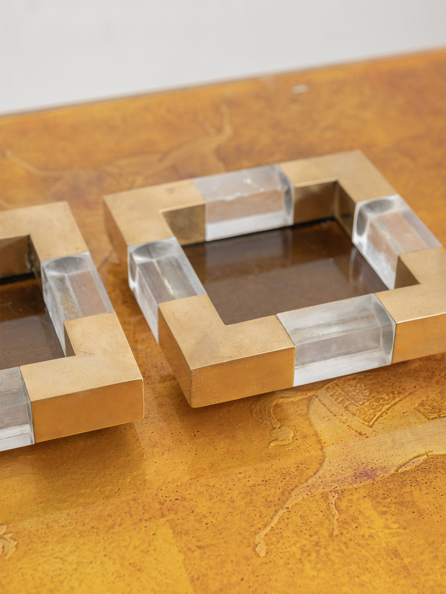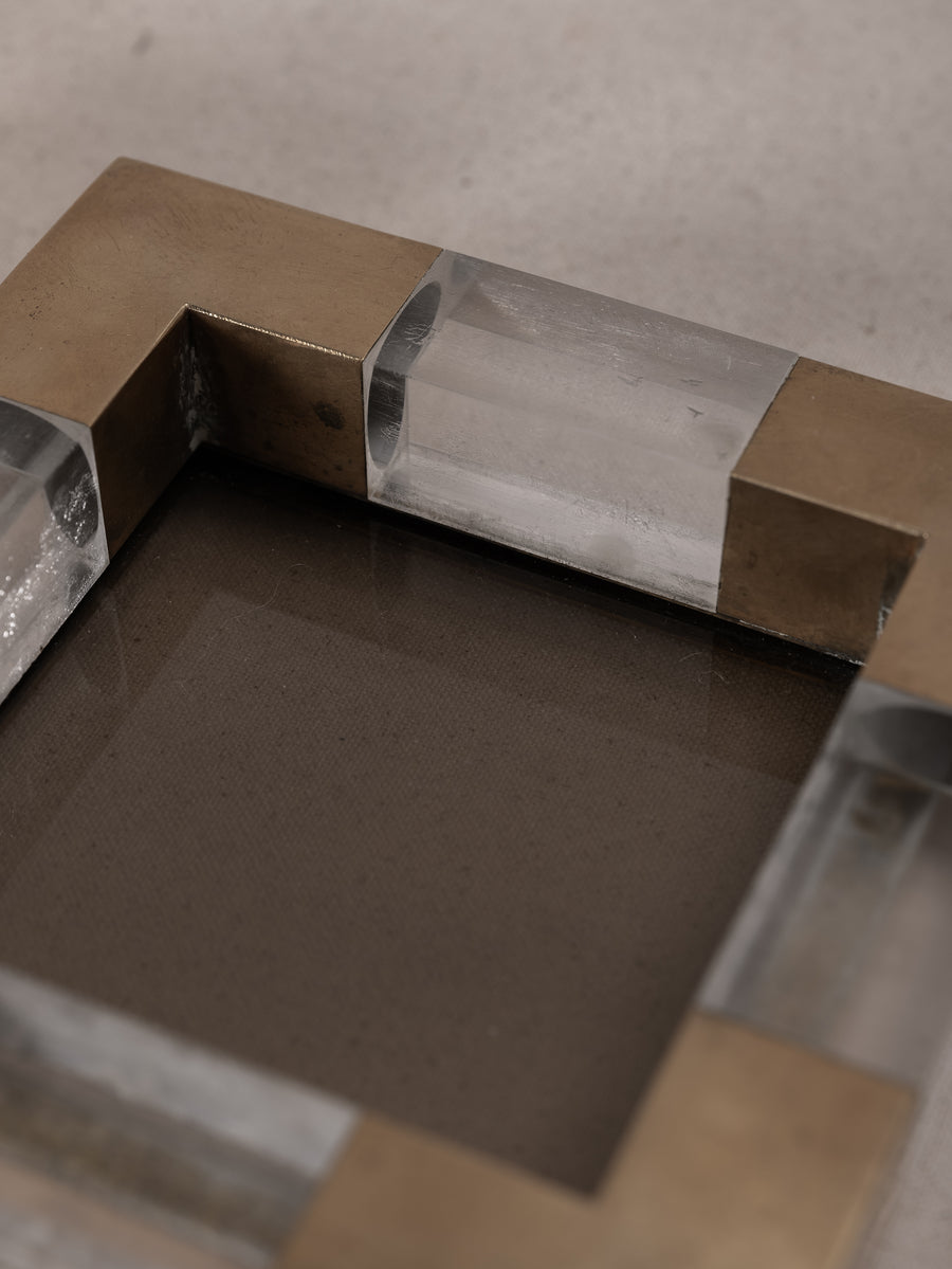 With a solid glass base encased in a geometric frame of brushed brass and clear plexiglass, these square dishes are a bold expression of mid-century Italian design. Originally conceived as vide-poches or ashtrays, their refined materiality and sculptural form elevate everyday rituals.