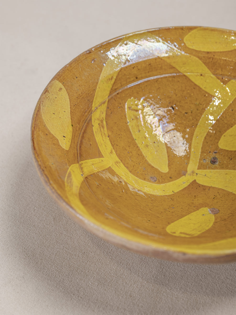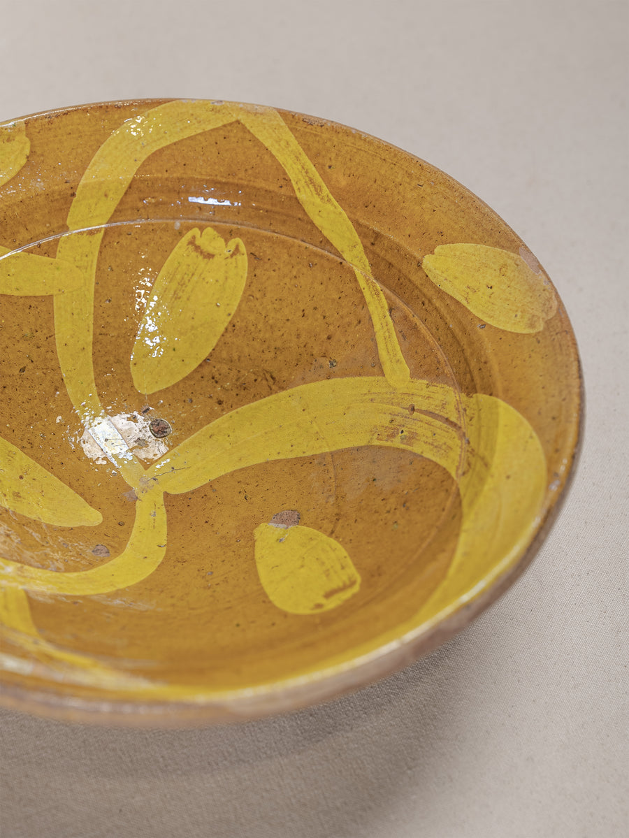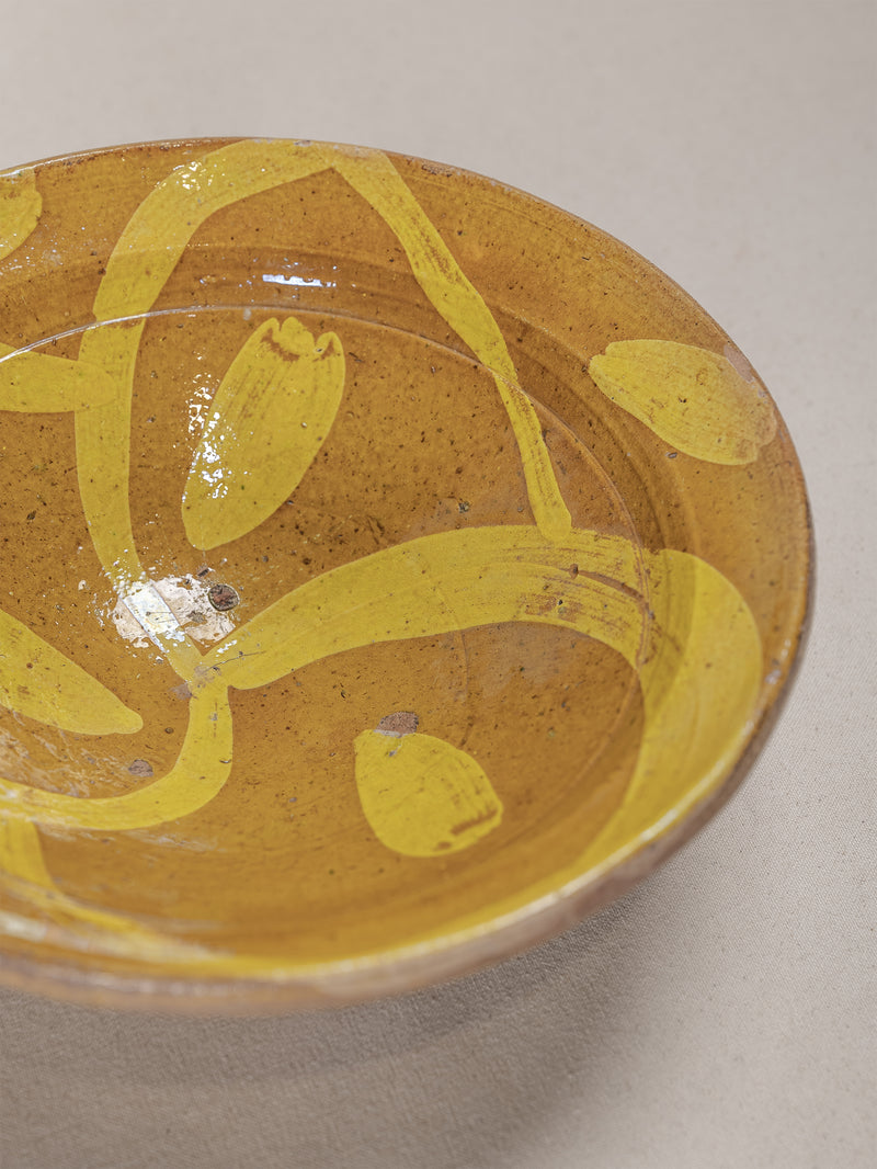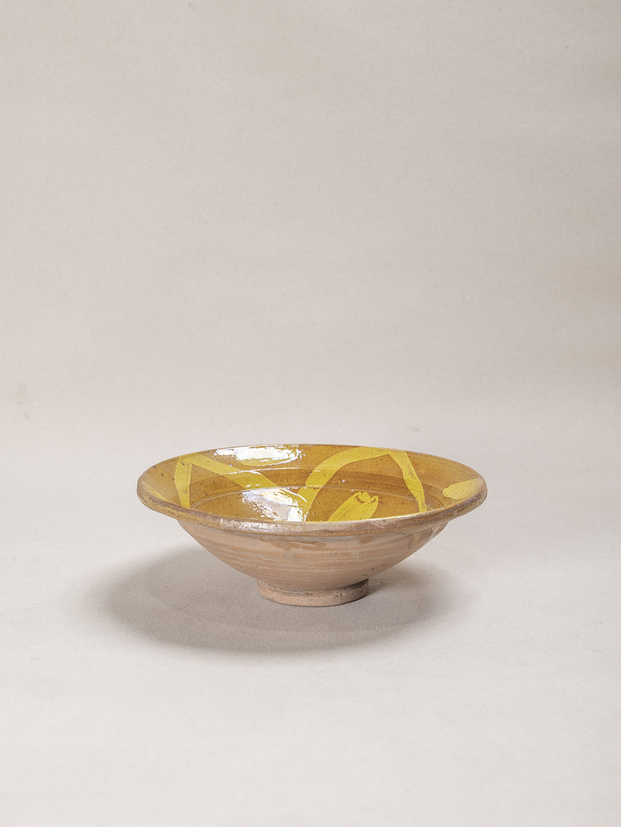 A hand-thrown clay bowl featuring a vibrant yellow slip glaze painted in sweeping, expressive forms. The natural earthen tones beneath the glaze reveal the raw beauty of the local clay, while the time-softened surface reflects generations of use and care. Both functional and decorative, this piece carries the quiet authenticity of traditional Hunza craftsmanship.