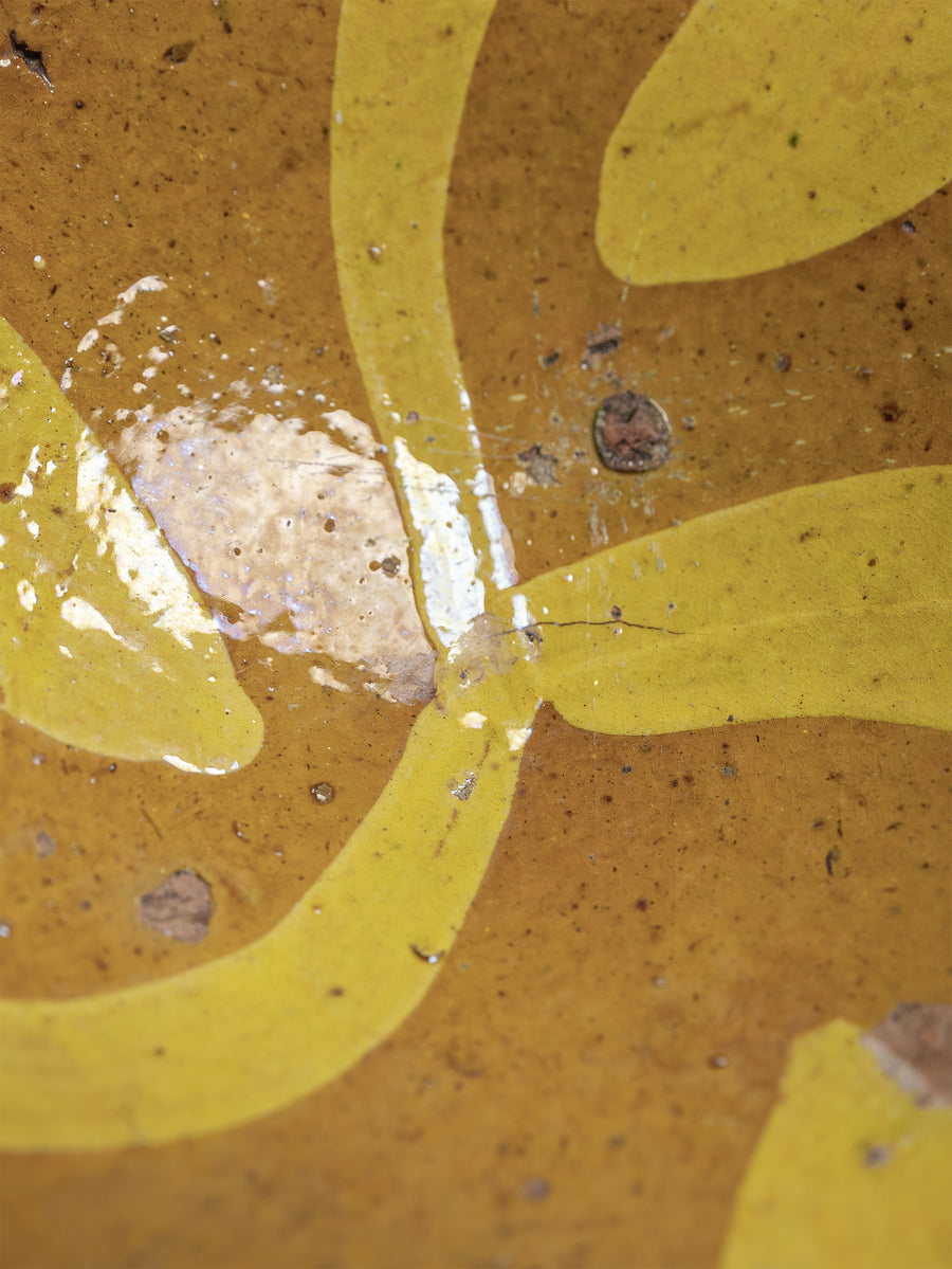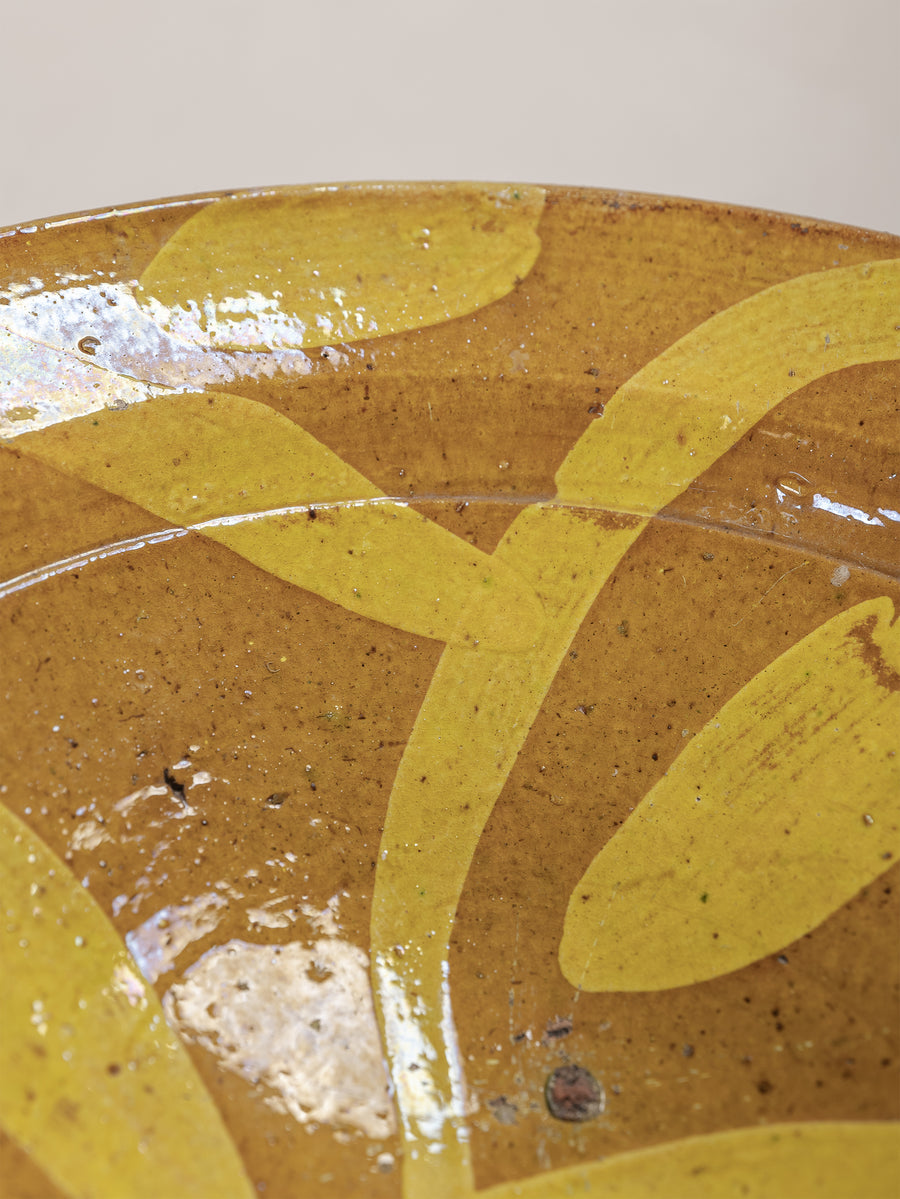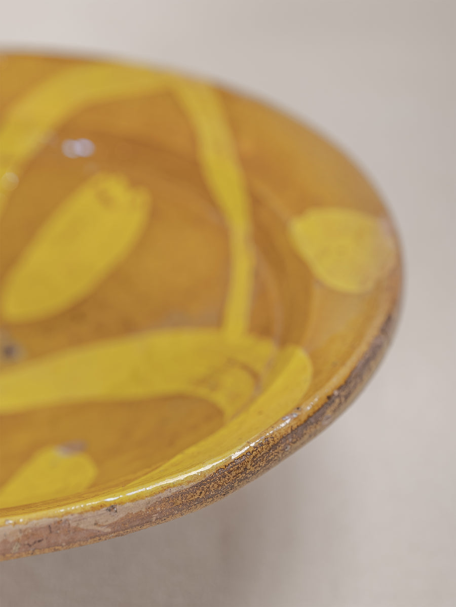A hand-thrown clay bowl featuring a vibrant yellow slip glaze painted in sweeping, expressive forms. The natural earthen tones beneath the glaze reveal the raw beauty of the local clay, while the time-softened surface reflects generations of use and care. Both functional and decorative, this piece carries the quiet authenticity of traditional Hunza craftsmanship.