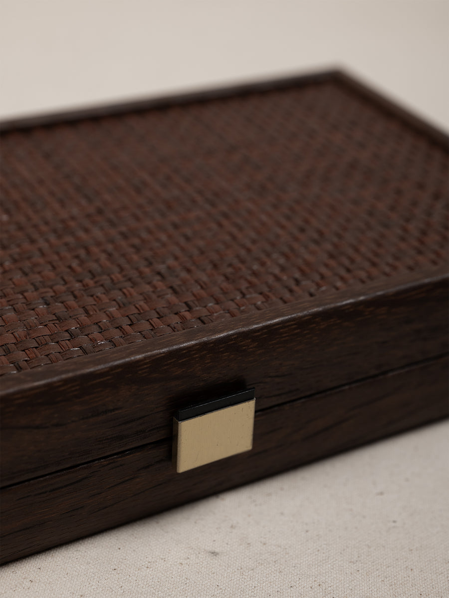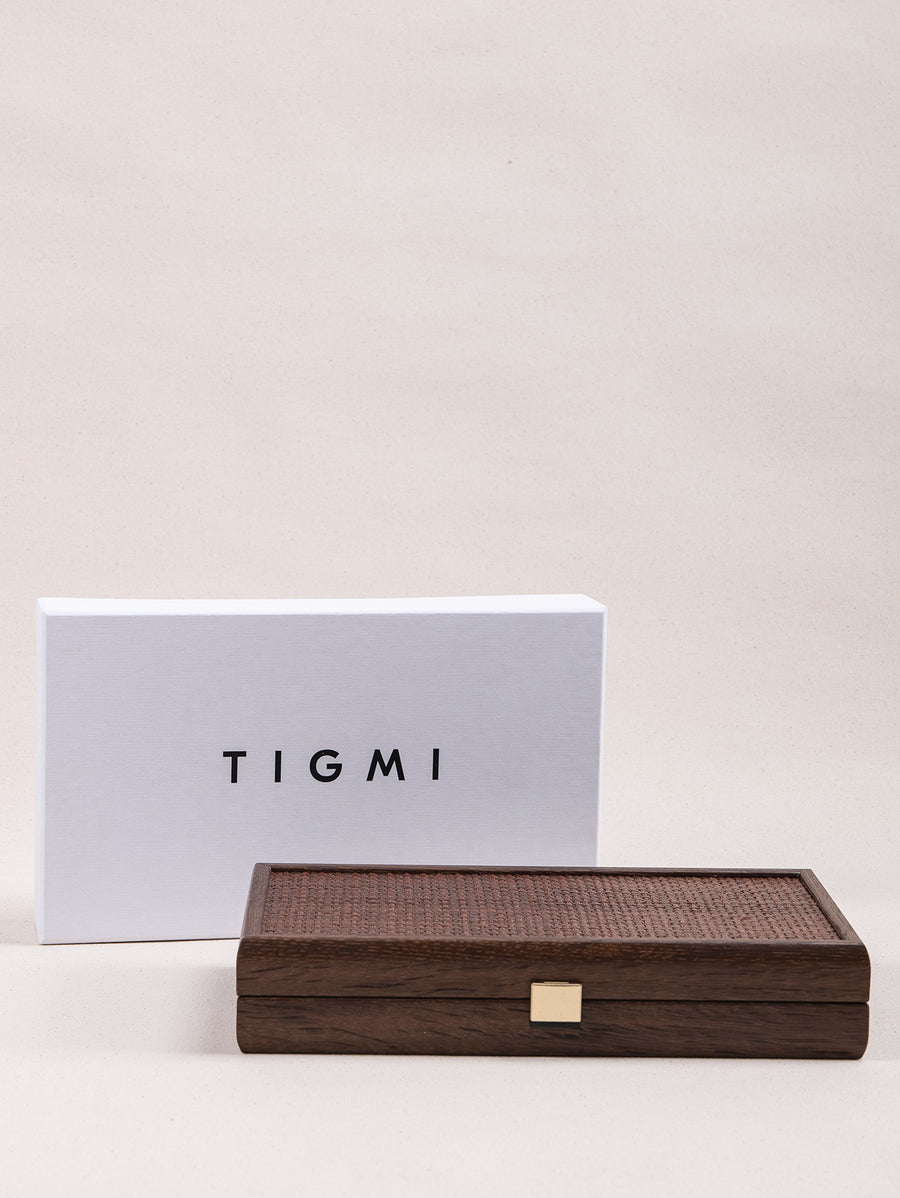 Our Tigmi Travel Backgammon Set is hand crafted from walnut, with a woven straw face applied using the art of marquetry - an art that flourished in Europe in the 16th century. It is finished with a beautiful brass clasp.