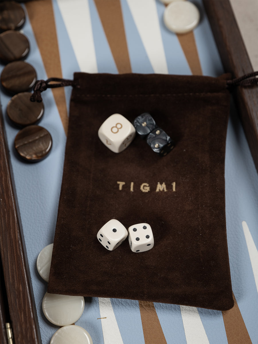 The interior of the board is lined with a refined, elegant eco-leather, known for its noise reduction and durability. The pieces are crafted from mother of pearl and the set includes a Tigmi embroidered bag in velvet chocolate to keep the pieces together when not in use.