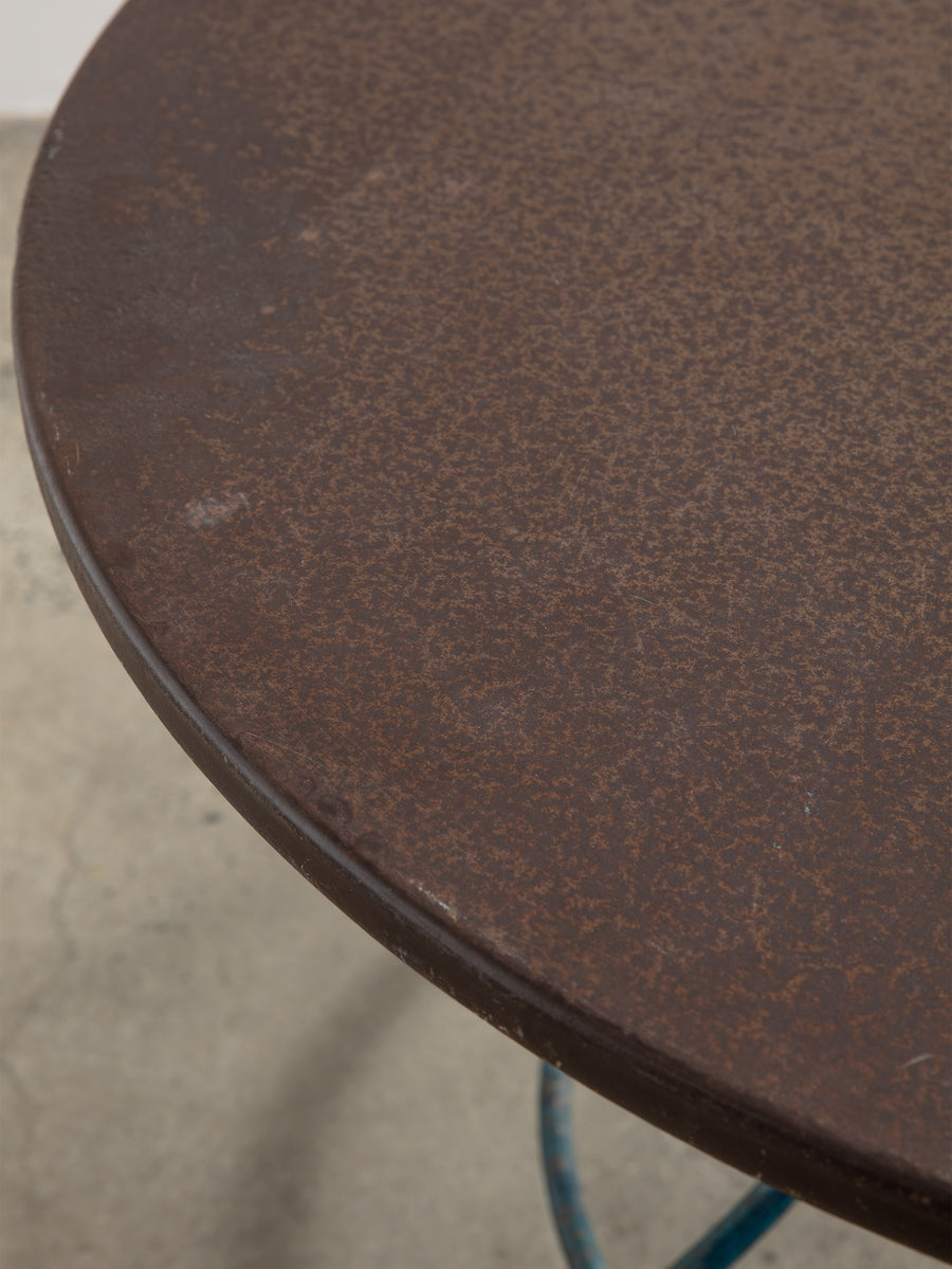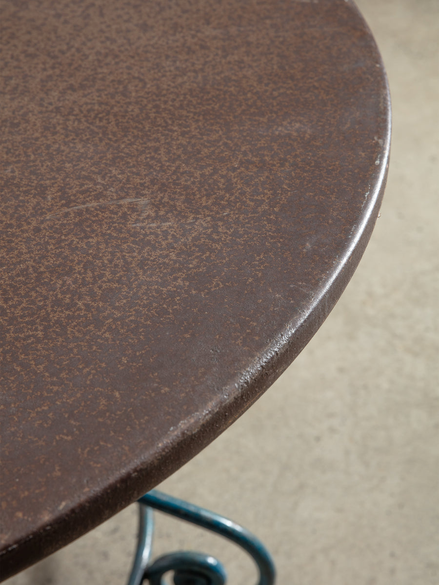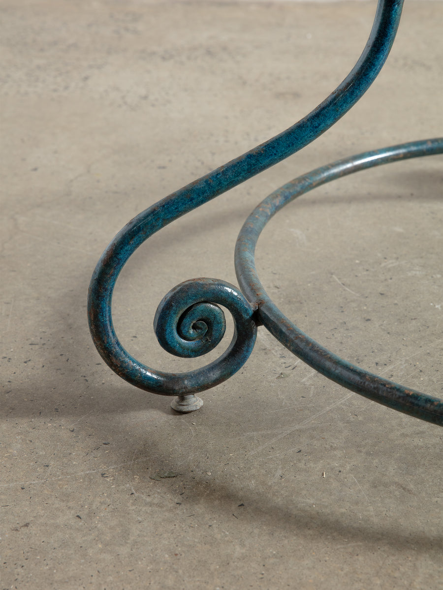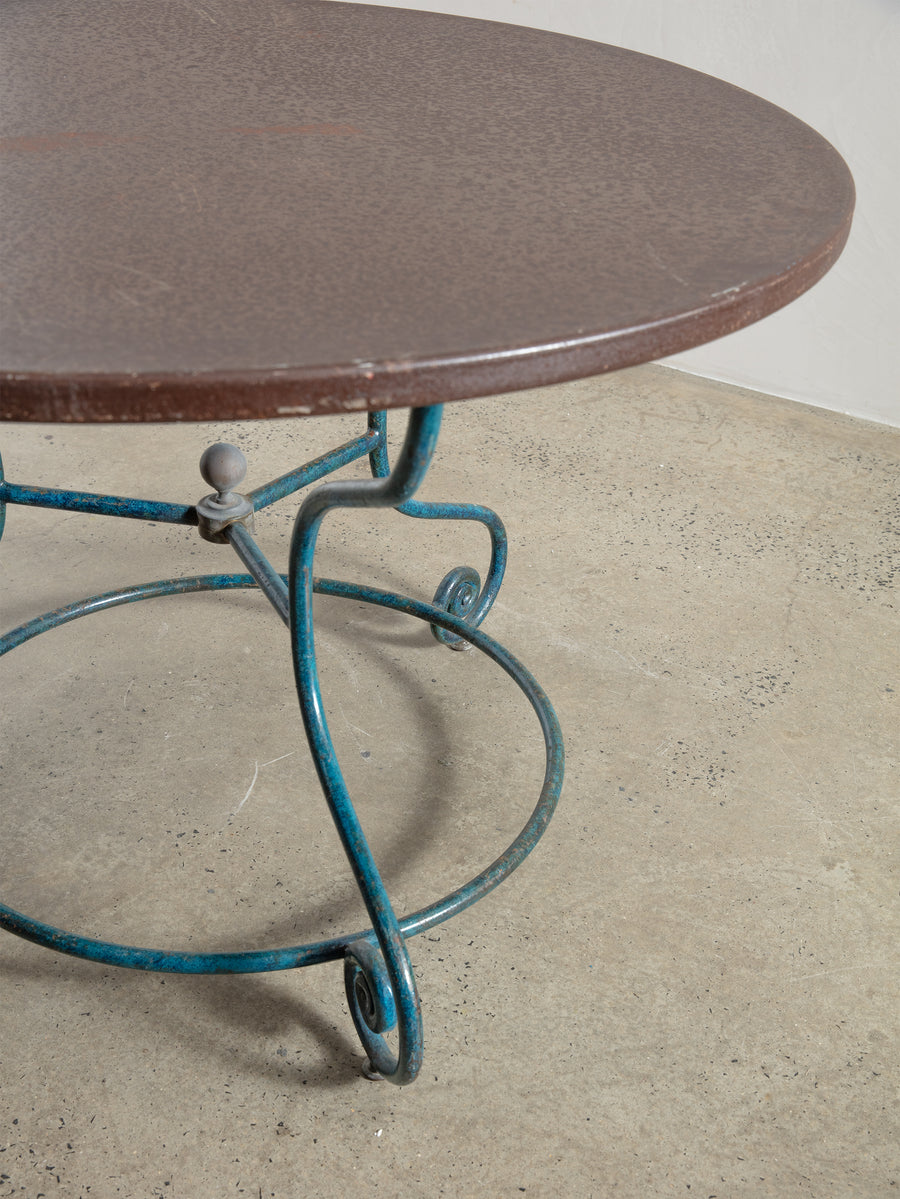 European garden style comes through in this 1950s round metal table, where a richly toned top meets a curving wrought iron base. The sculptural legs, finished in a time-worn blue, end in delicate scrolls that lend a sense of movement and ease. Balanced and enduring, it’s a piece that brings character to both outdoor and indoor settings, celebrated for its vintage patina and mid-century charm. Due to it's vintage nature, the table carries unique marks of age that speak to its decades of use.