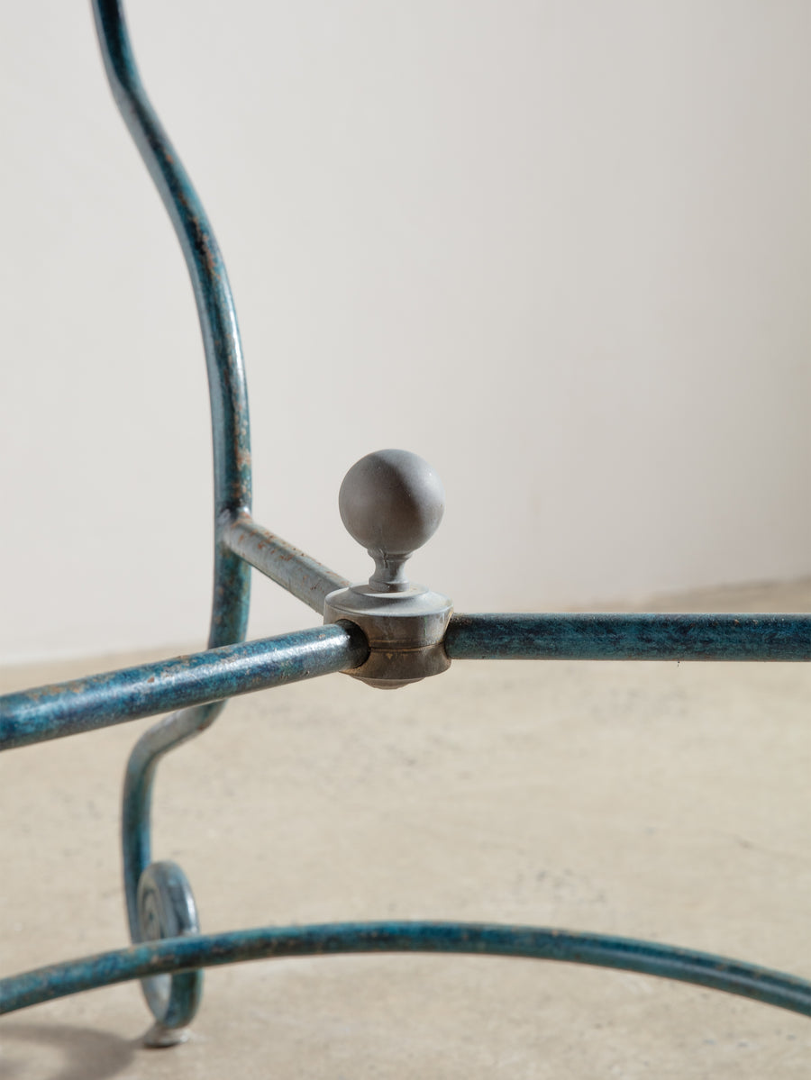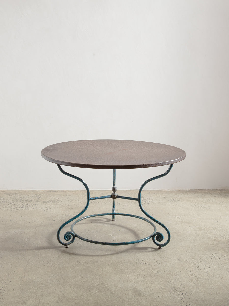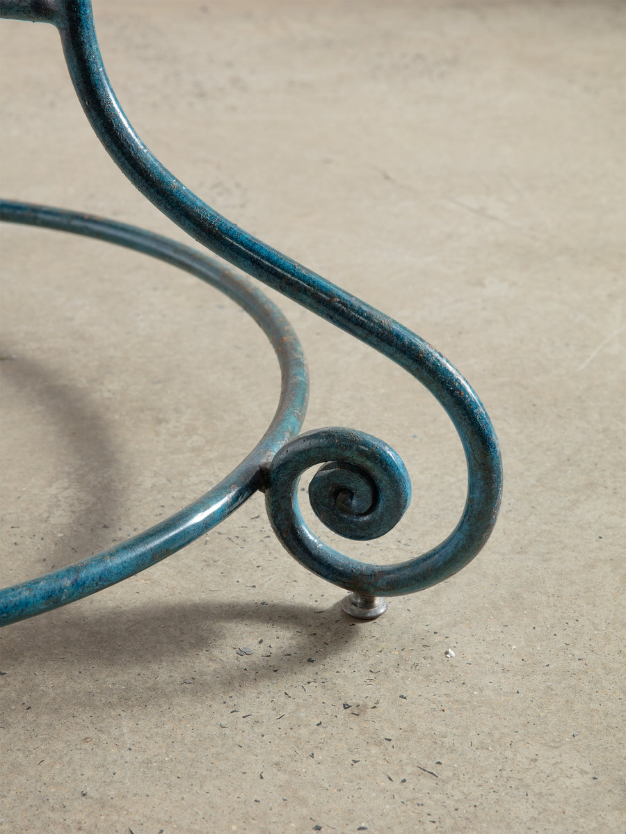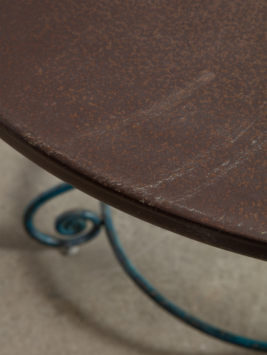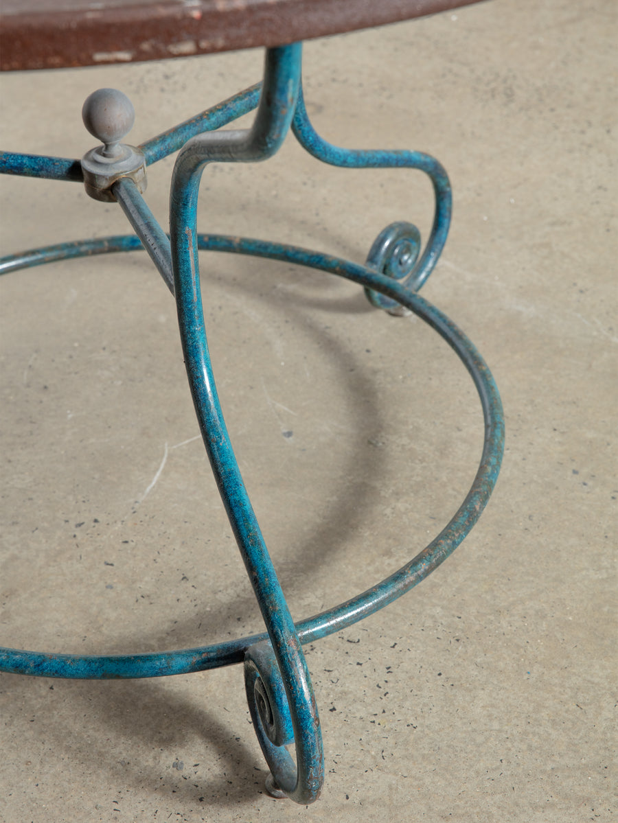 European garden style comes through in this 1950s round metal table, where a richly toned top meets a curving wrought iron base. The sculptural legs, finished in a time-worn blue, end in delicate scrolls that lend a sense of movement and ease. Balanced and enduring, it’s a piece that brings character to both outdoor and indoor settings, celebrated for its vintage patina and mid-century charm. Due to it's vintage nature, the table carries unique marks of age that speak to its decades of use.