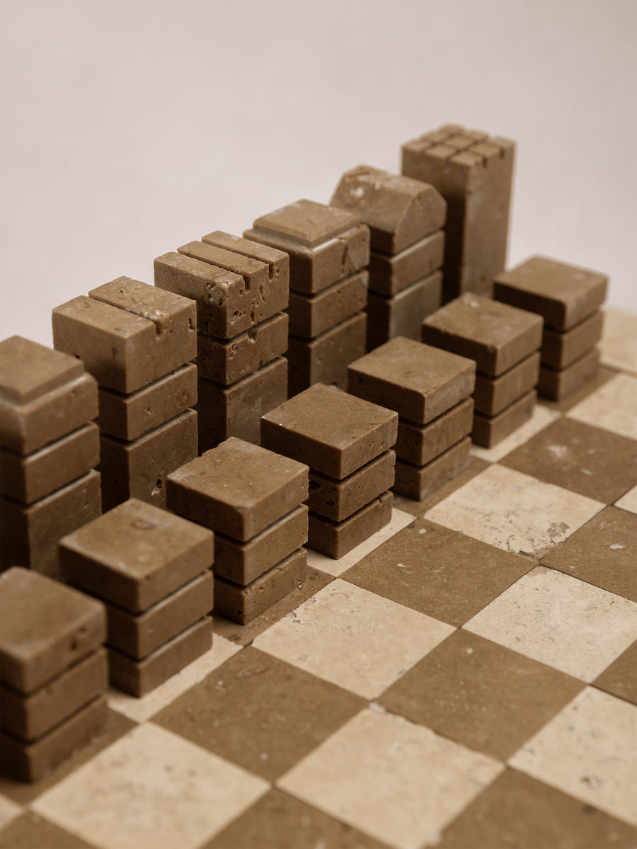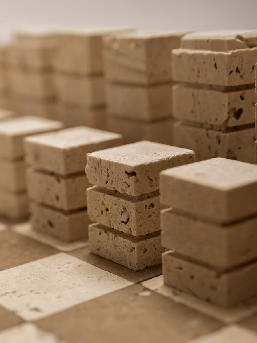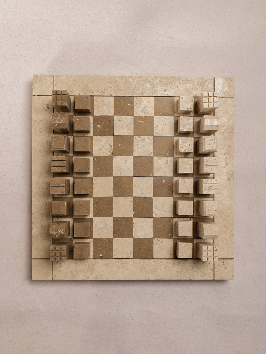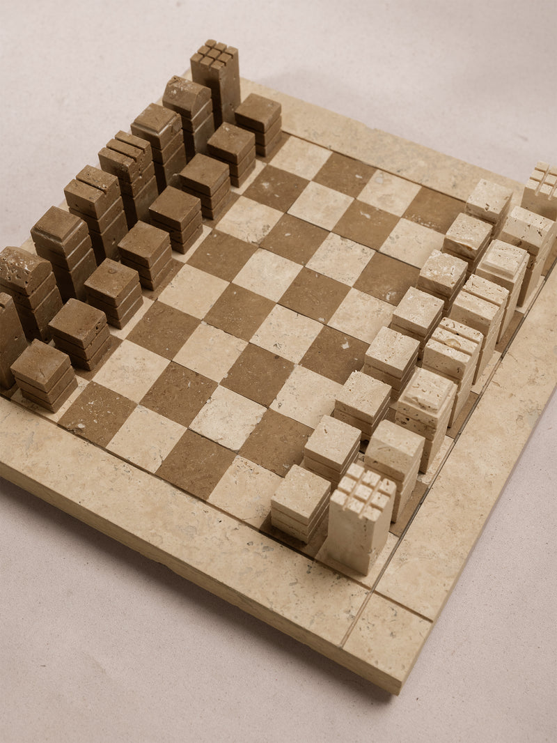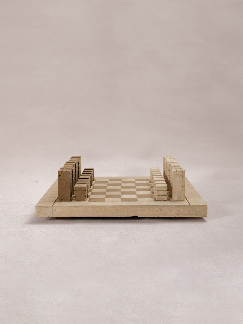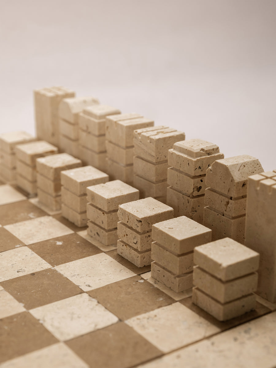 Handcrafted in Byron Bay, the Tigmi Travertine Chess set is inspired by 1970s Modernist design - a timeless, heirloom piece intended to entertain across generations