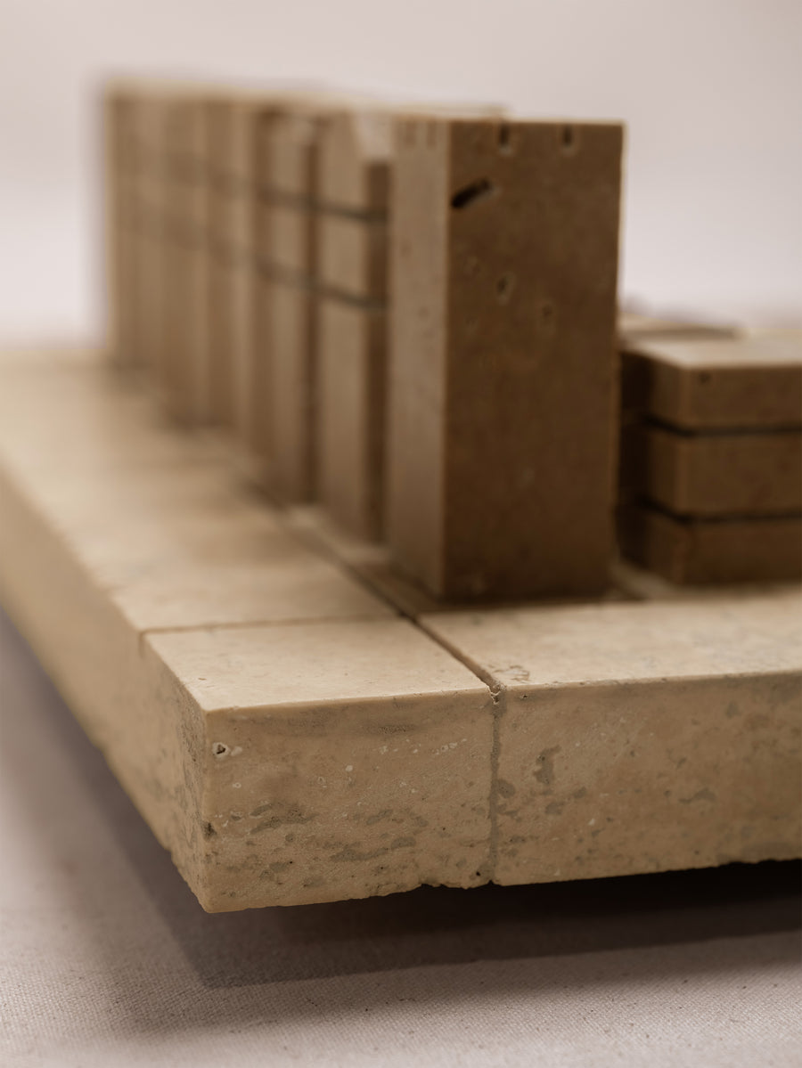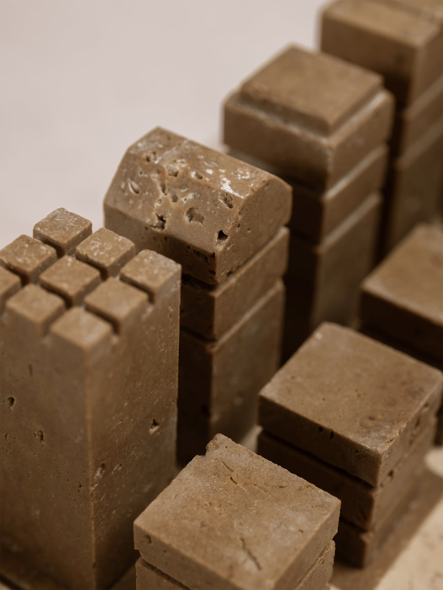 Each part of the material has been hand carved from Italian Cacao and Natural Travertine.